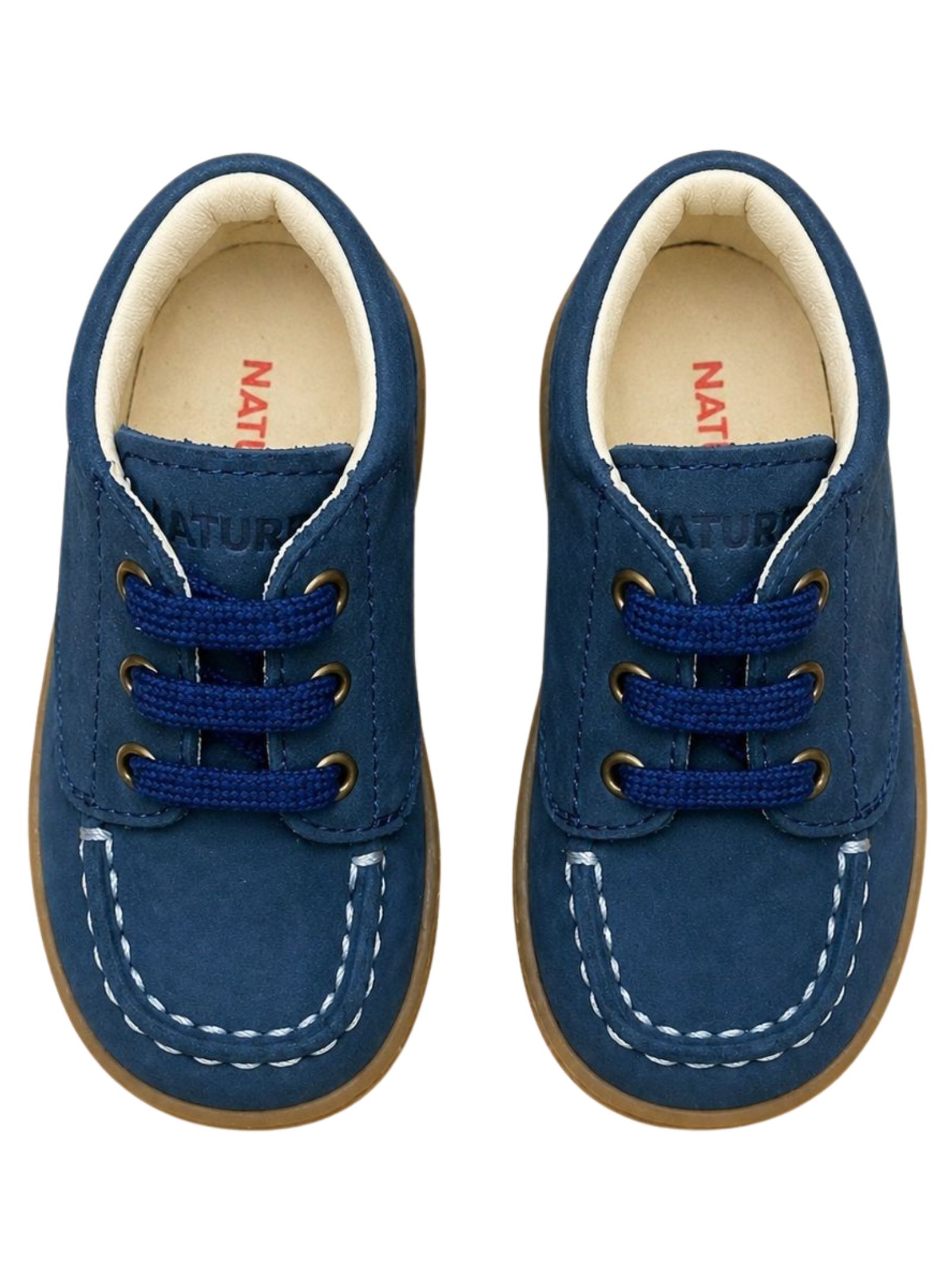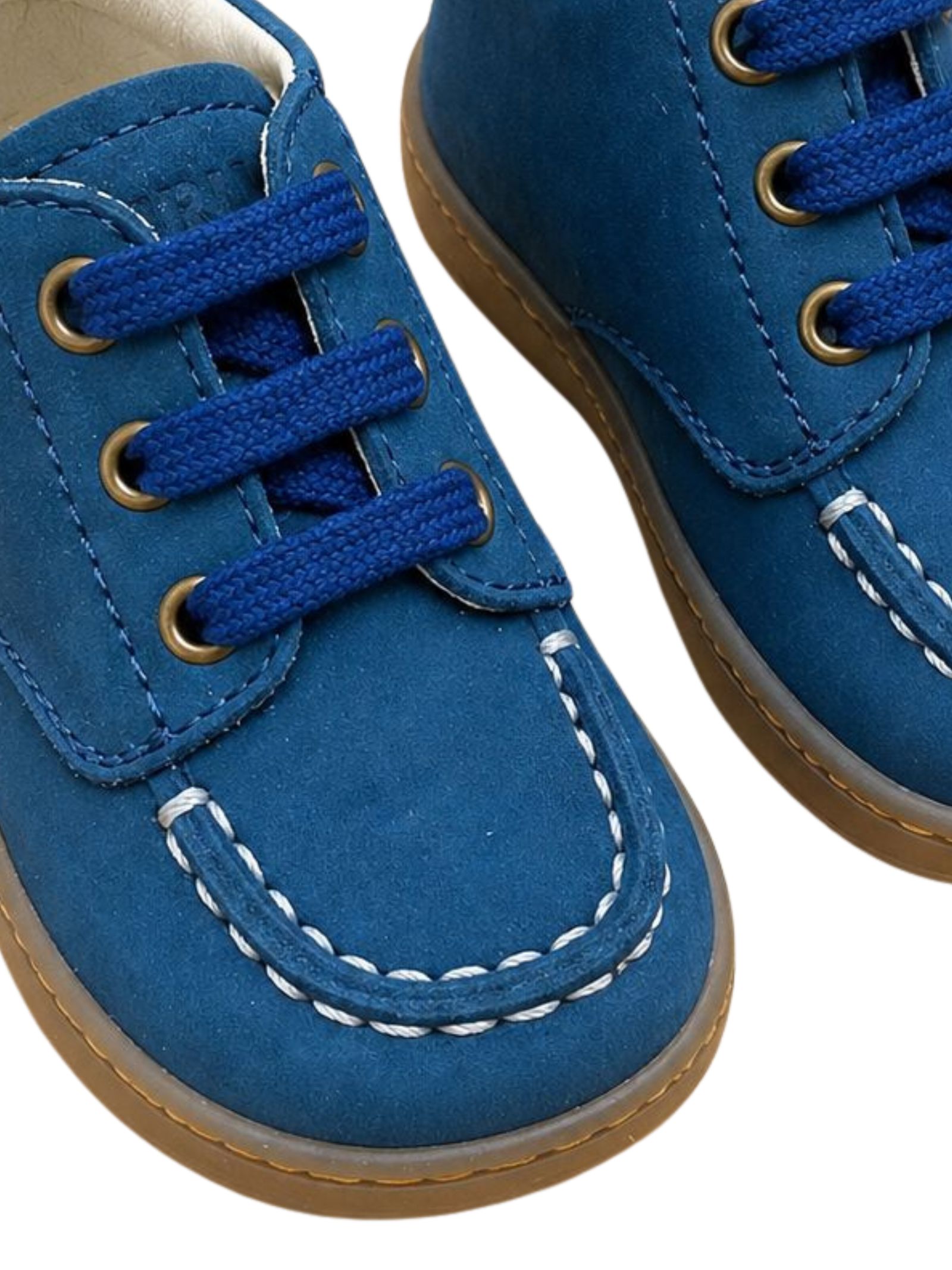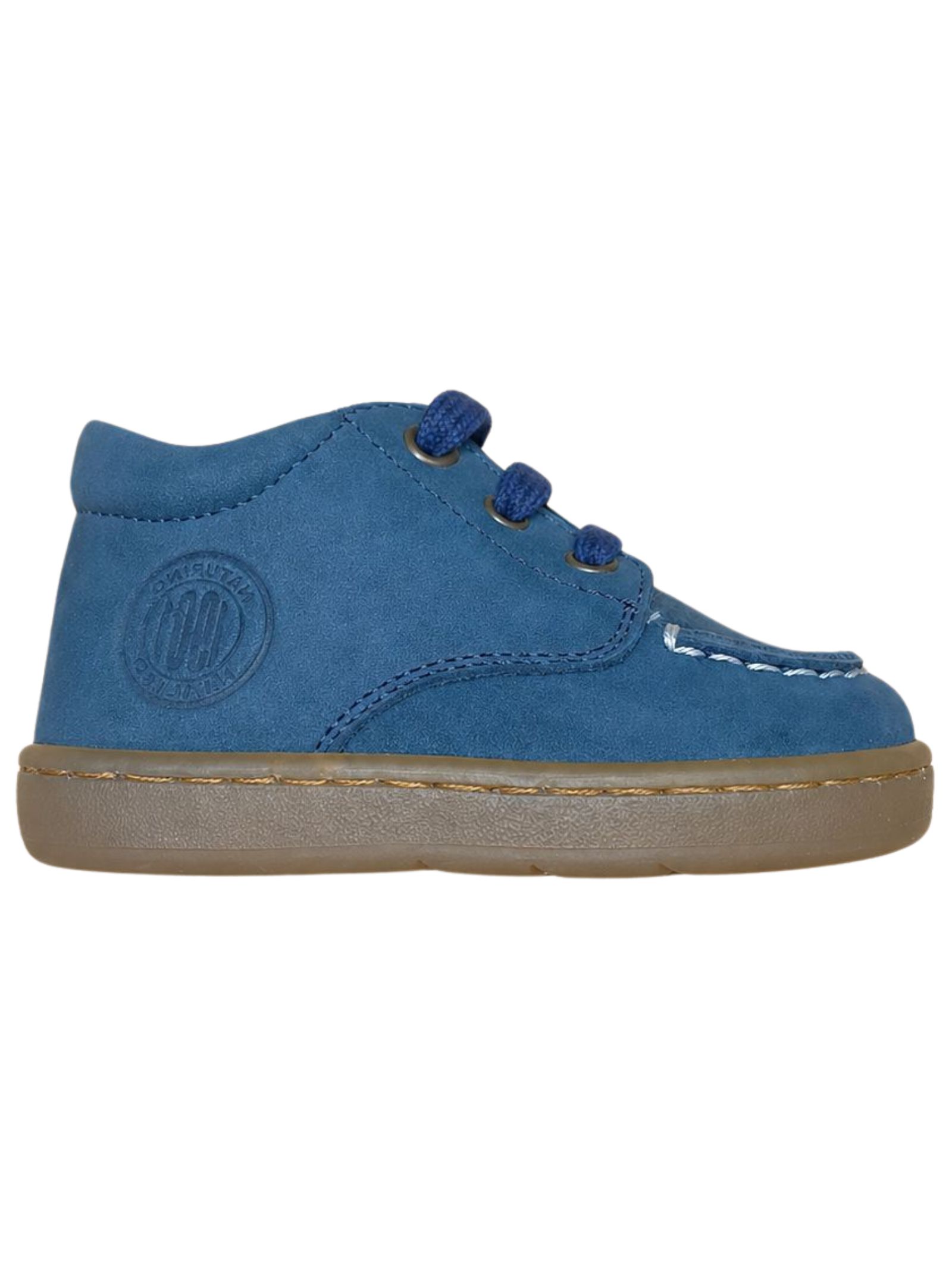 Naturino Kids blue suede shoes with lace-up design, visible stitching, engraved side logo, and rubber sole. Upper: 100% suede. Made in Italy.