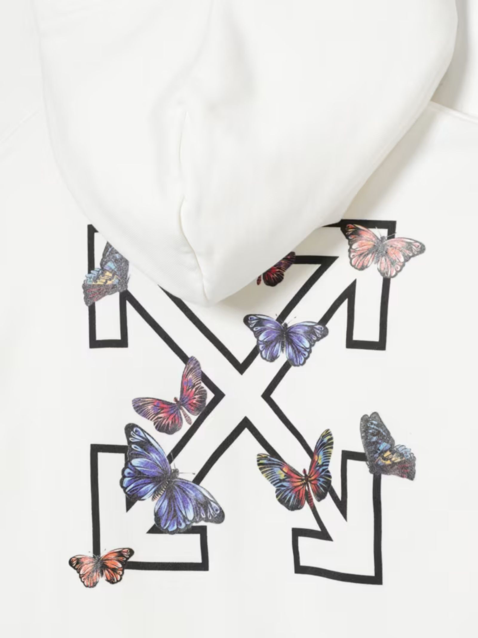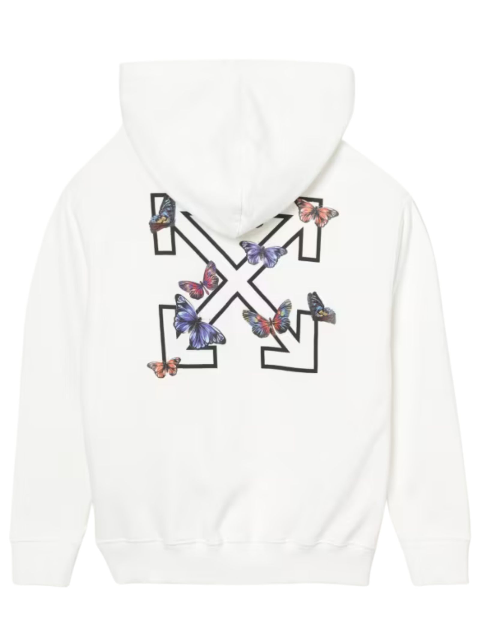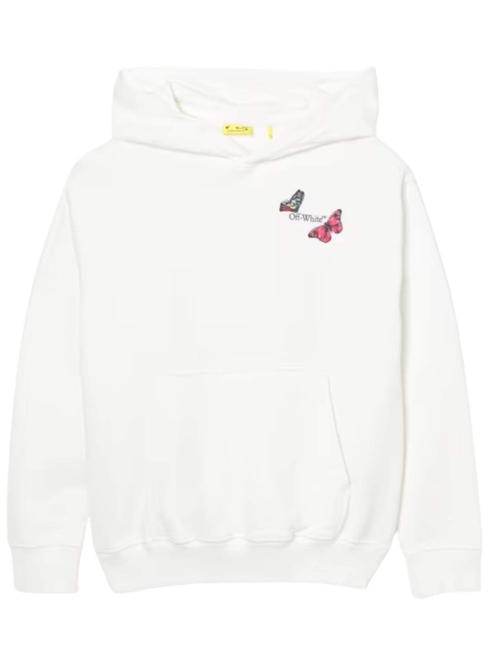 Off-White Kids white hoodie with long sleeves, logo print on the chest and contrasting multicolor butterfly print on the center back, two kangaroo pockets, ribbed cuffs, regular fit. Composition: 100% cotton.