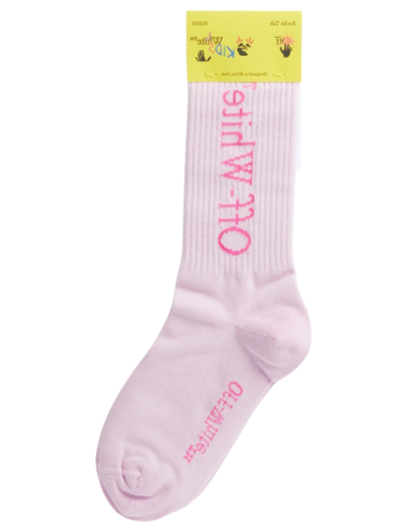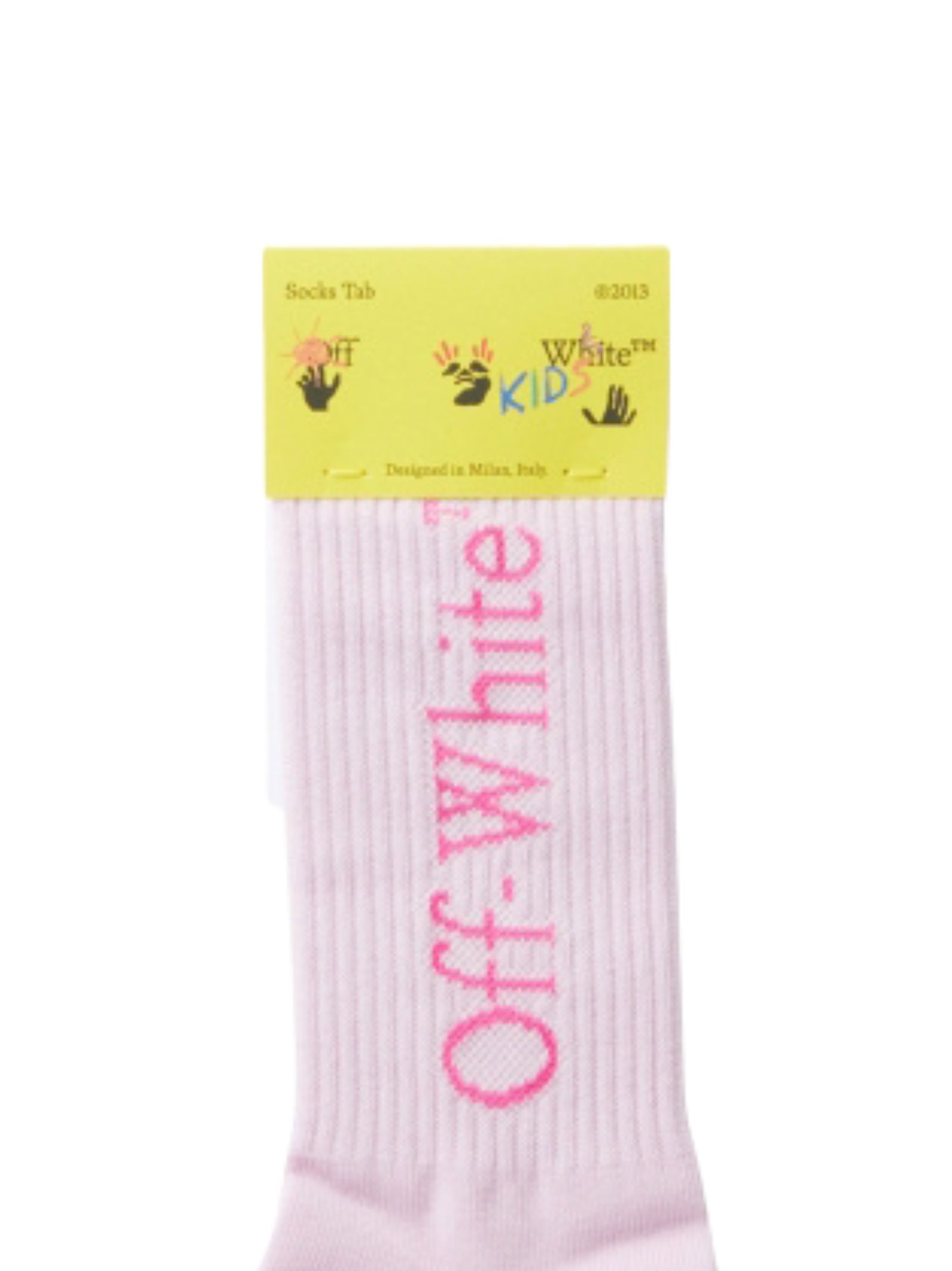 OFF WHITE Kids pink terry socks with ribbed cuffs and a contrasting fuchsia logo lettering on the sides. Composition: 85% cotton, 10% polyamide, 5% elastane. Made in Italy.