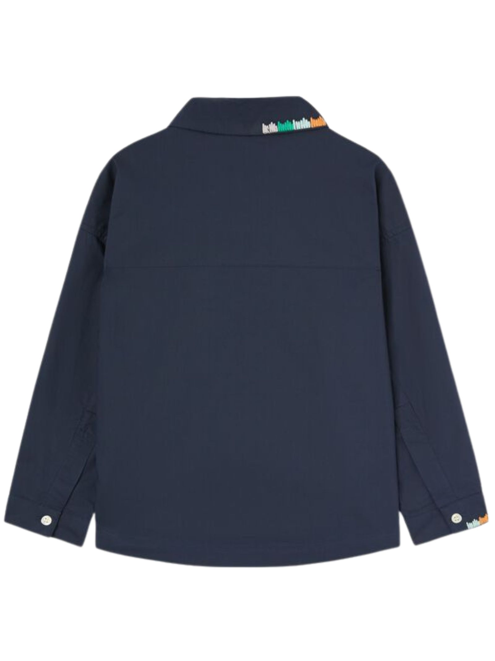 Palm Angels Kids blue shirt, long sleeves, button-down collar and central closure, contrasting long-stitch embroidered logo on the front hem and multicolor embroidery on the collar, pocket, and sleeves, regular fit. Composition: 100% cotton