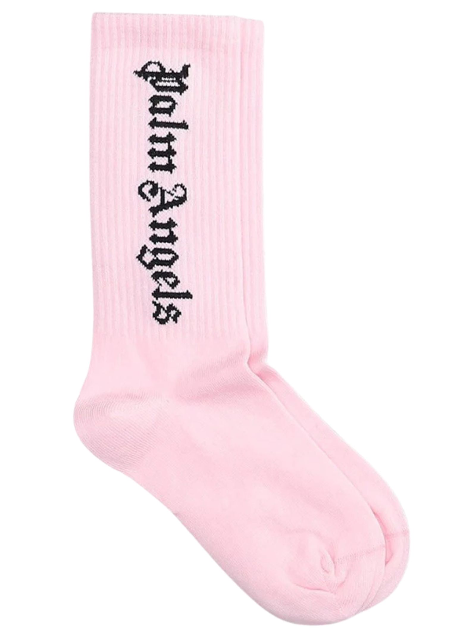 Palm Angels Kids pink terry socks with ribbed cuffs and a contrasting black logo on the sides. Composition: 85% cotton, 10% polyamide, 5% elastane. Made in Italy.