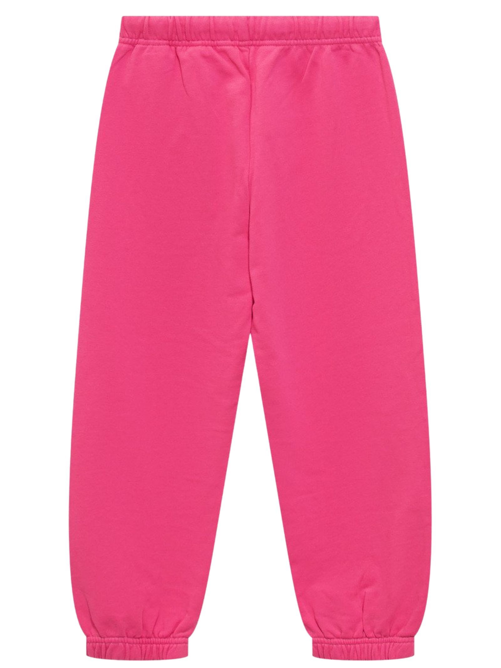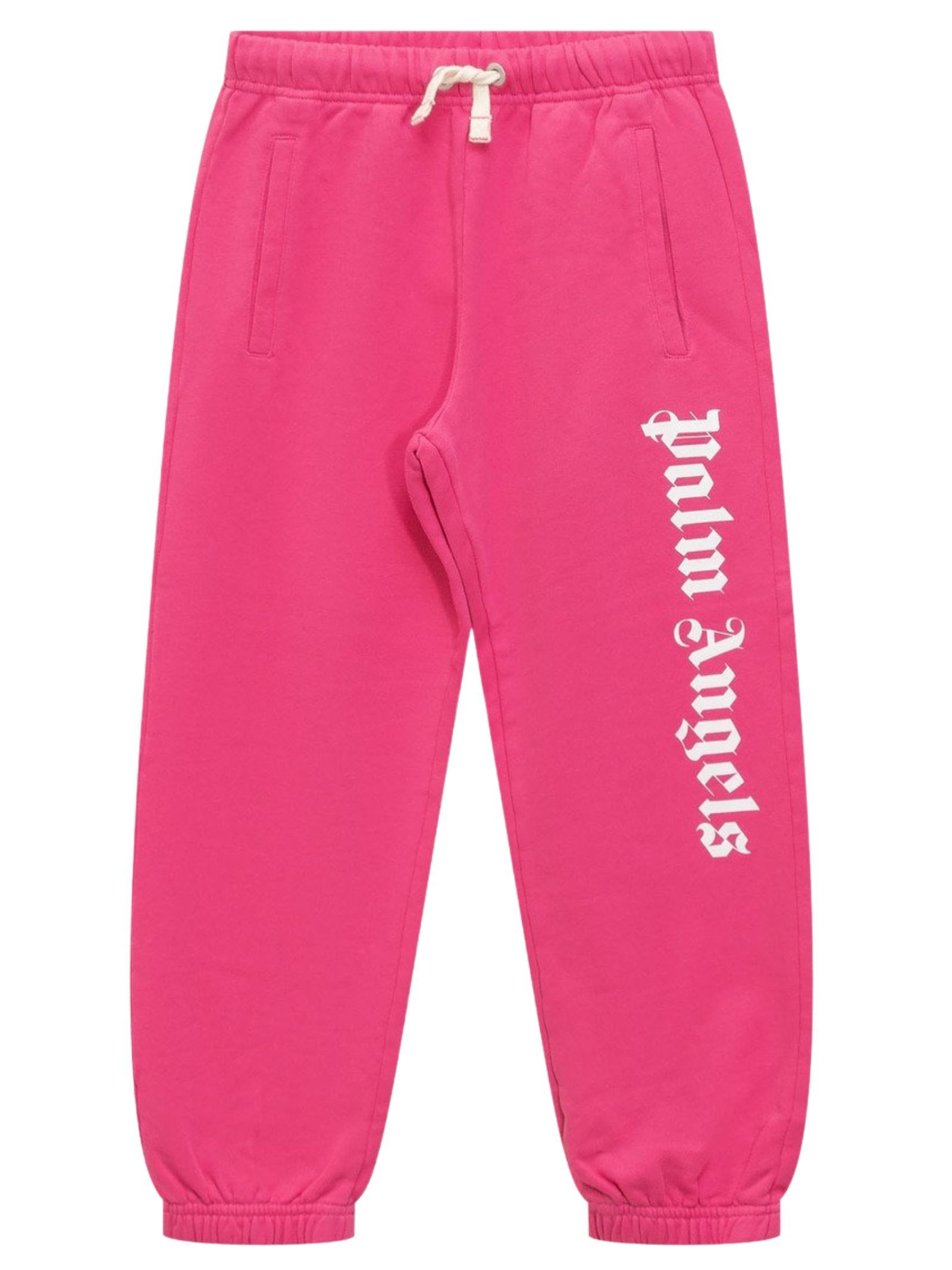 Palm Angels Kids fuchsia trousers with an elasticated waist and drawstring, two side welt pockets, a contrasting white vertical logo print down the leg, and elasticated ankles. Composition: 100% cotton.