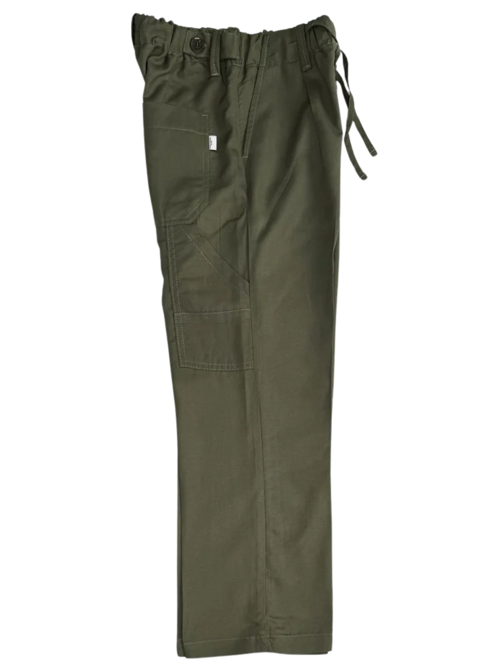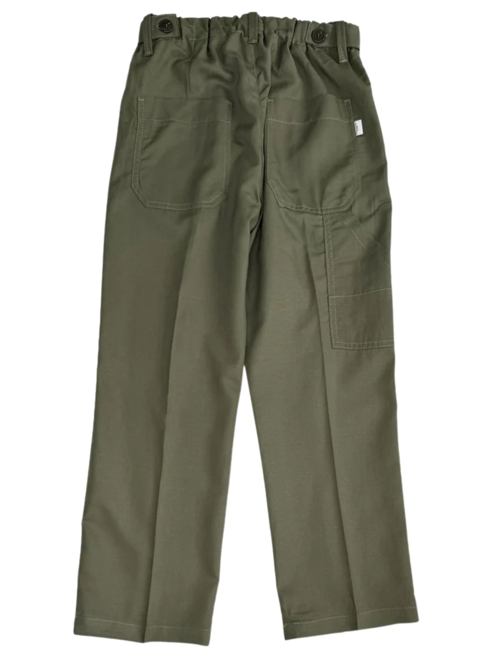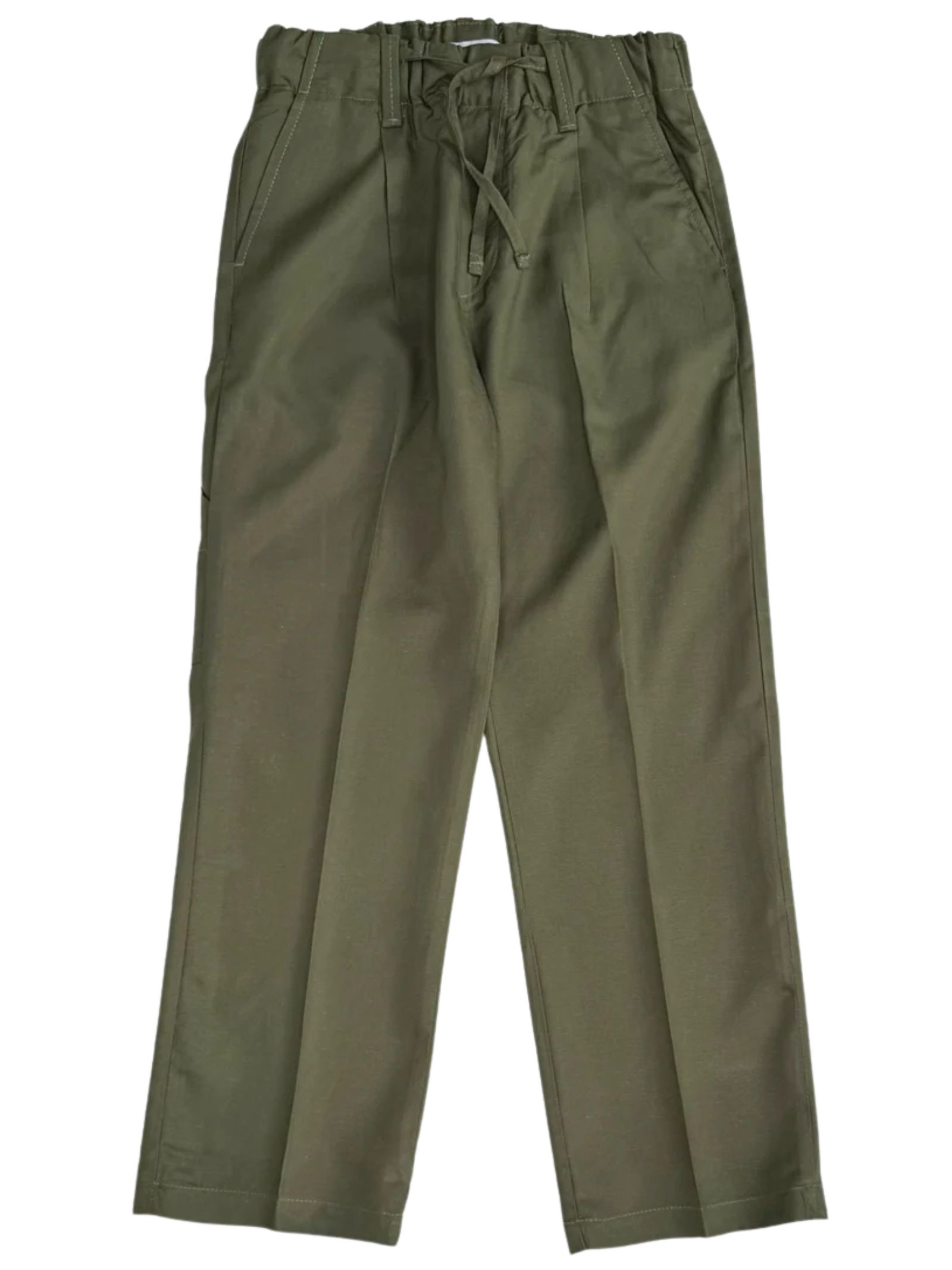 Paolo Pecora Kids military green trousers with an elastic waistband and drawstring, multiple pockets, and a regular fit. Composition: 80% viscose, 20% linen. Made in Italy.