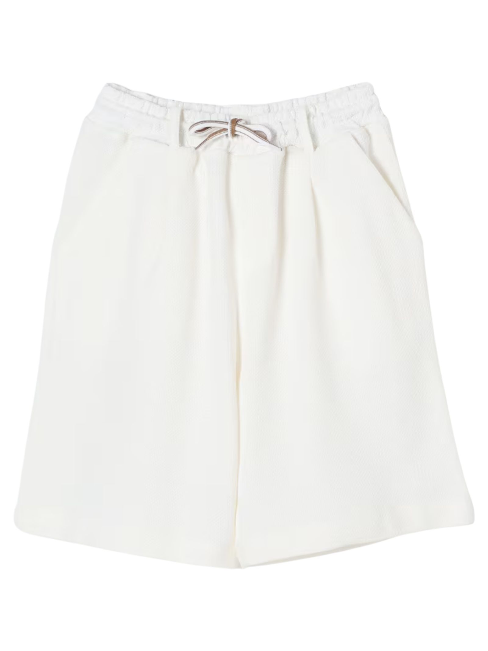 Paolo Pecora Kids white Bermuda shorts with an elastic drawstring waist, two side pockets, and a back pocket, regular fit. Composition: 68% cotton, 20% polyester, 12% polyamide. Made in Italy.