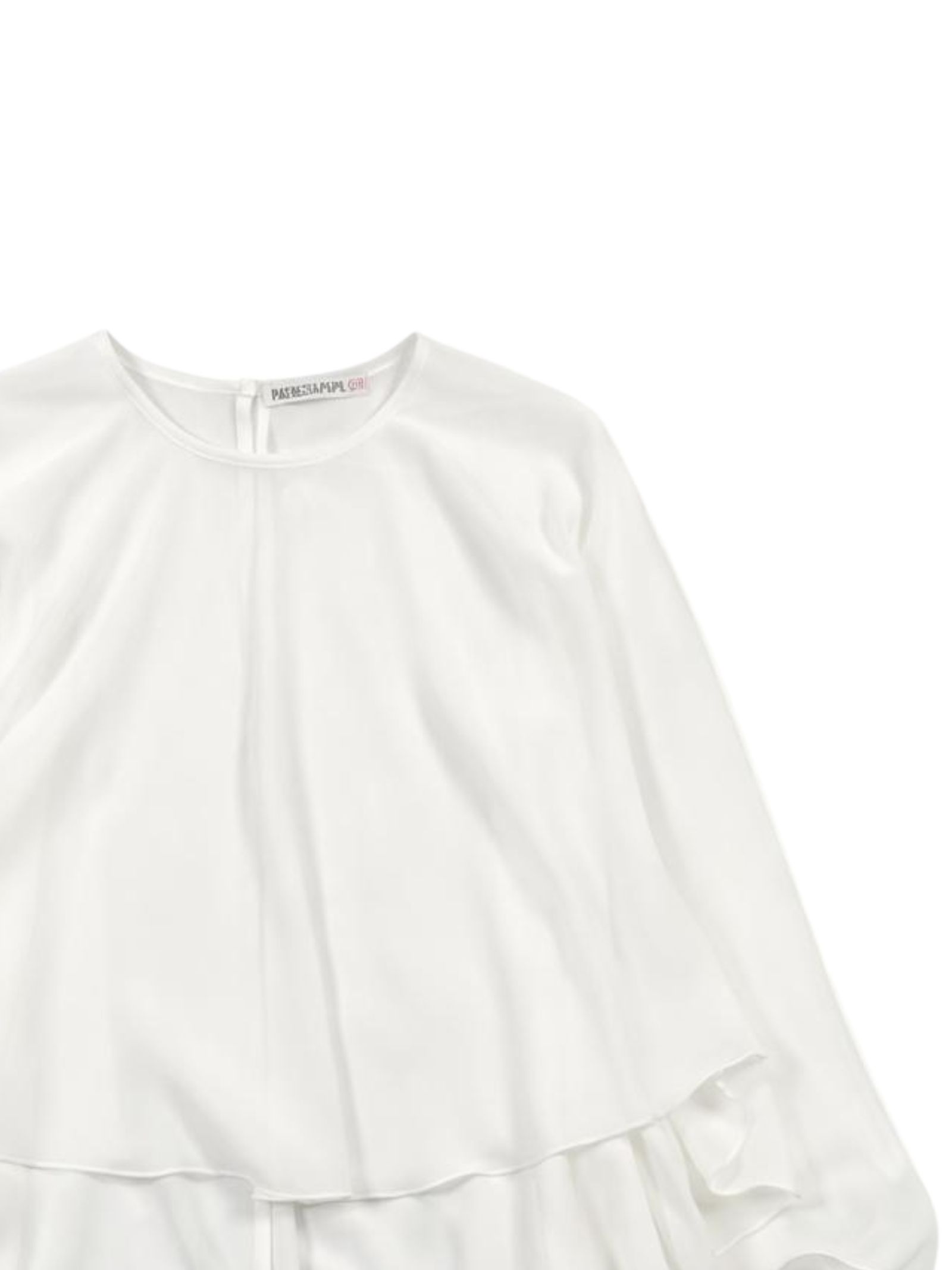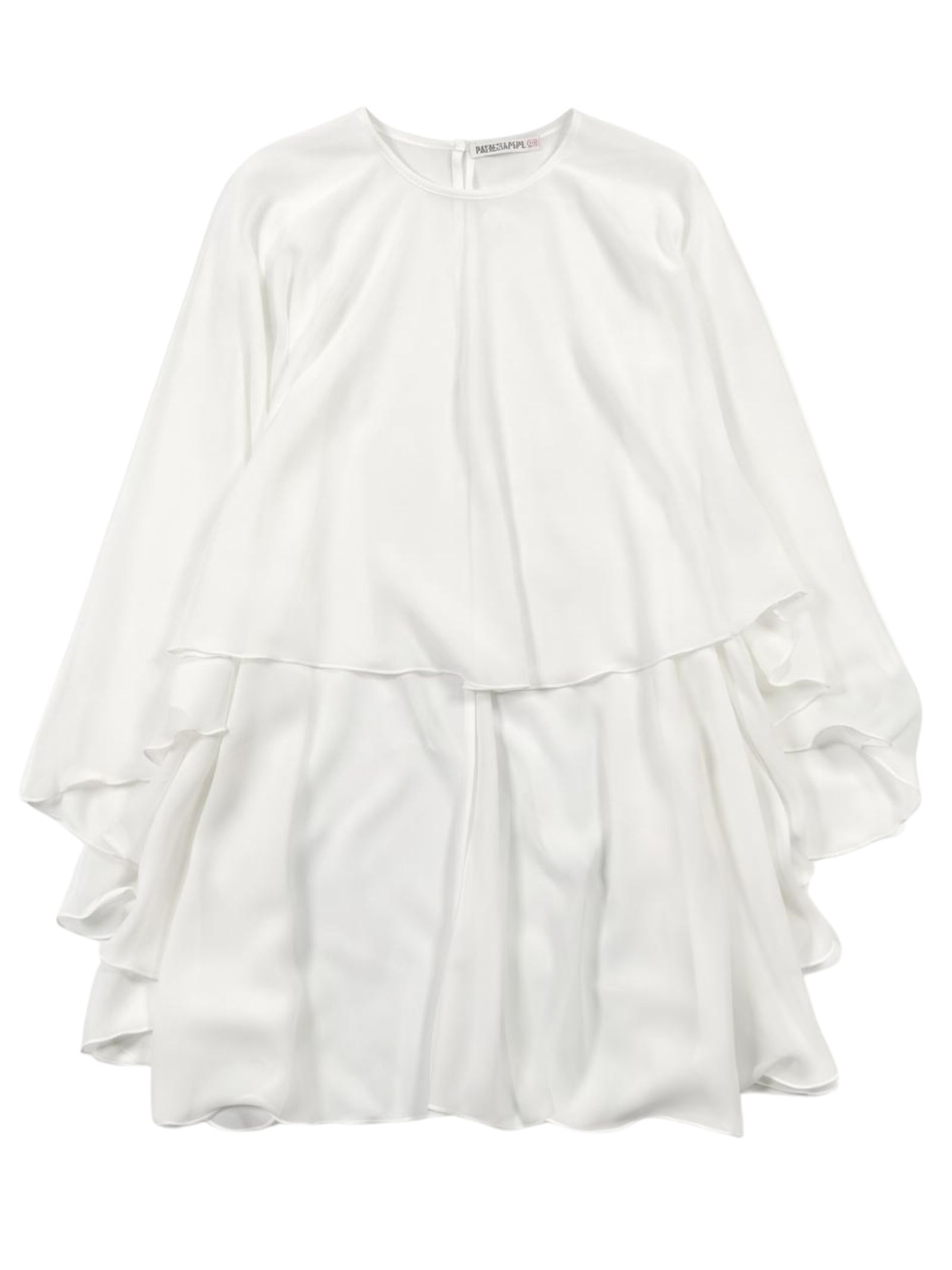 Patrizia Pepe Kids white cape-style blouse made of soft, lightweight, veil-effect fabric. It features a crew neck, a logo-shaped metal button closure on the back, gathered hems, and a loose fit. Composition: 100% polyester. Made in Italy.