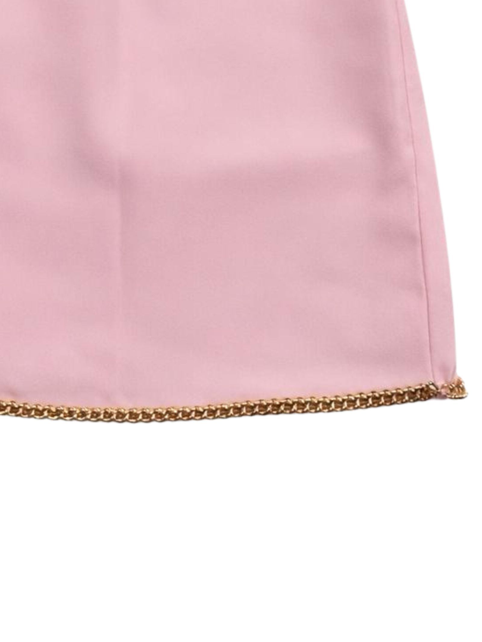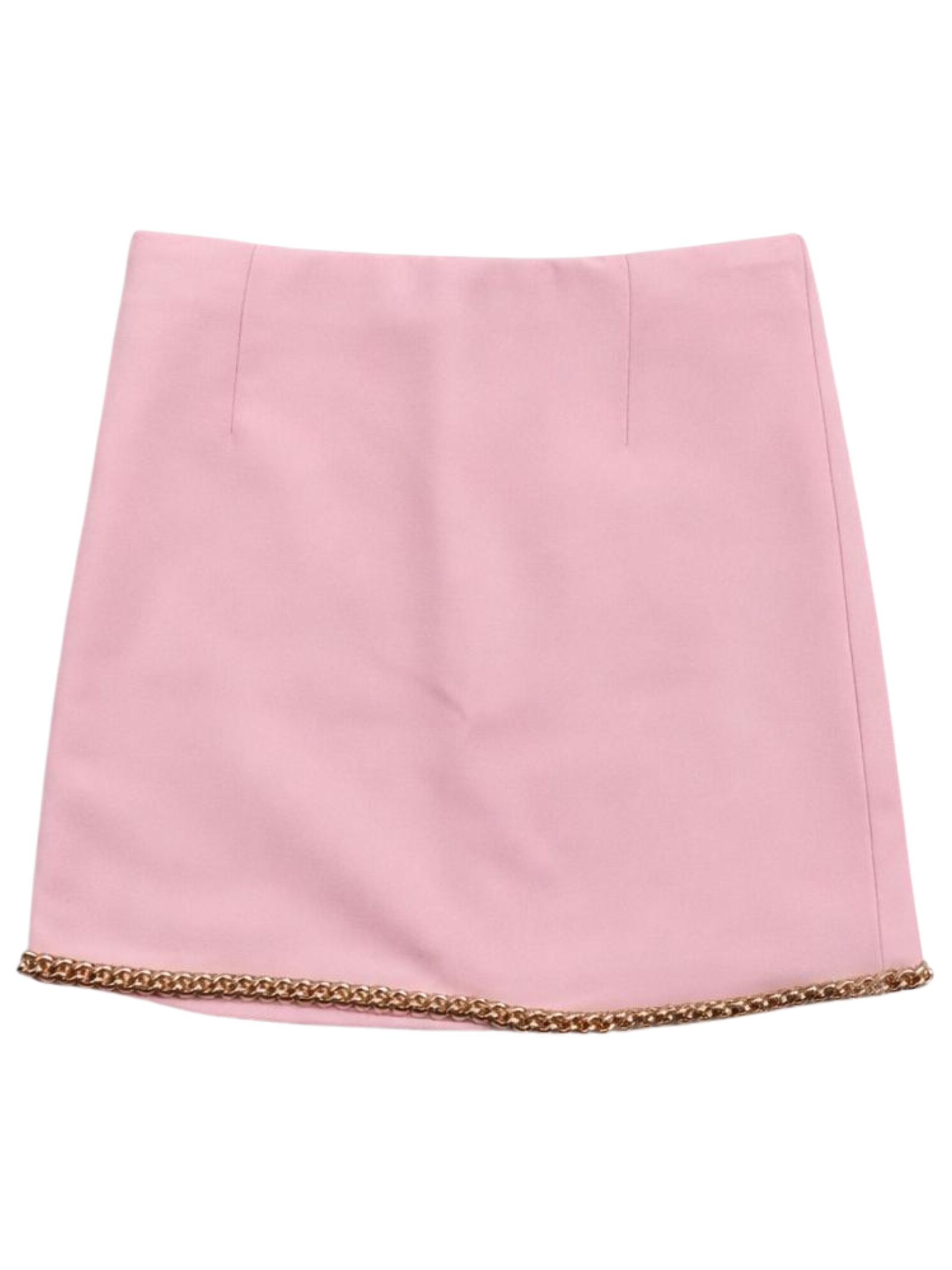 Patrizia Pepe Kids pink skirt with gold chain detail, side zip, metal logo appliqué, regular fit. Composition: 95% polyester, 5% elastane. Made in Italy.