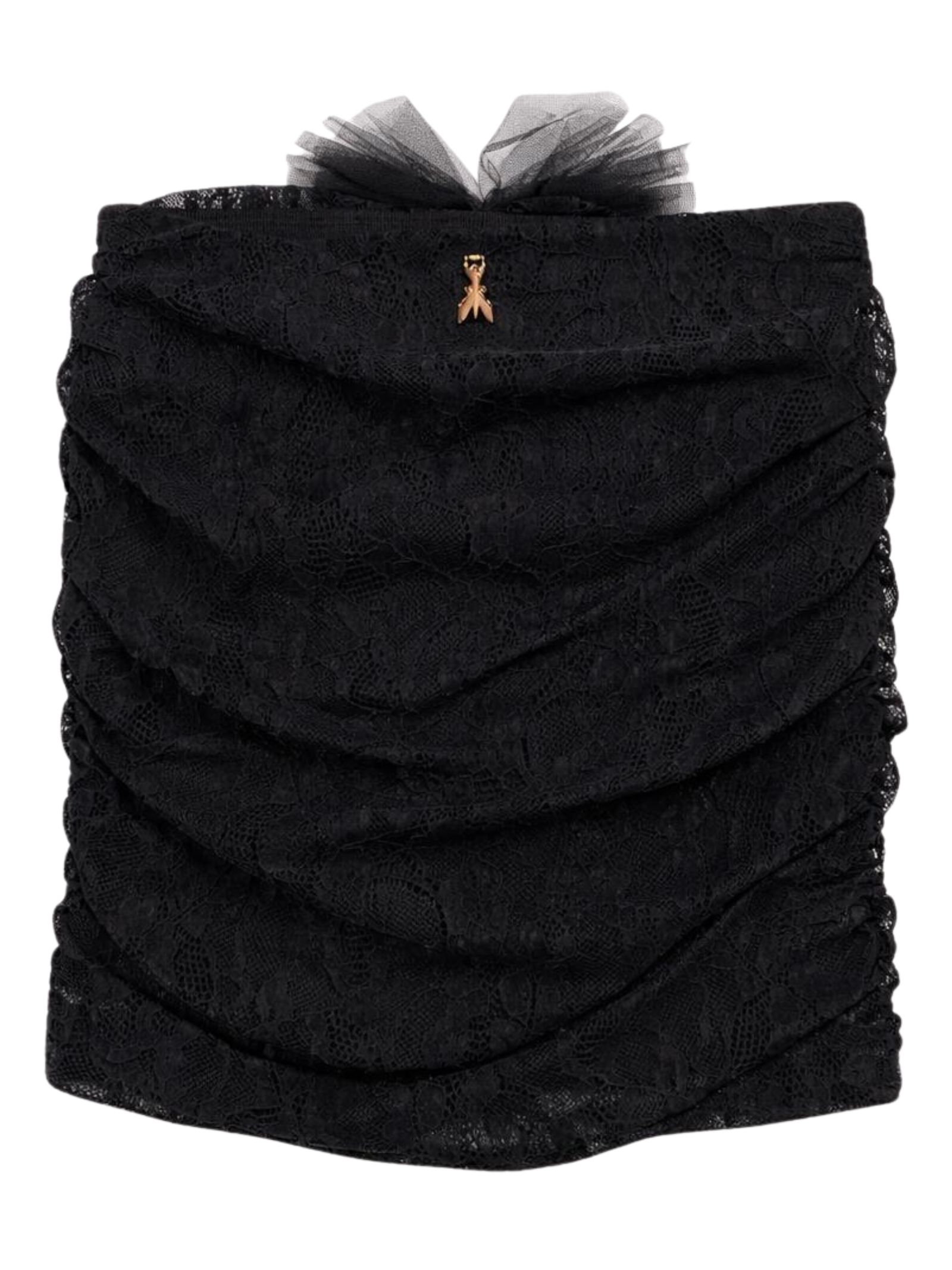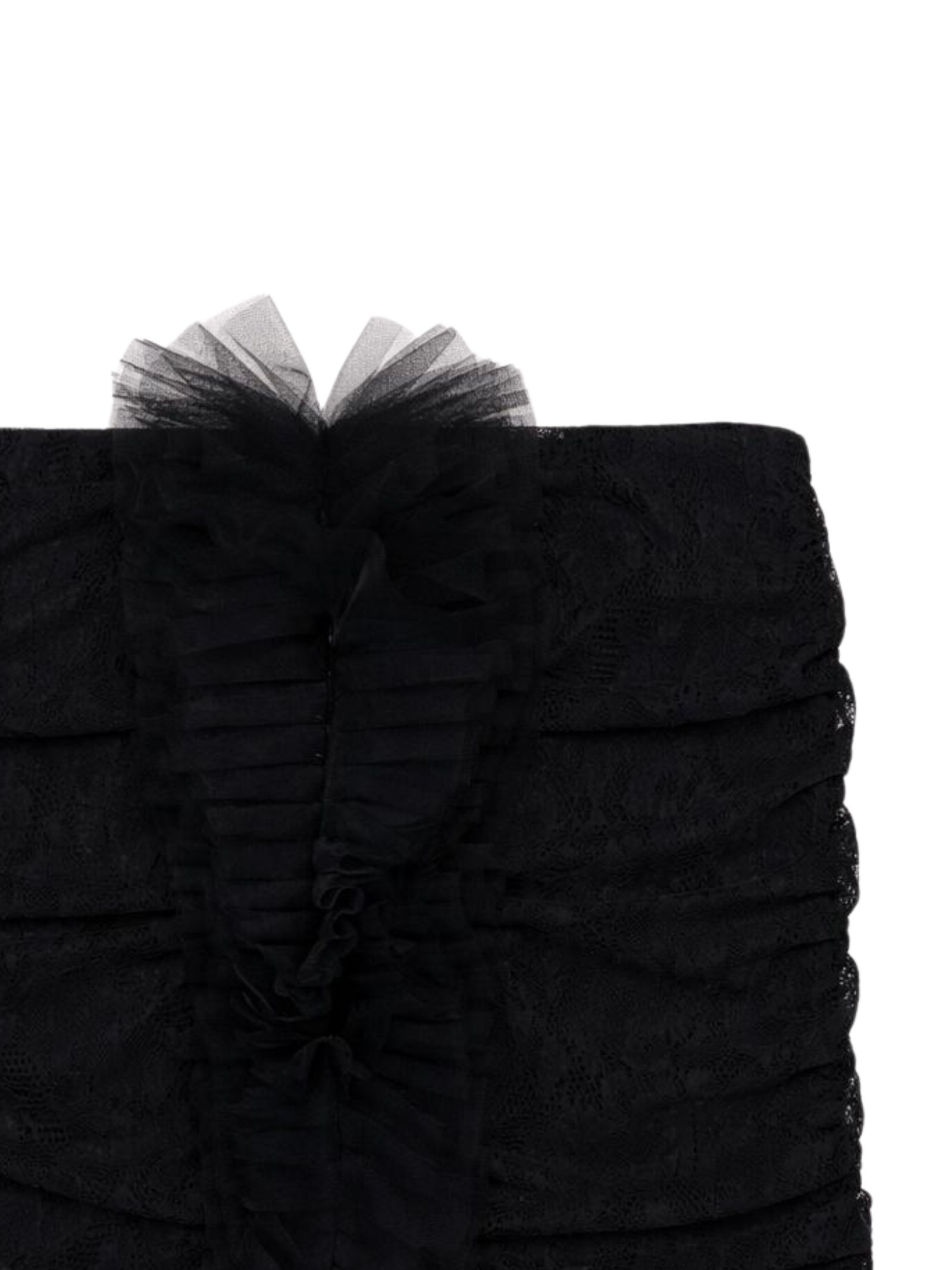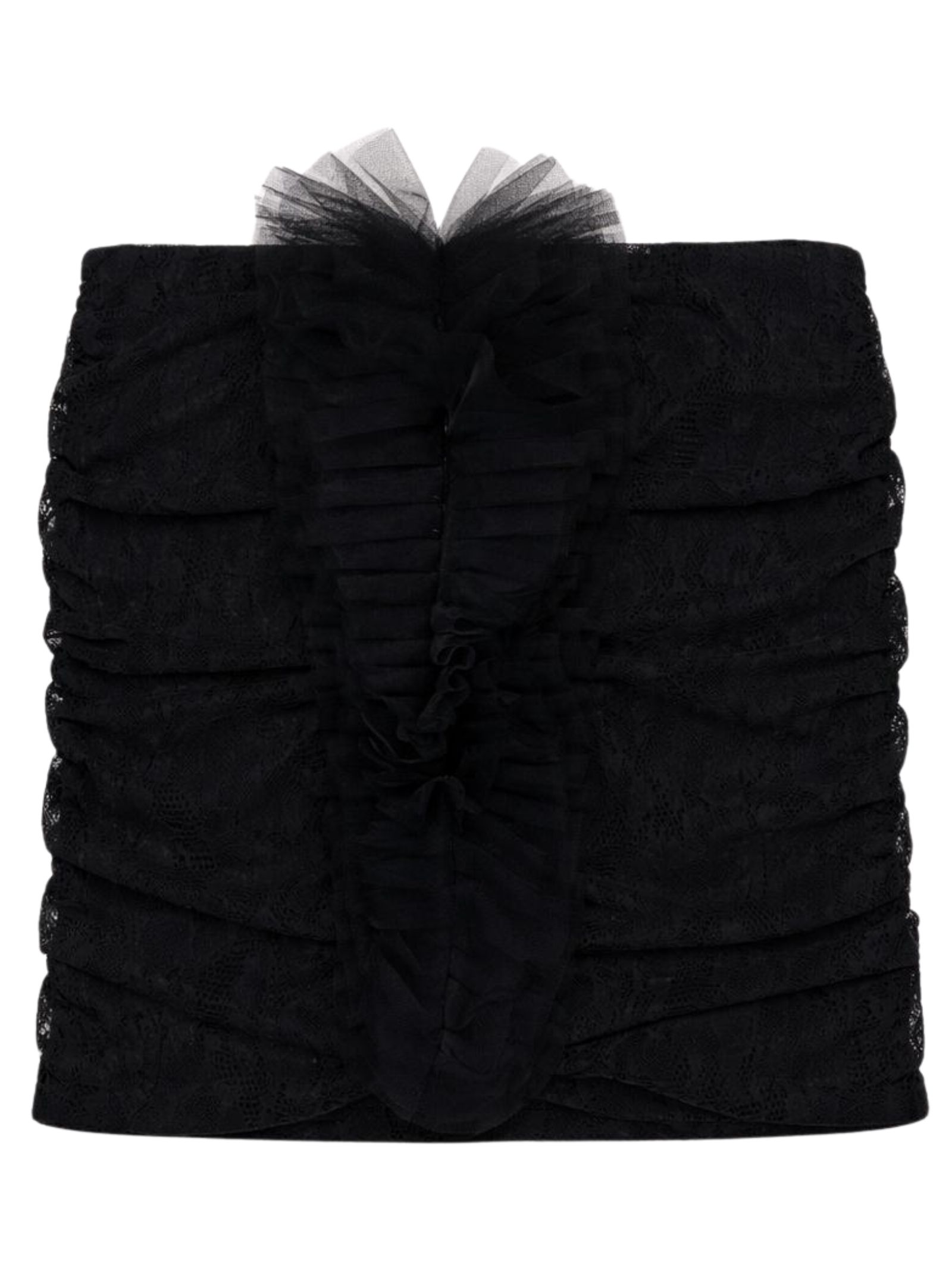 Patrizia Pepe Kids black skirt, lace-effect fabric, regular-waisted design with elastic waist, central ruffle detail, fitted design. Composition: 100% polyester. Made in Italy.
