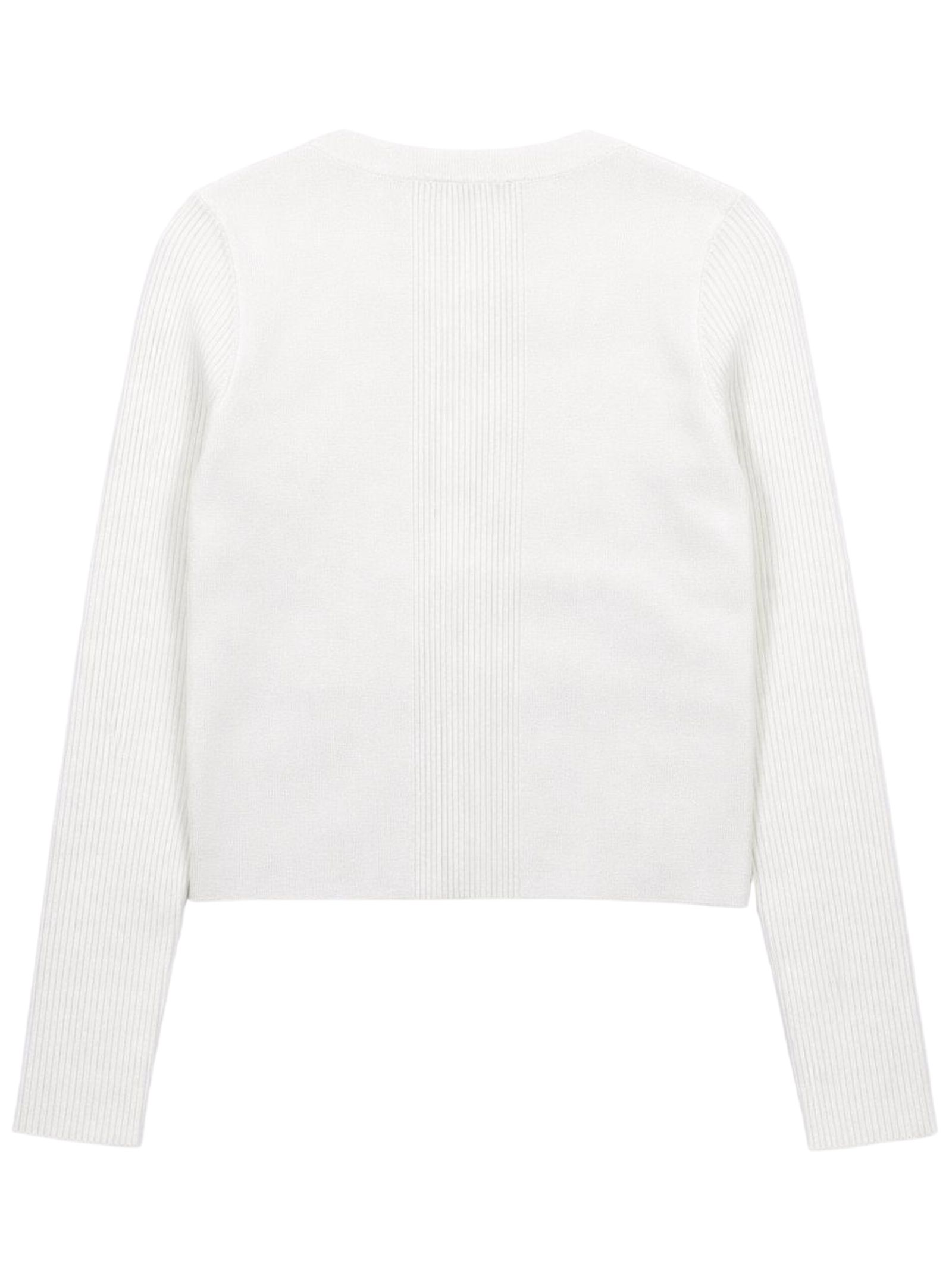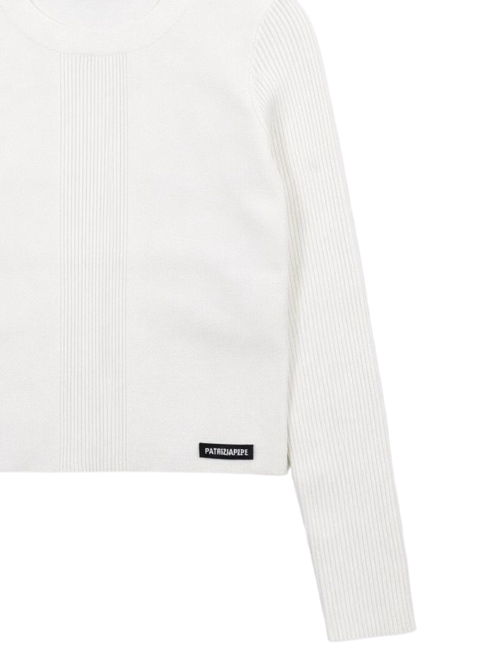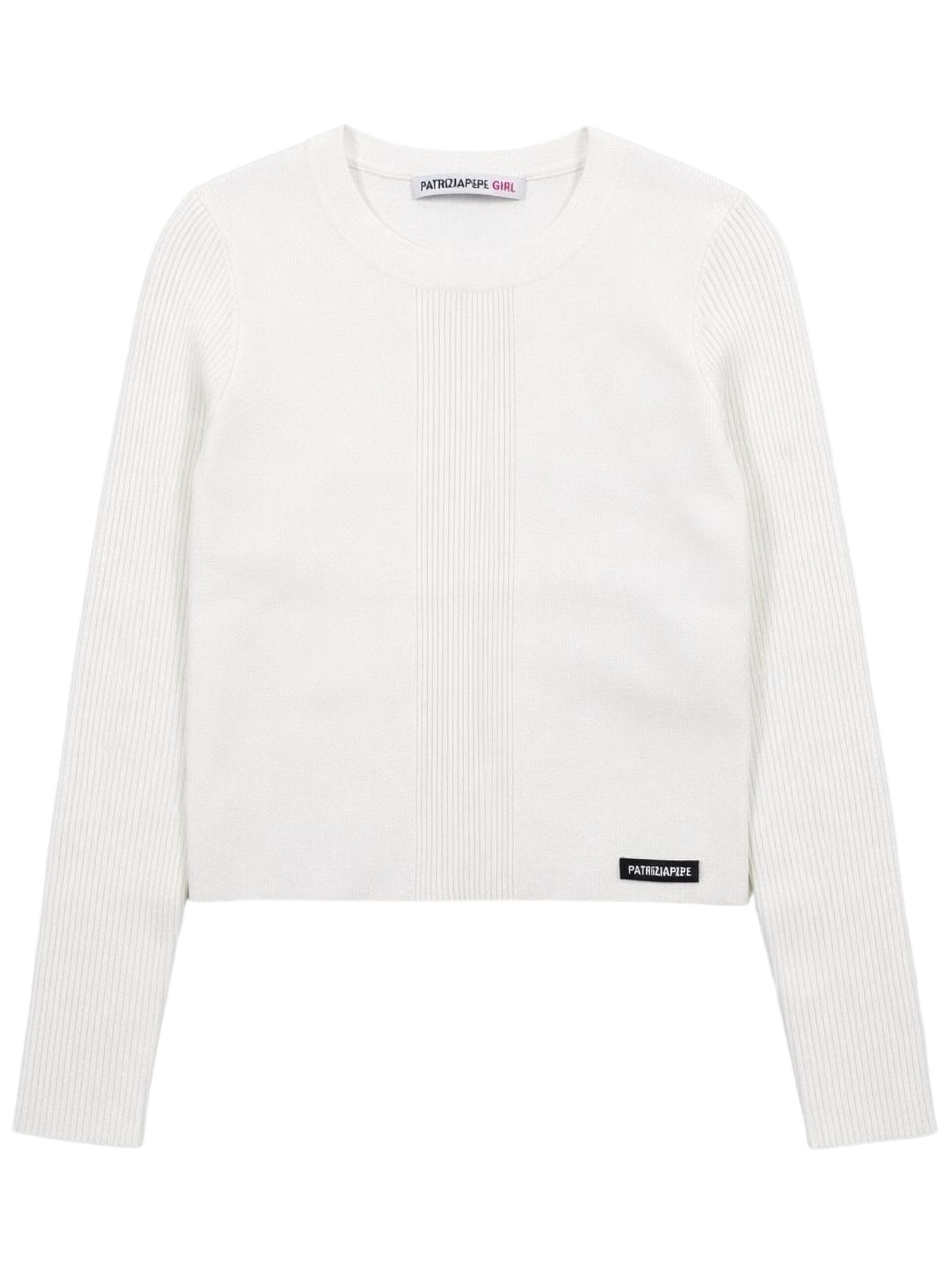 Patrizia Pepe Kids white sweater, short design, crew neck, long sleeves, logo embroidery on the front, ribbed details, slim fit. Composition: 77% viscose 23% polyester