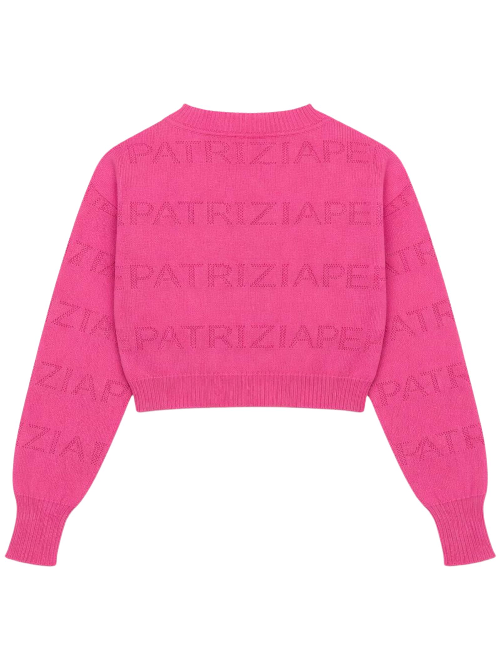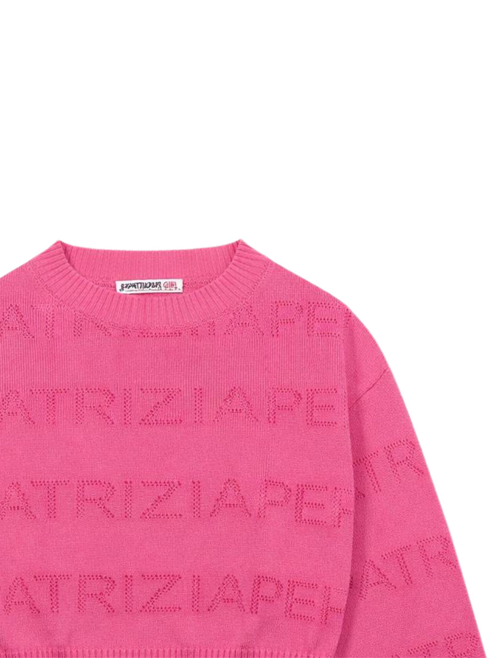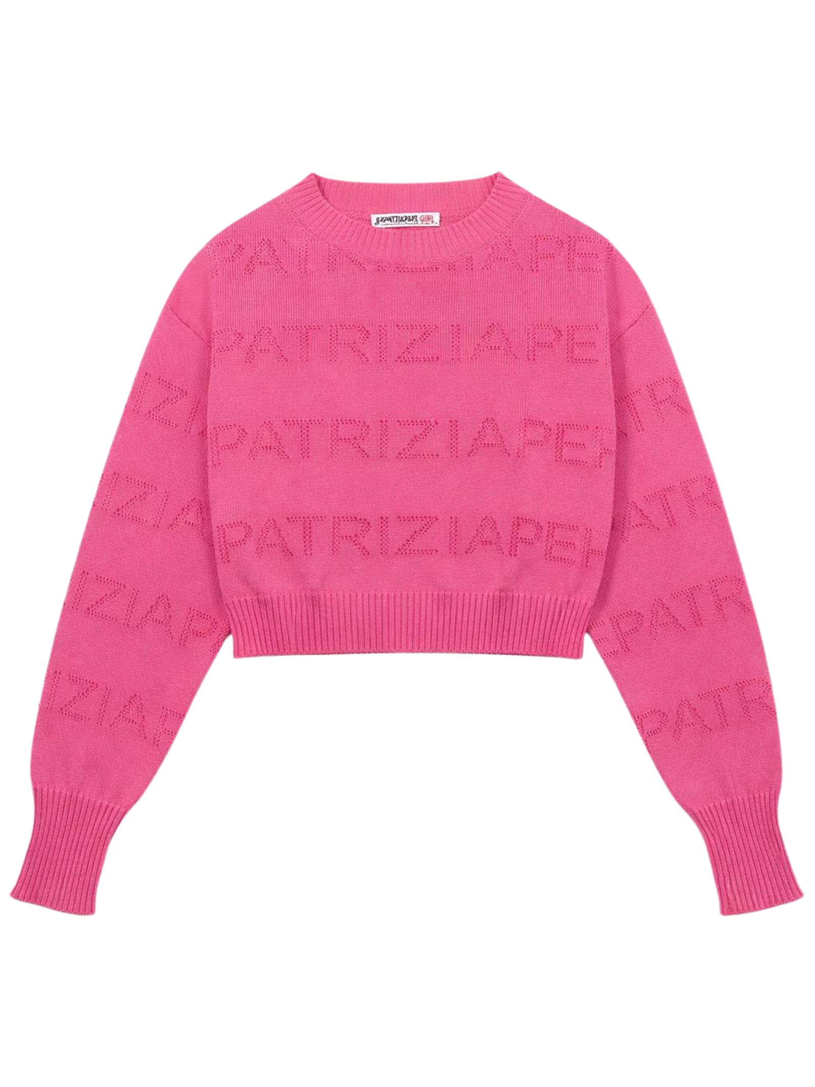 Patrizia Pepe Kids pink sweater, all-over logo detail, cropped design, crew neck, long sleeves, ribbed cuffs, regular fit. Composition: 90% viscose, 10% polyamide.