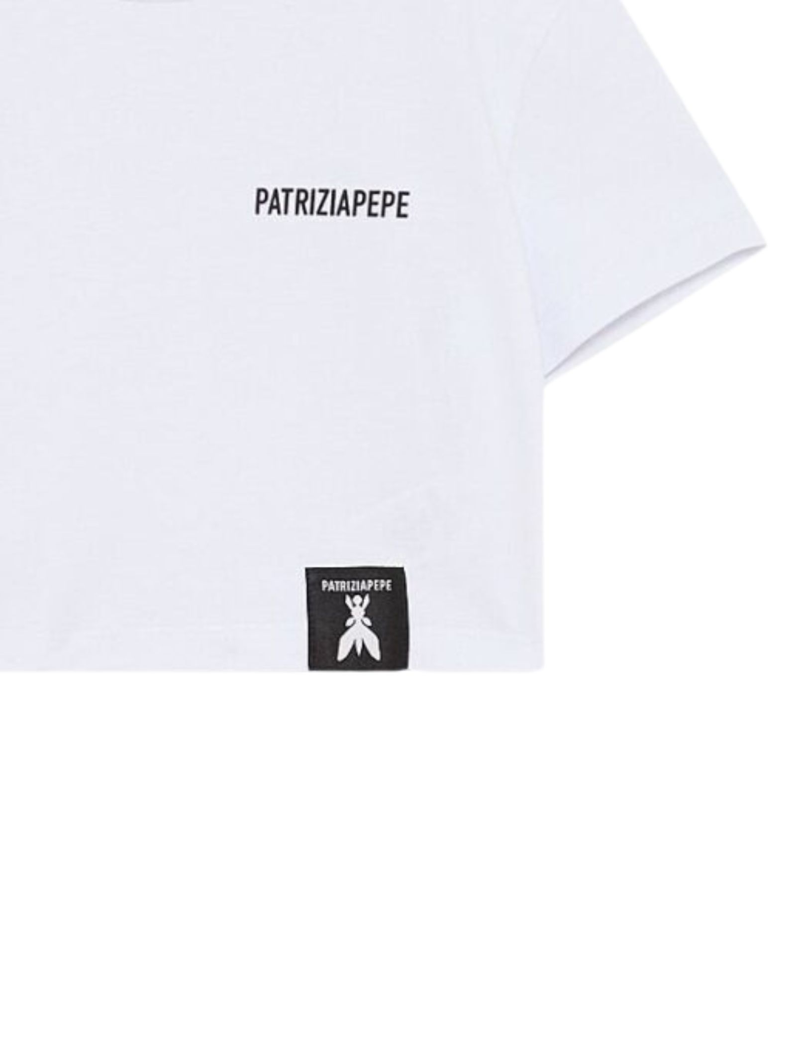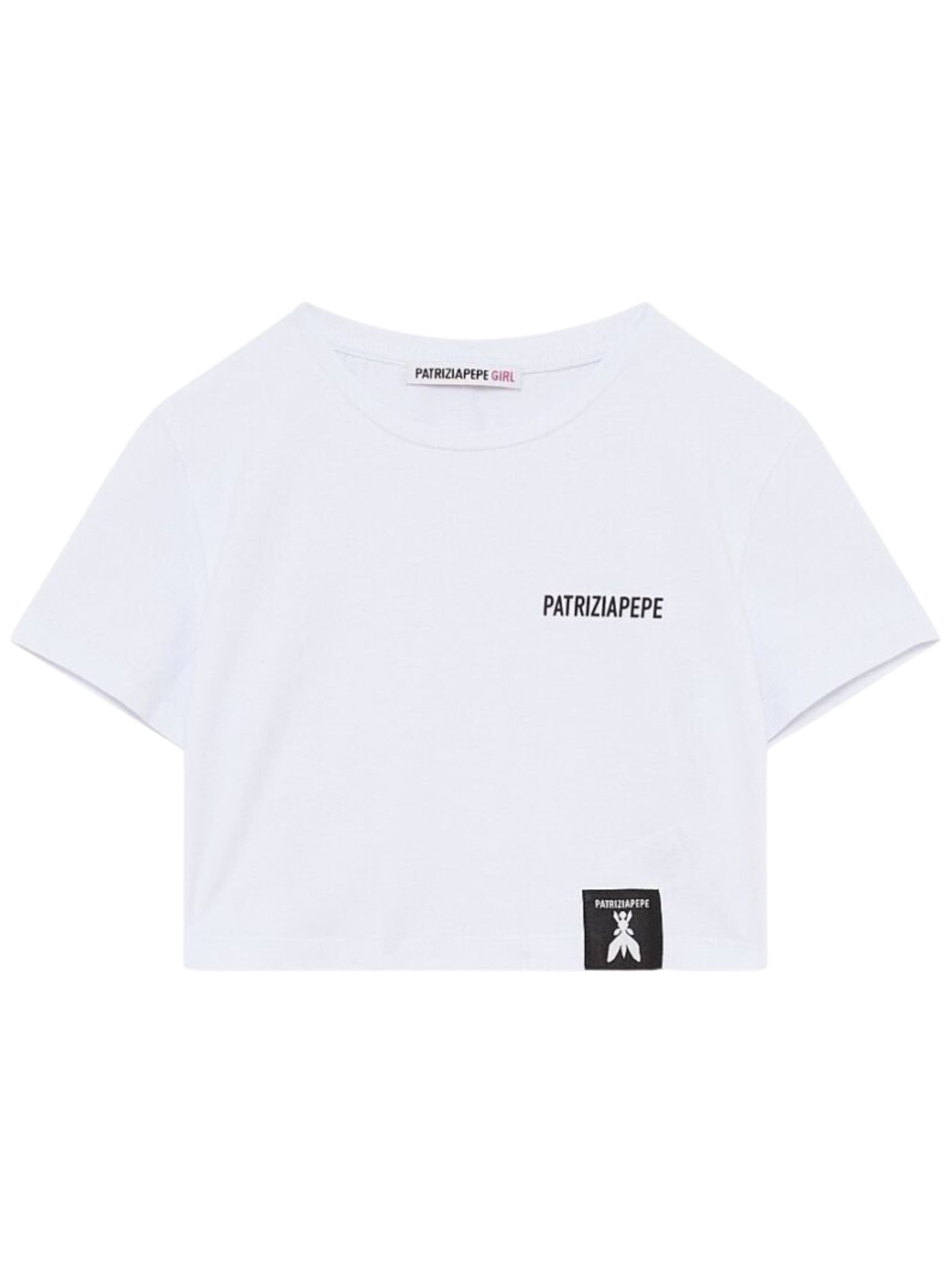 Patrizia Pepe Kids white T-shirt, short model, crew neck, short sleeves, featuring a contrasting black logo print on the chest, logo patch, regular fit. Composition: 95% cotton 5% elastane