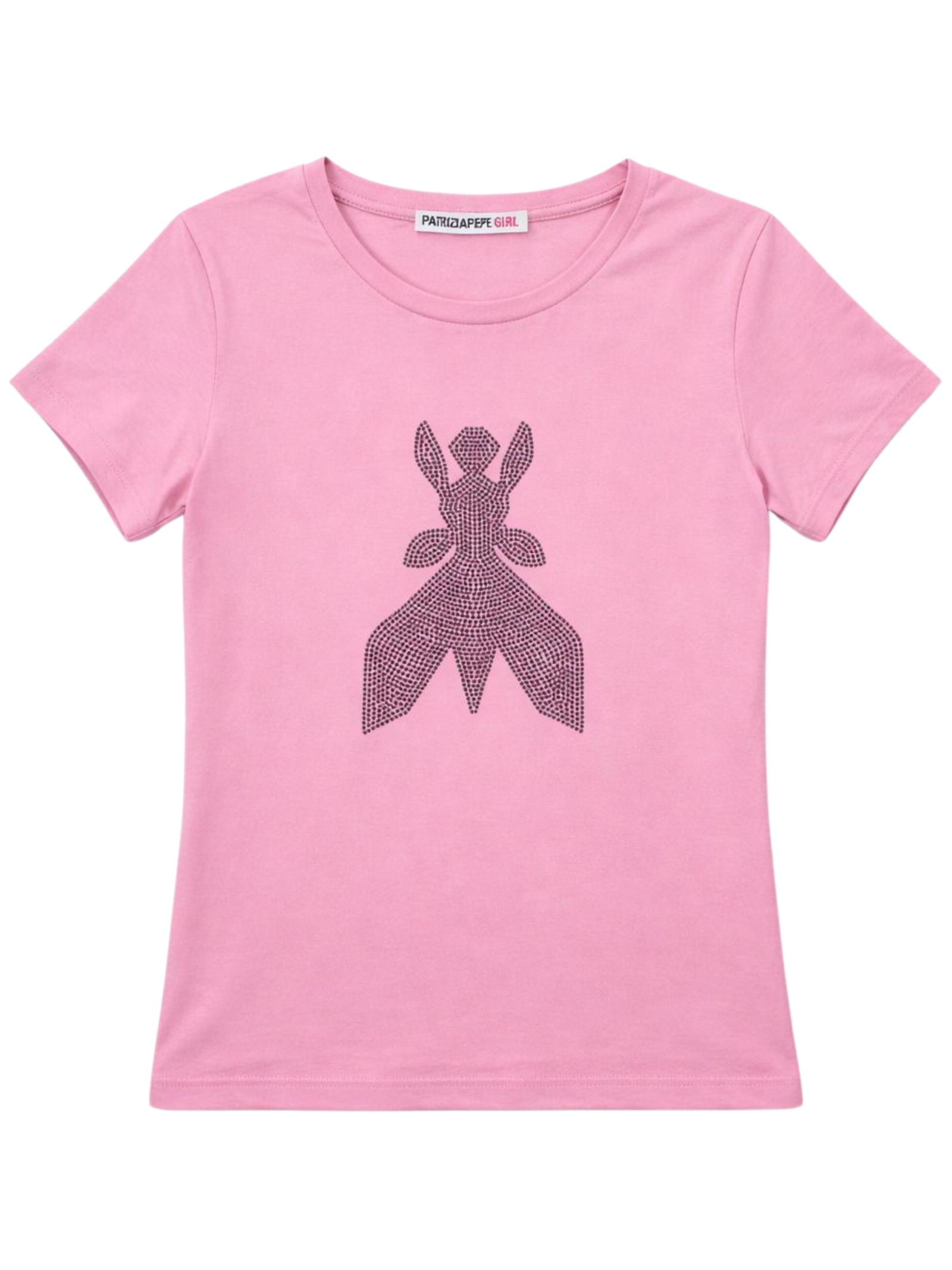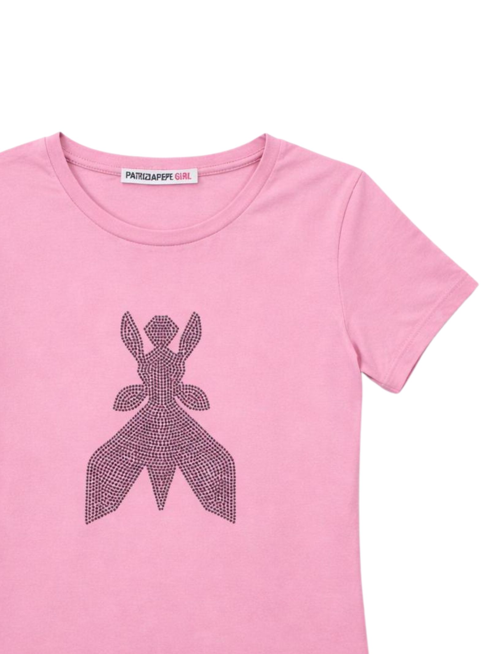 Patrizia Pepe Kids pink T-shirt, short model, crew neck, short sleeves, featuring an internal rhinestone application in the shape of the logo, tight fit. Composition: 95% Viscose 5% Elastane