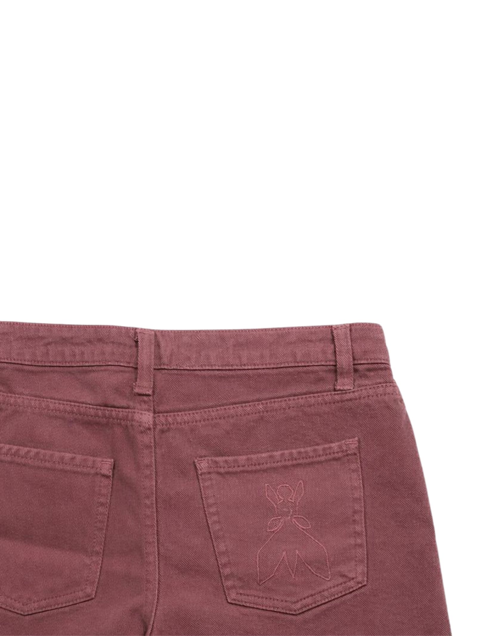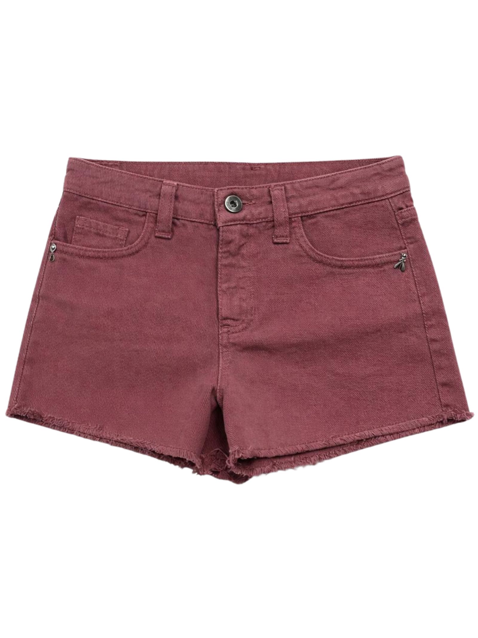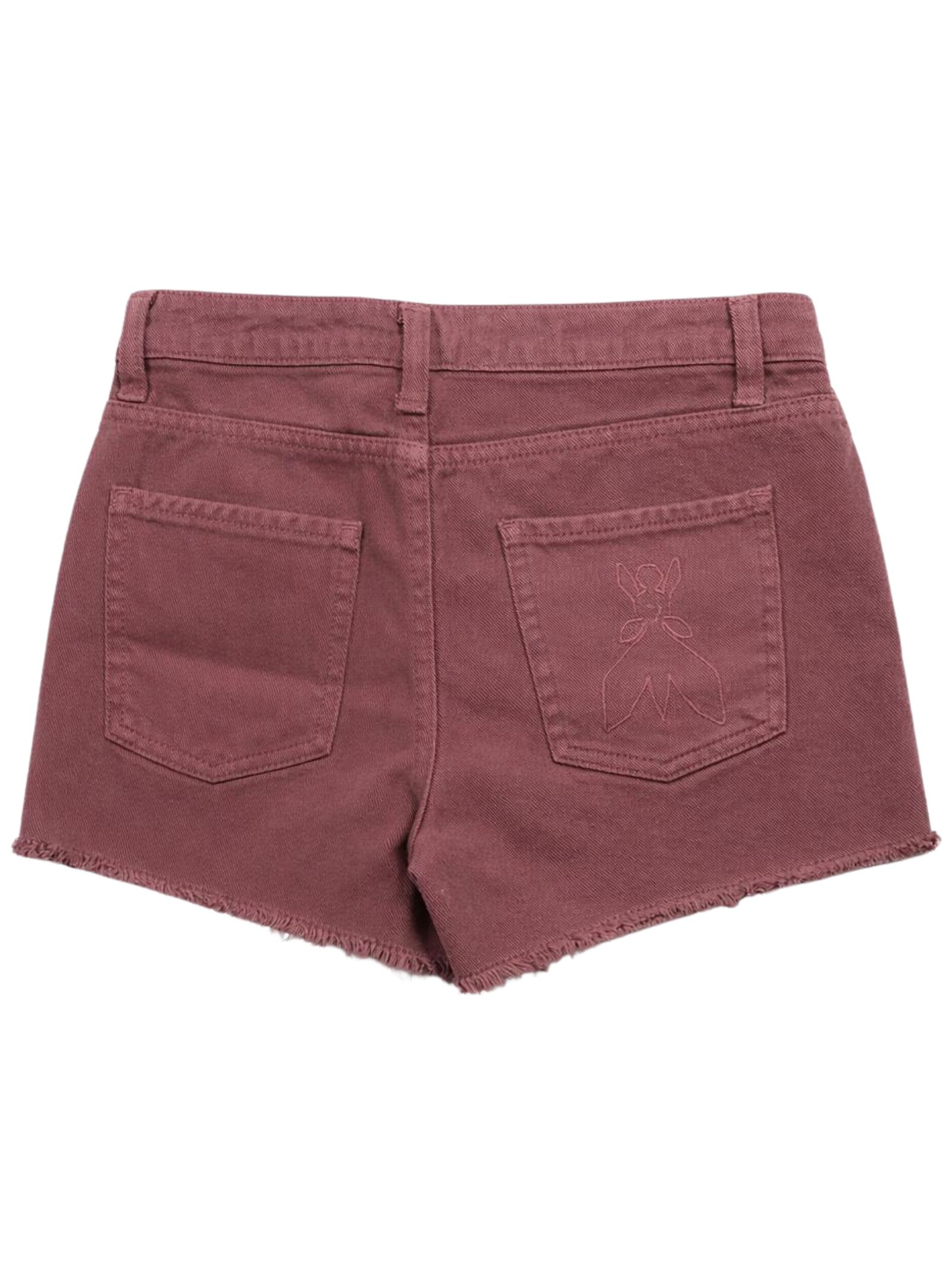 Patrizia Pepe Kids denim shorts in an antique pink wash, with an adjustable waistband, a button and zip closure, five-pocket styling, frayed hems, a front logo, and a fitted design. Composition: 100% cotton. Made in Italy.