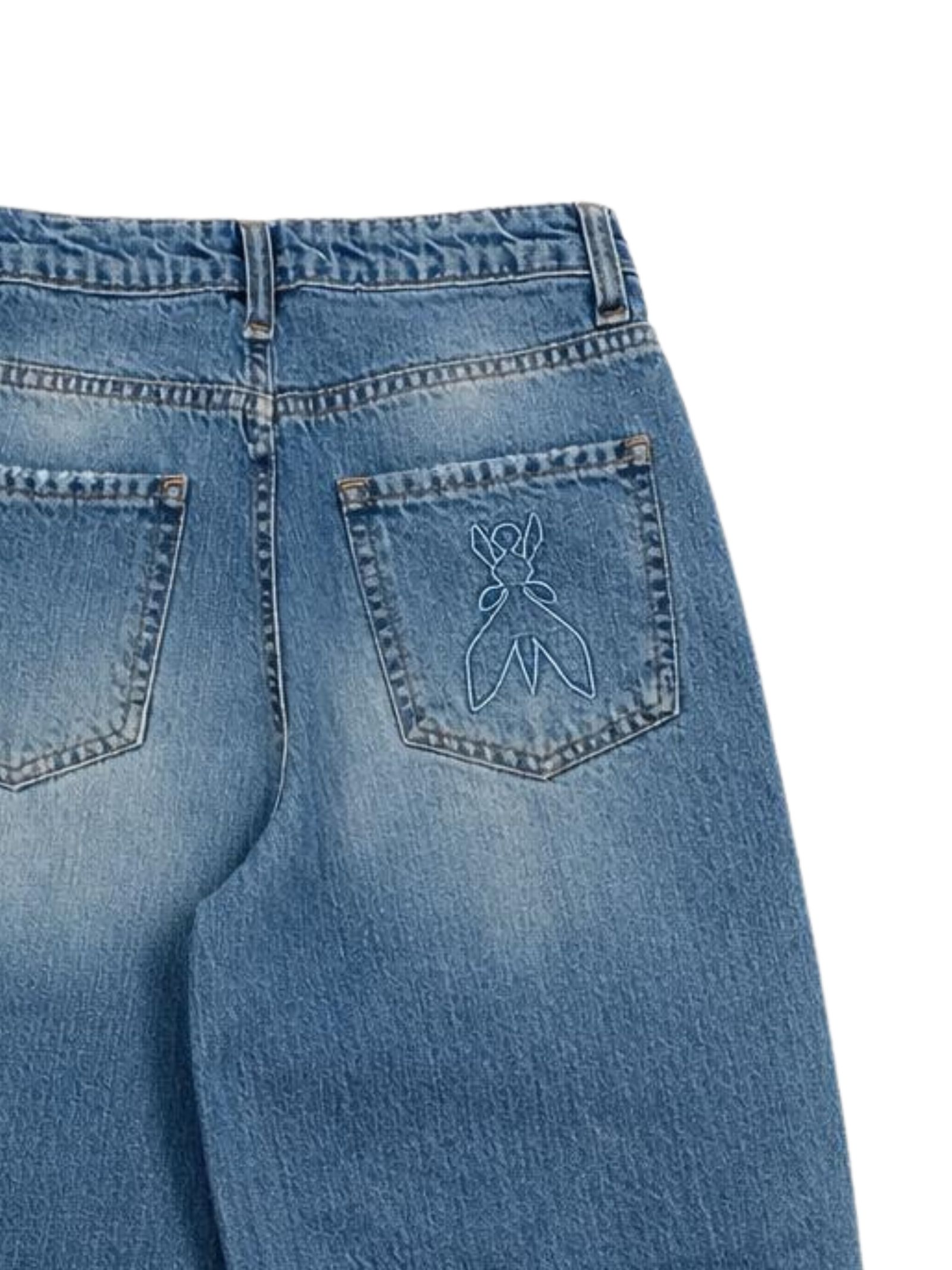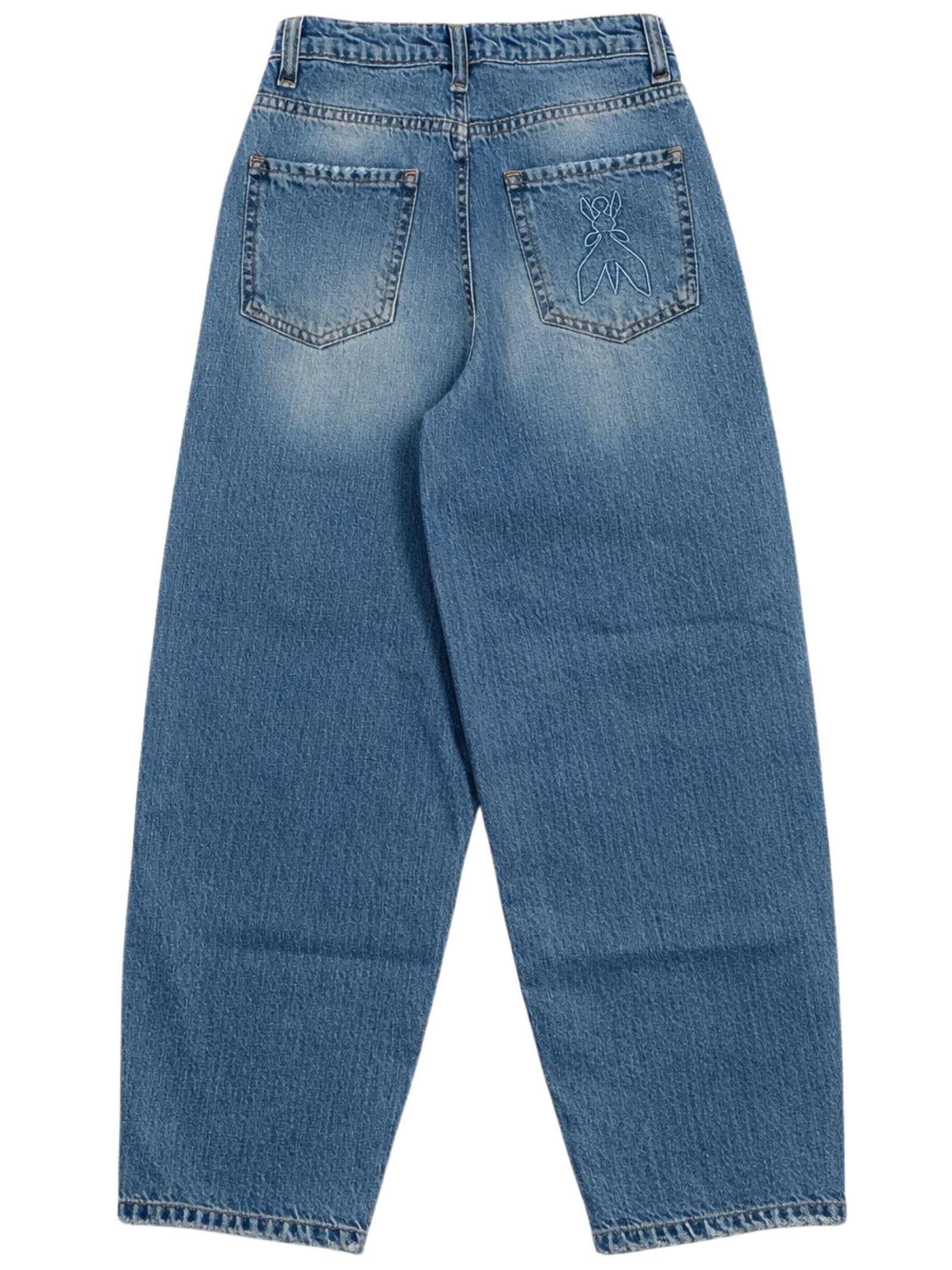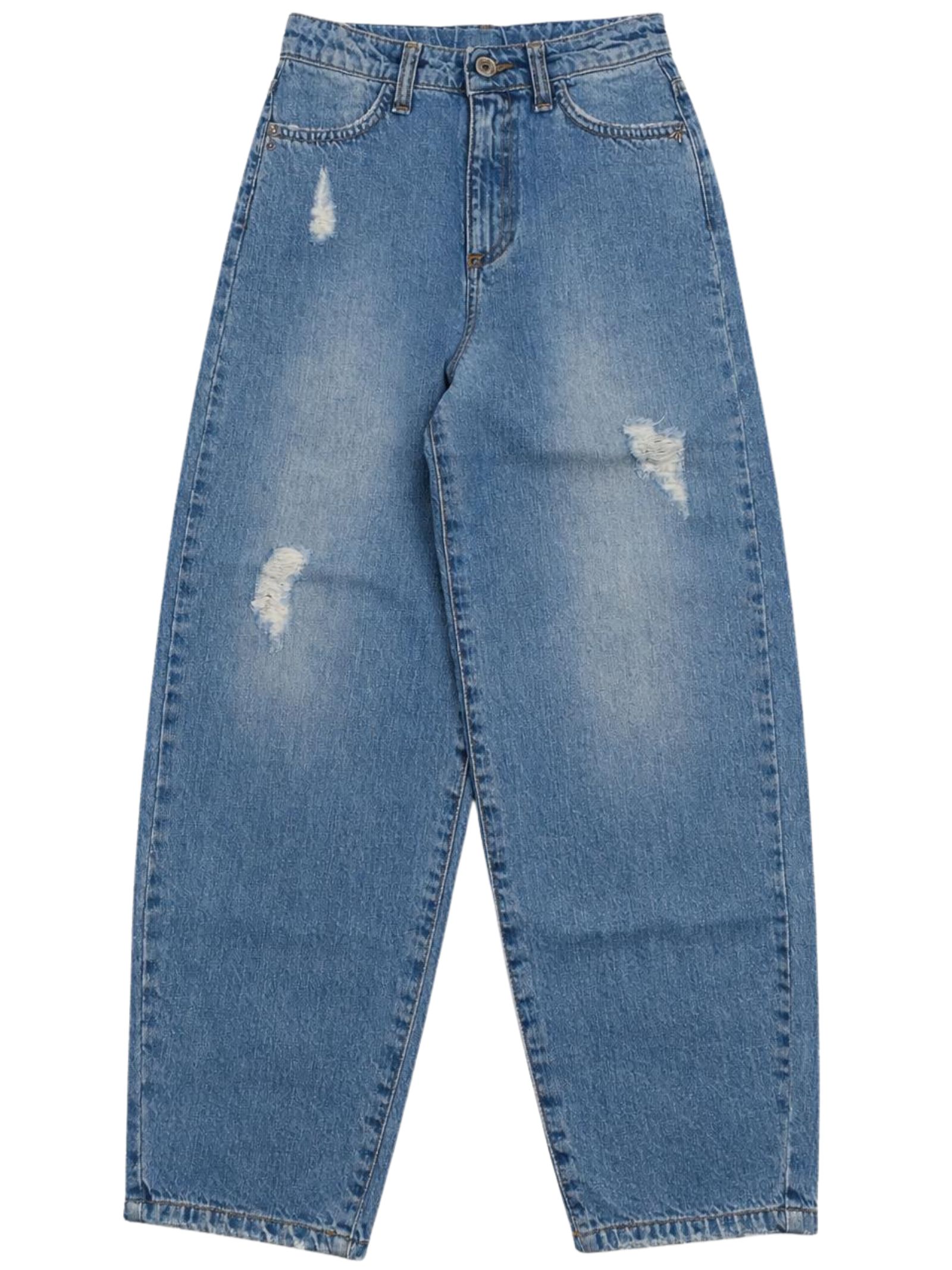 Patrizia Pepe Kids jeans in a medium-dark blue wash, featuring faded details, rips, an adjustable waistband, a button and zip fly, four pockets, a front logo, embroidered logo on the back, and a wide leg. Composition: 100% cotton. Made in Italy.