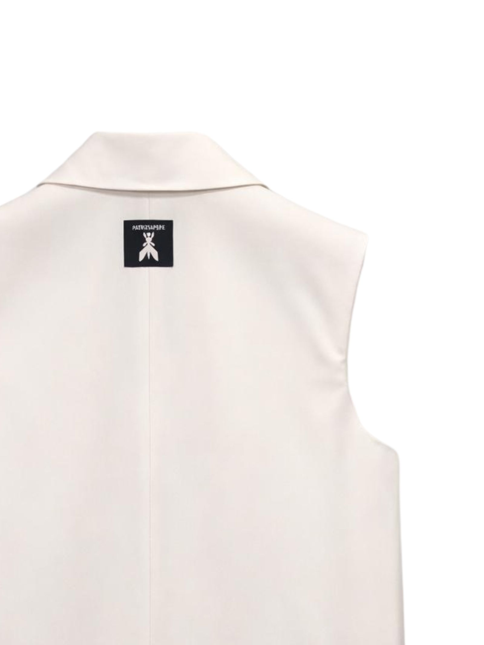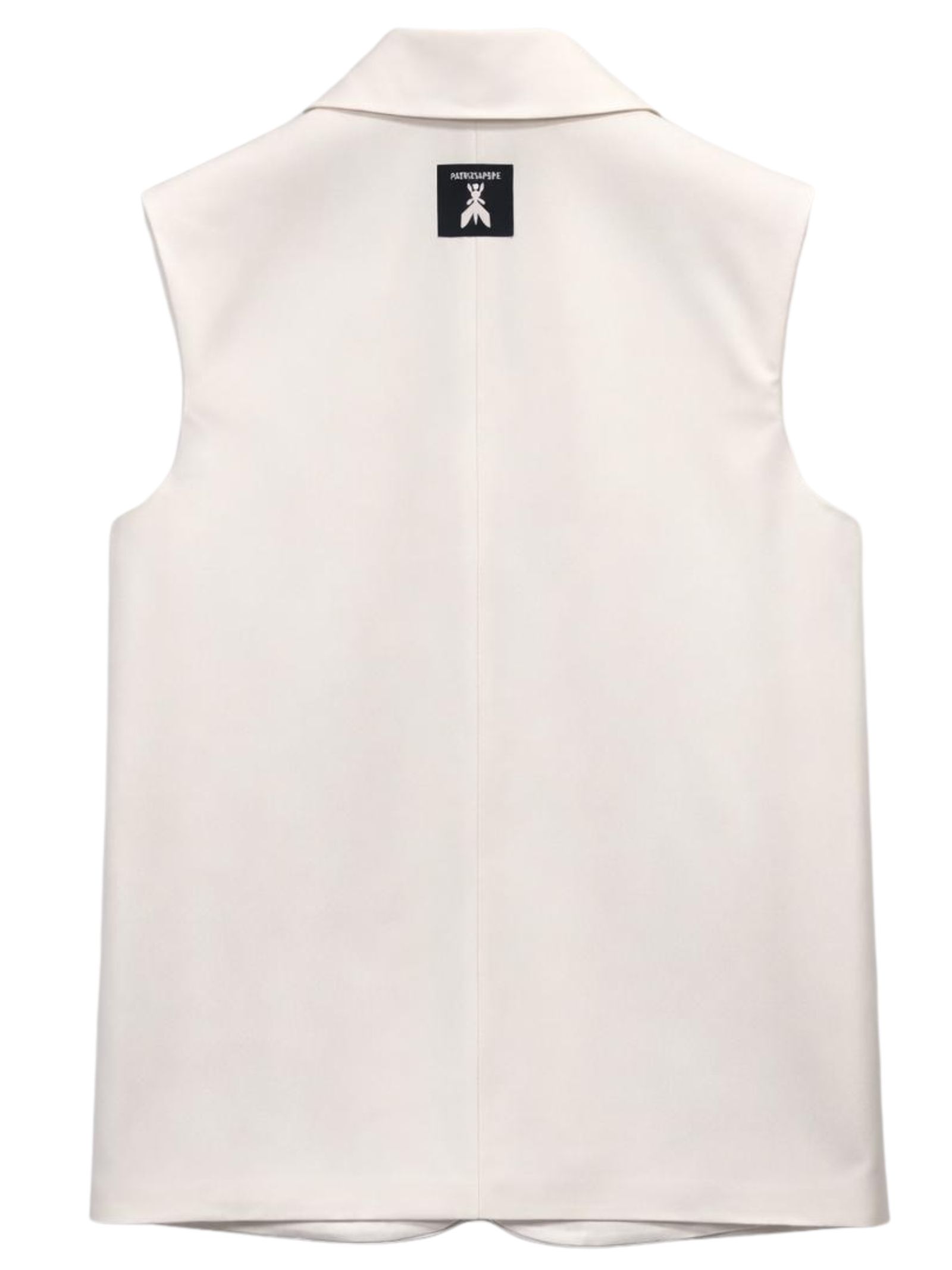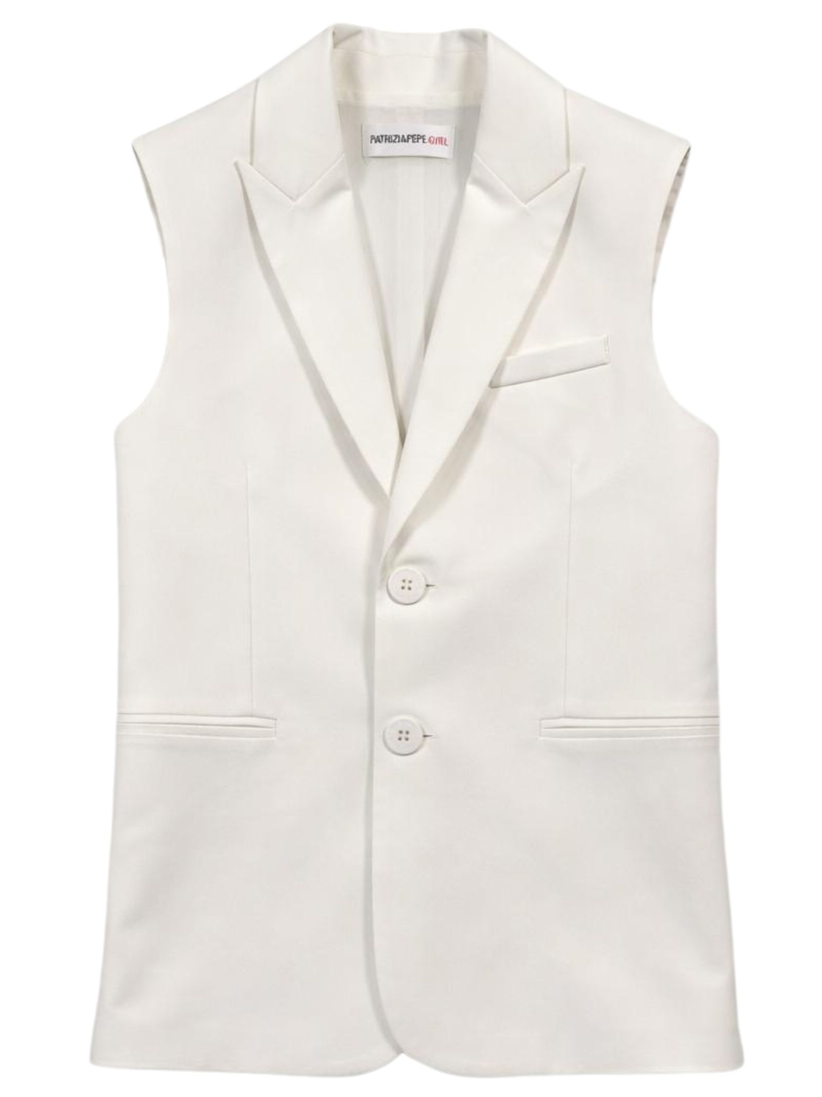 Patrizia Pepe Kids white sleeveless jacket with peak collar, three front slit pockets, logo patch on the back, regular fit. Composition: 95% polyester 5% elastane. Lining: 100% polyester. Made in Italy.