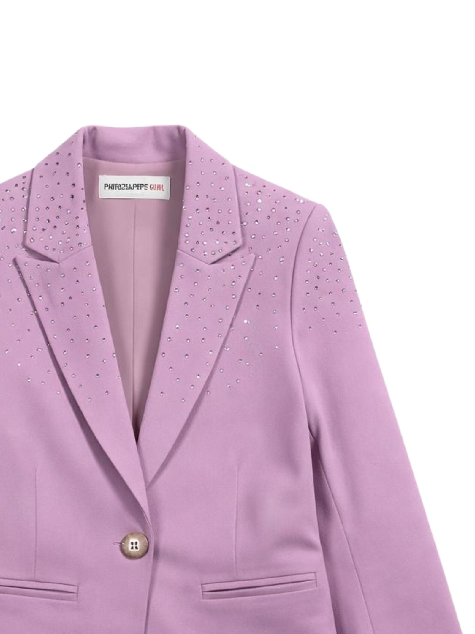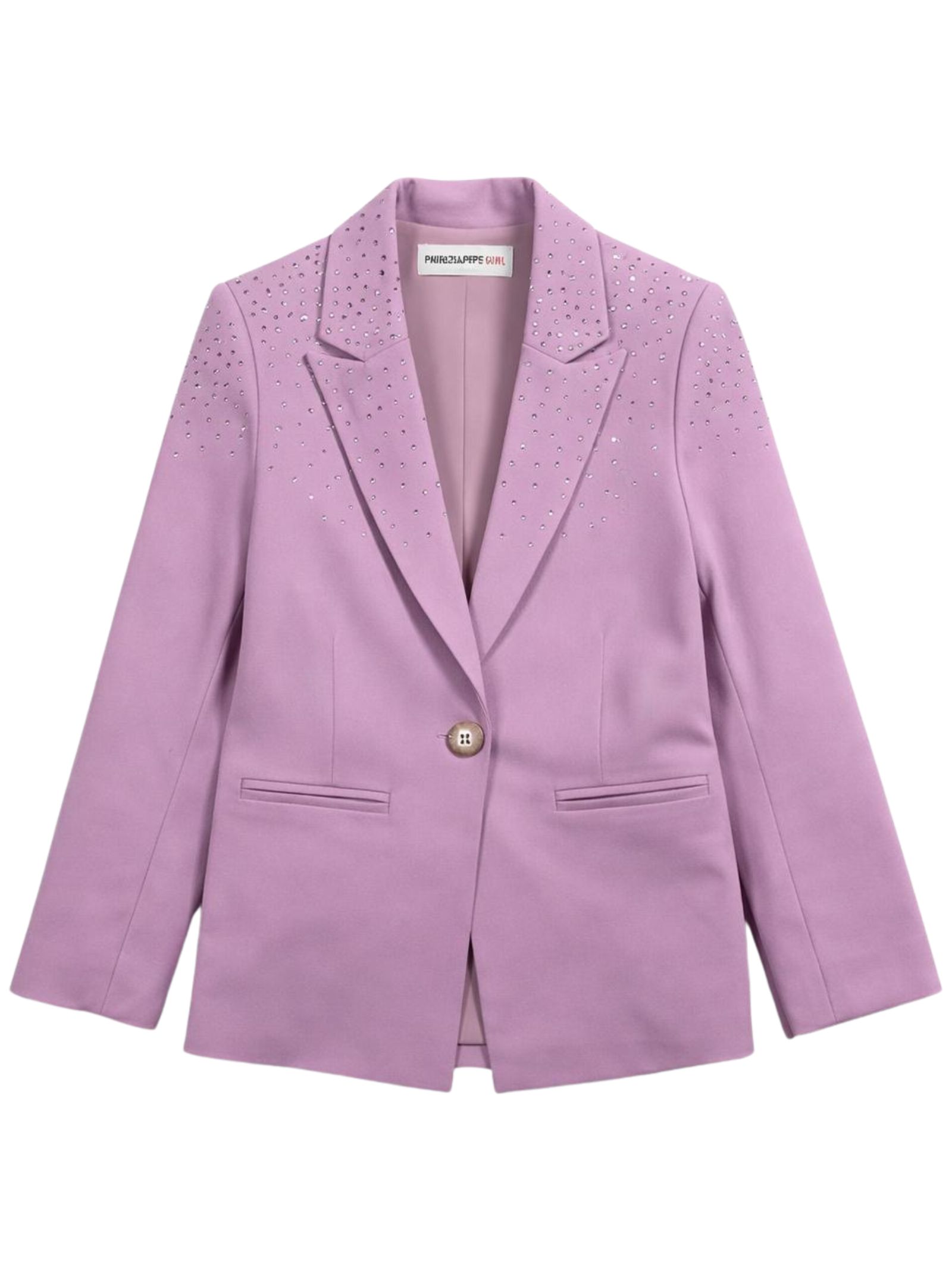 Patrizia Pepe Kids lilac jacket with multicolor rhinestone appliqué detail, peak collar, two front pockets, regular fit. Composition: 95% polyester 5% elastane. Lining: 100% polyester. Made in Italy.