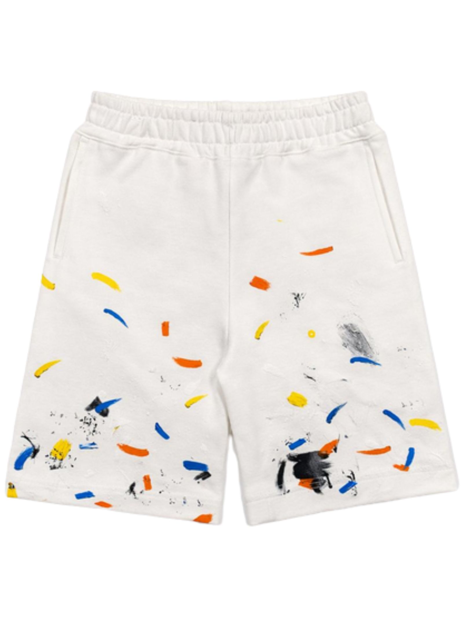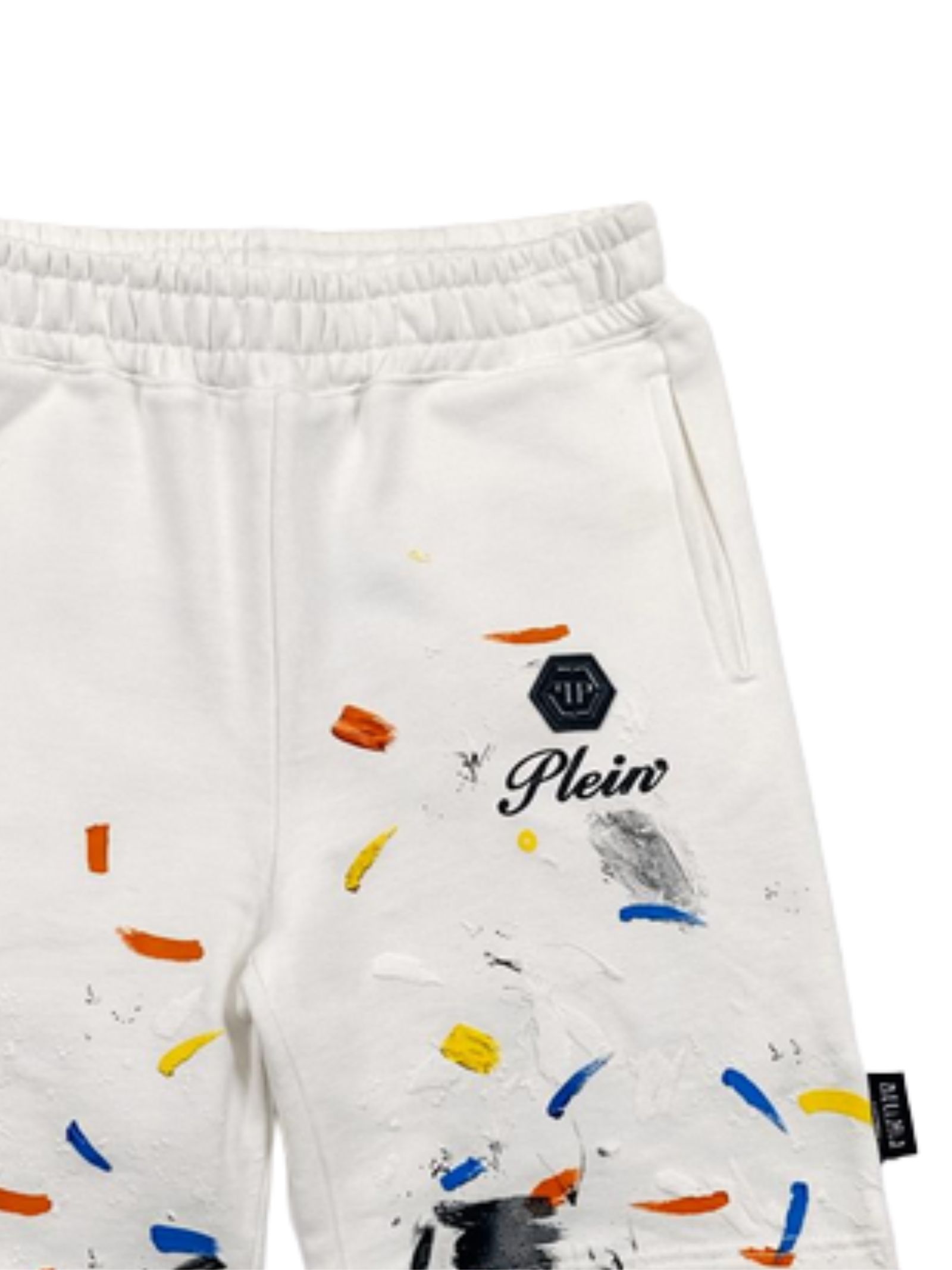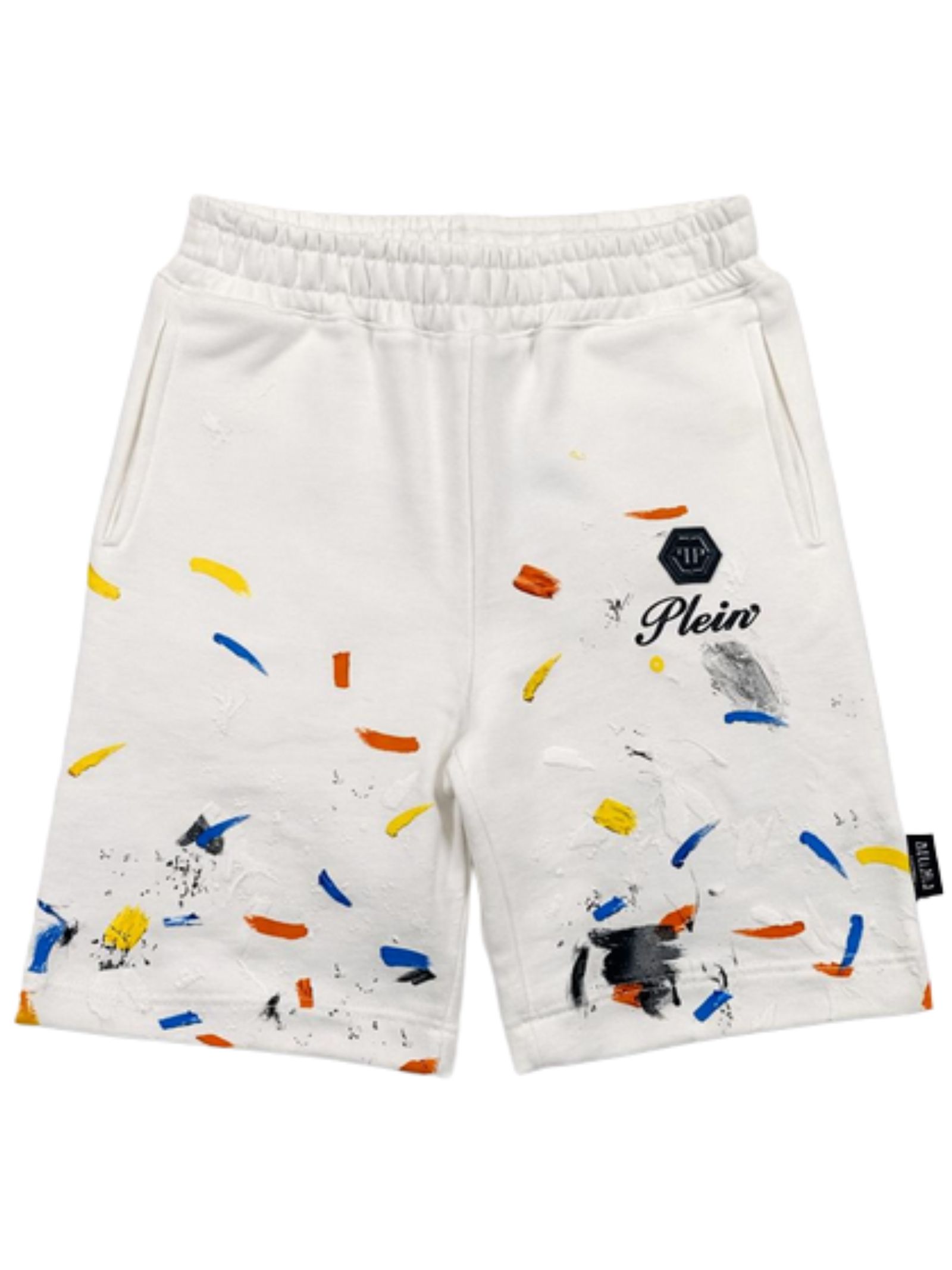 Philipp Plein Kids white Bermuda shorts with contrasting multicolor paint splashes, elastic waistband, two side pockets, logo patch, regular fit. Composition: 100% cotton. Made in Italy.
