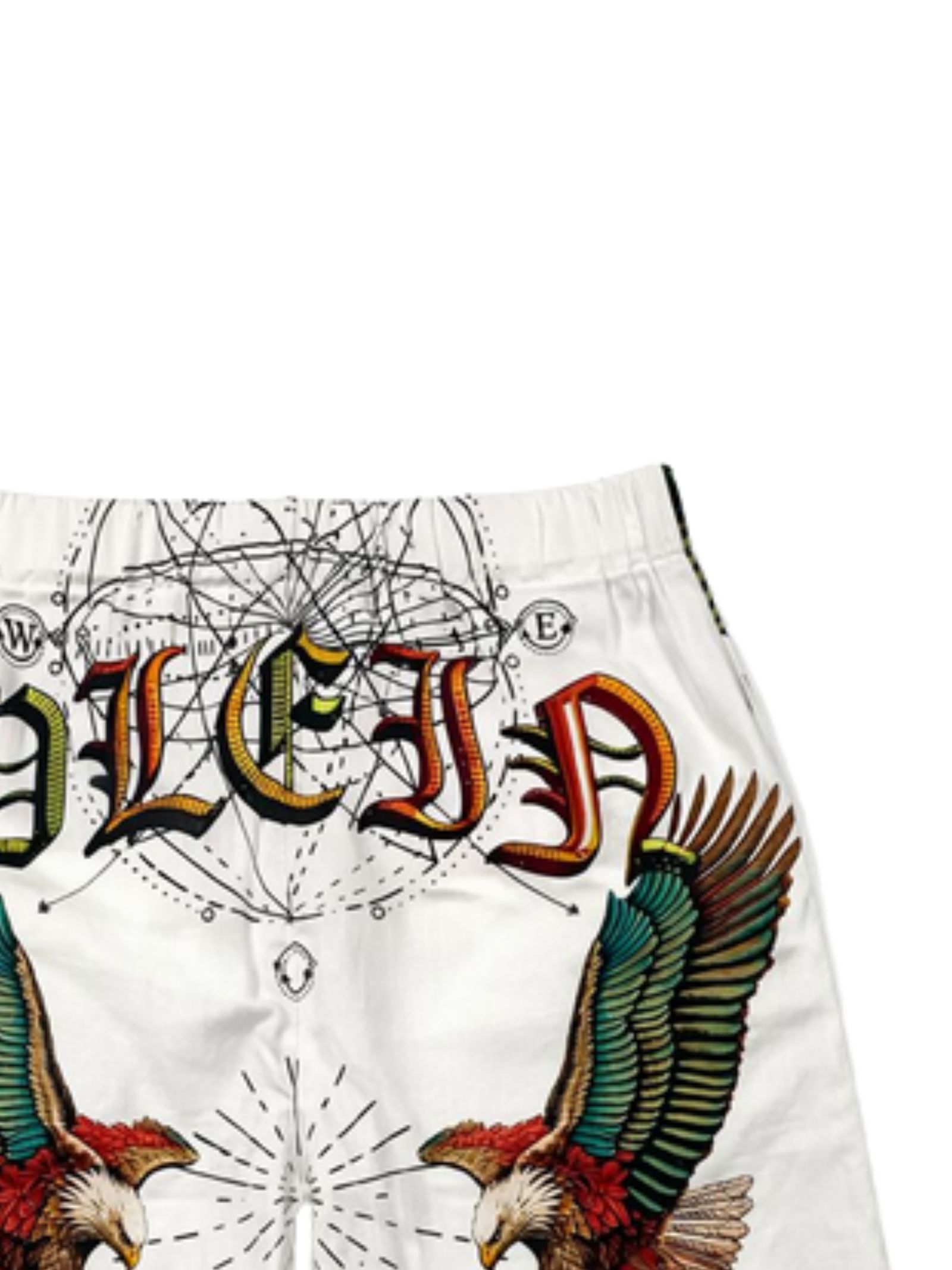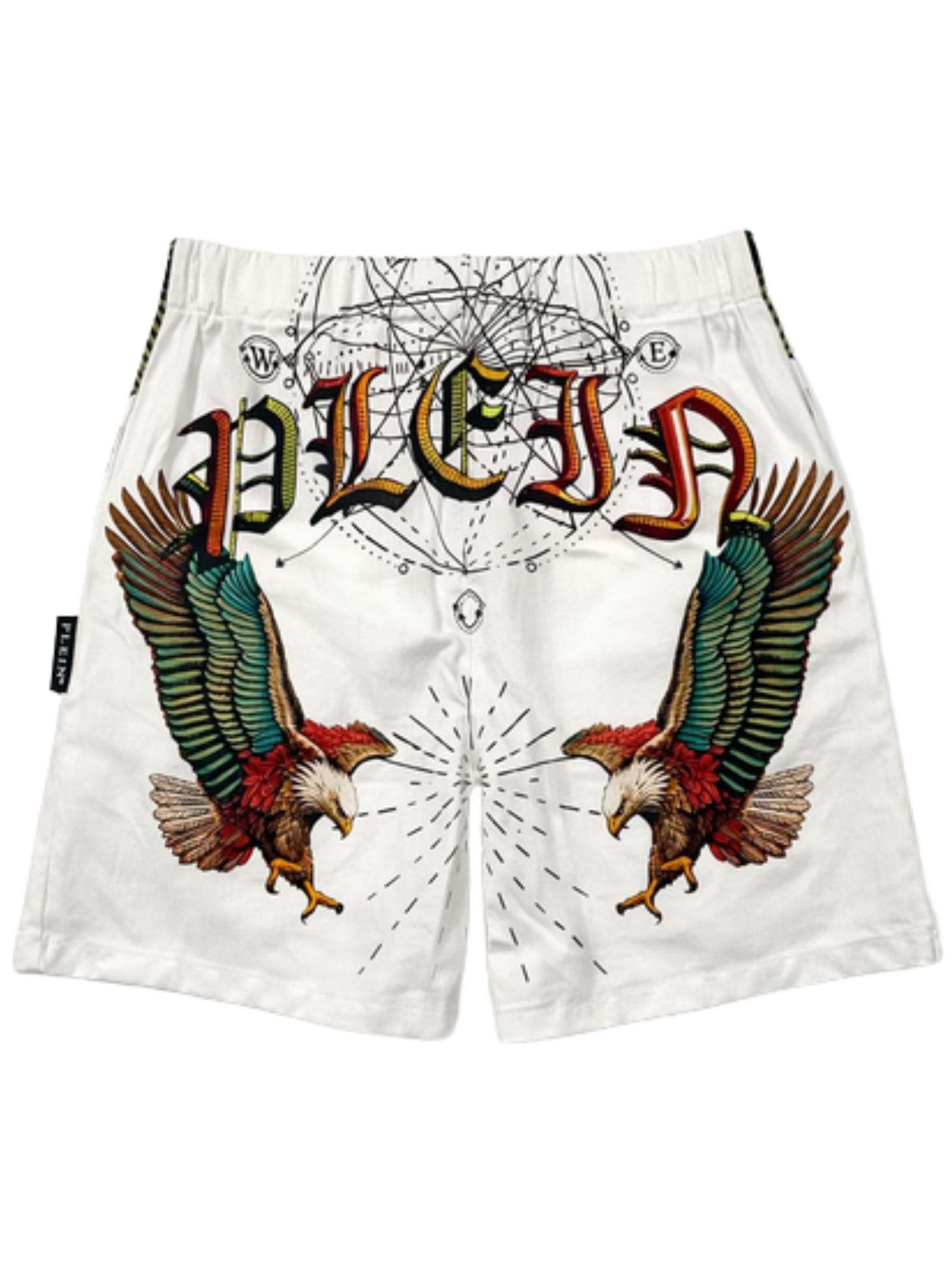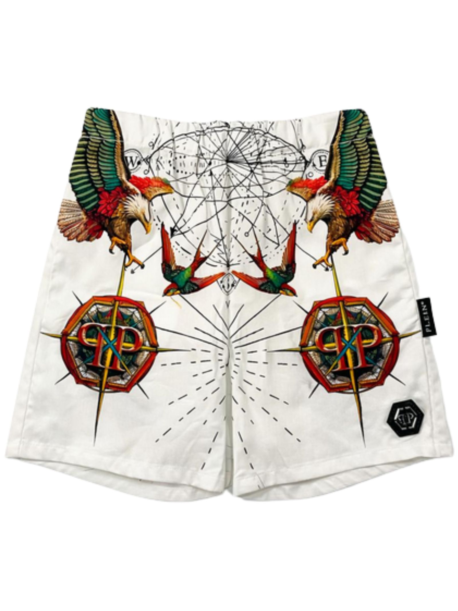 Philipp Plein Kids white Bermuda shorts with an all-over contrasting multicolor print, an elastic waistband, two side pockets, and a regular fit. Composition: 100% cotton. Made in Italy.