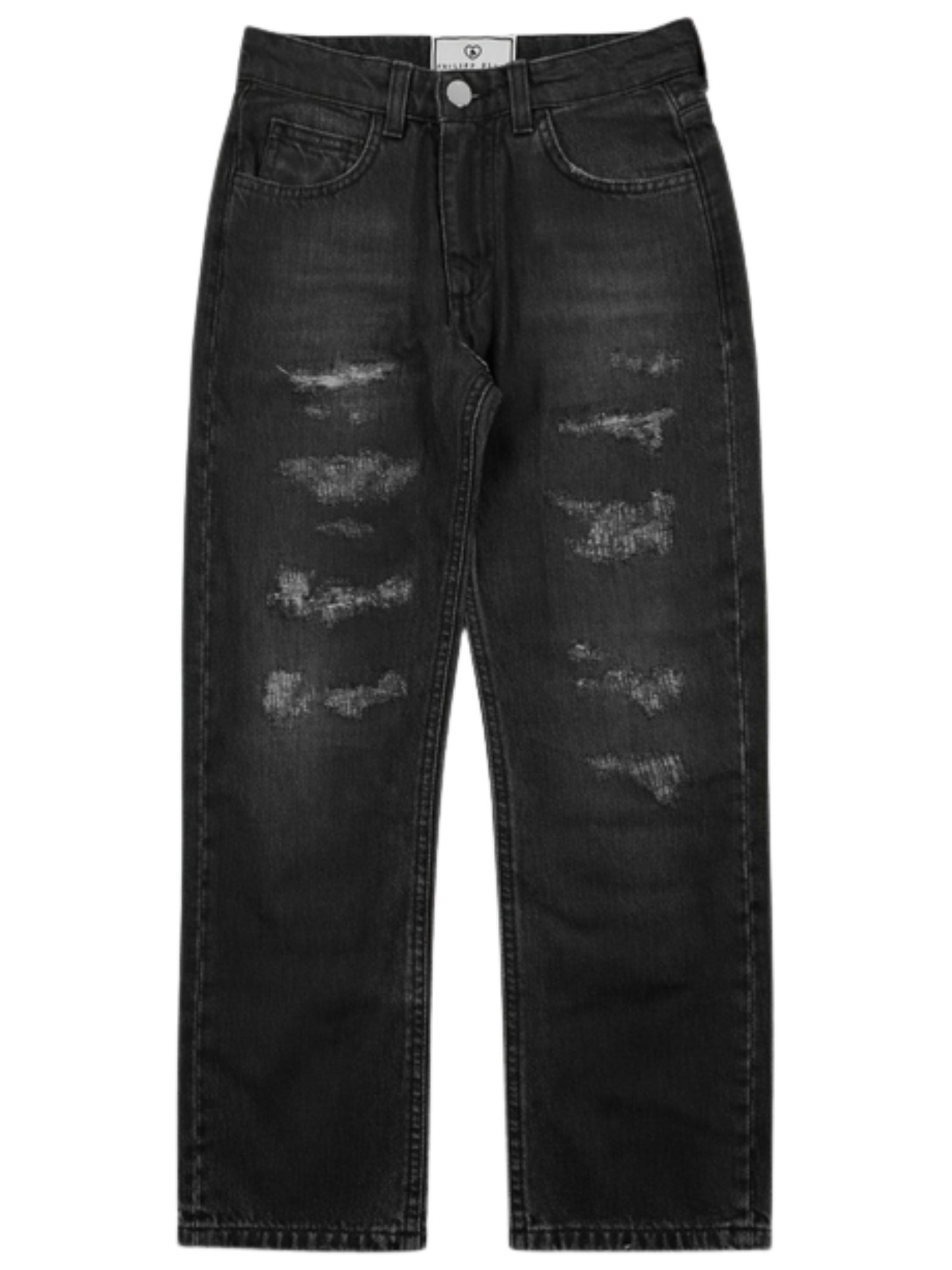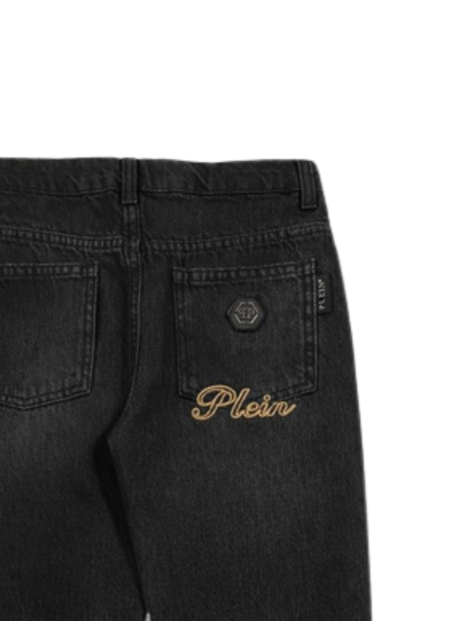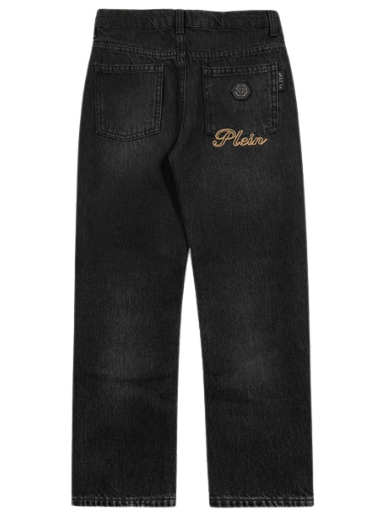 Philipp Plein Kids black jeans, faded wash, five-pocket styling, belt loops, ripped detail, logo patch, straight leg, regular fit. Composition: 100% cotton. Made in Italy.