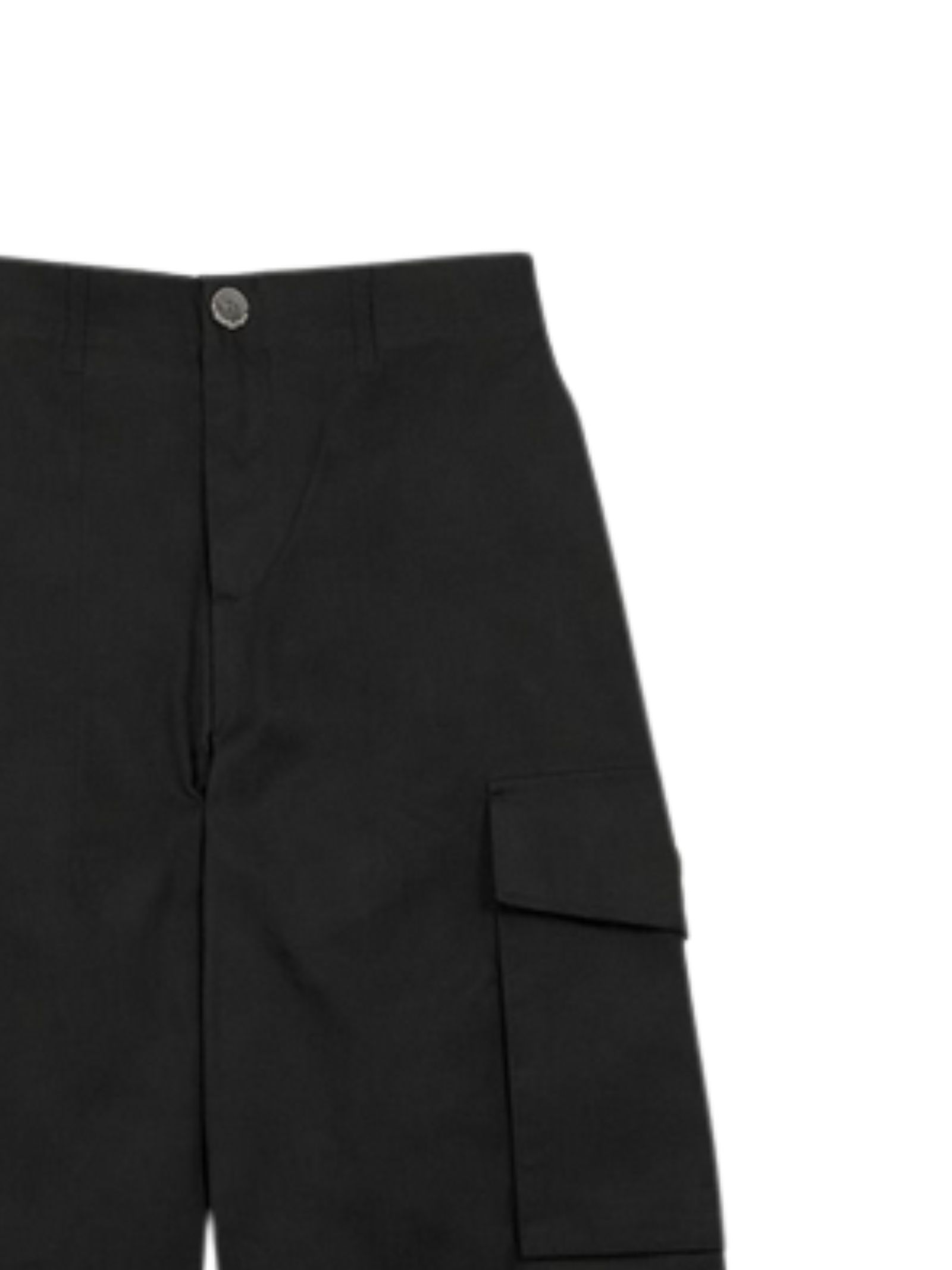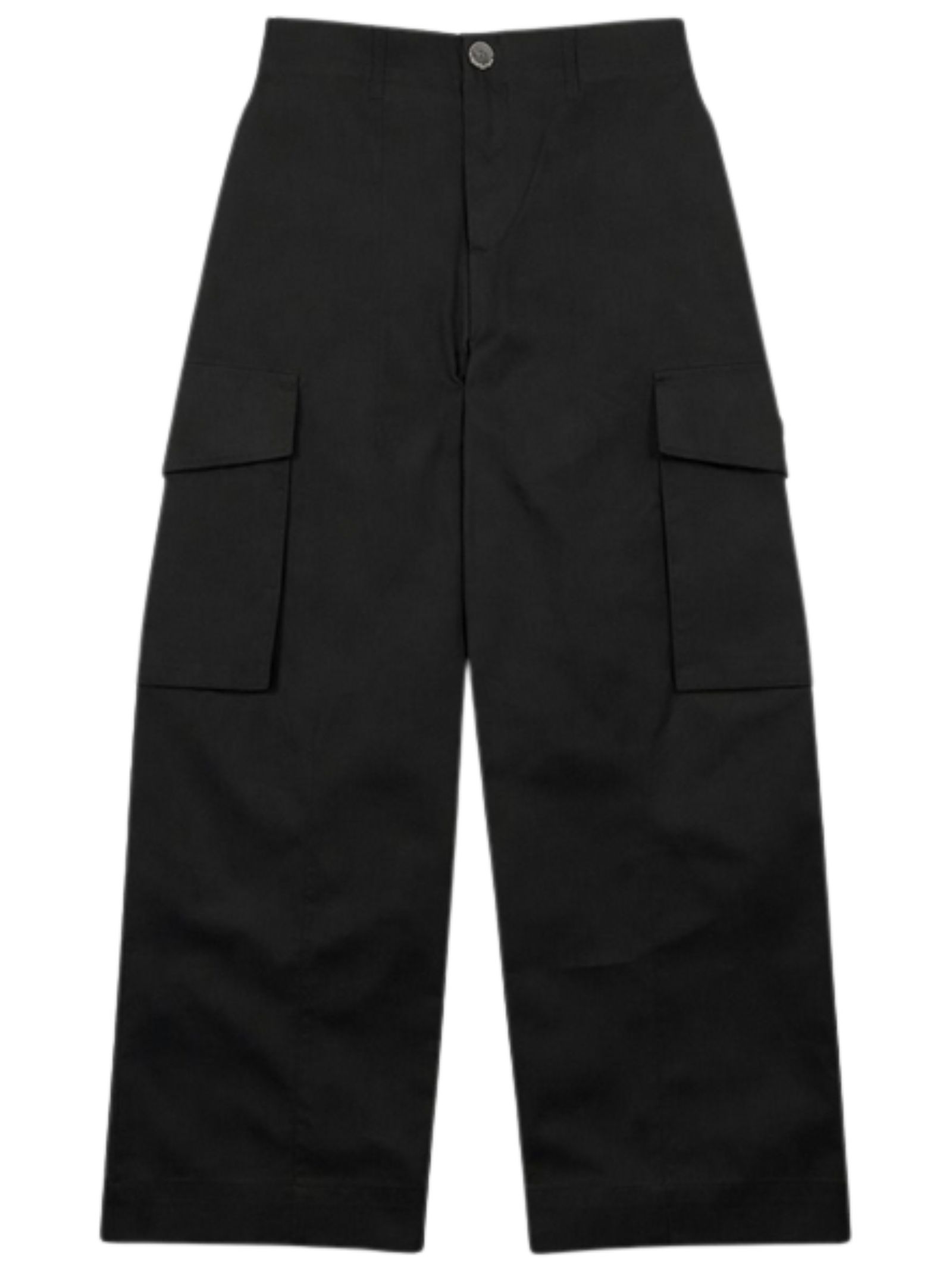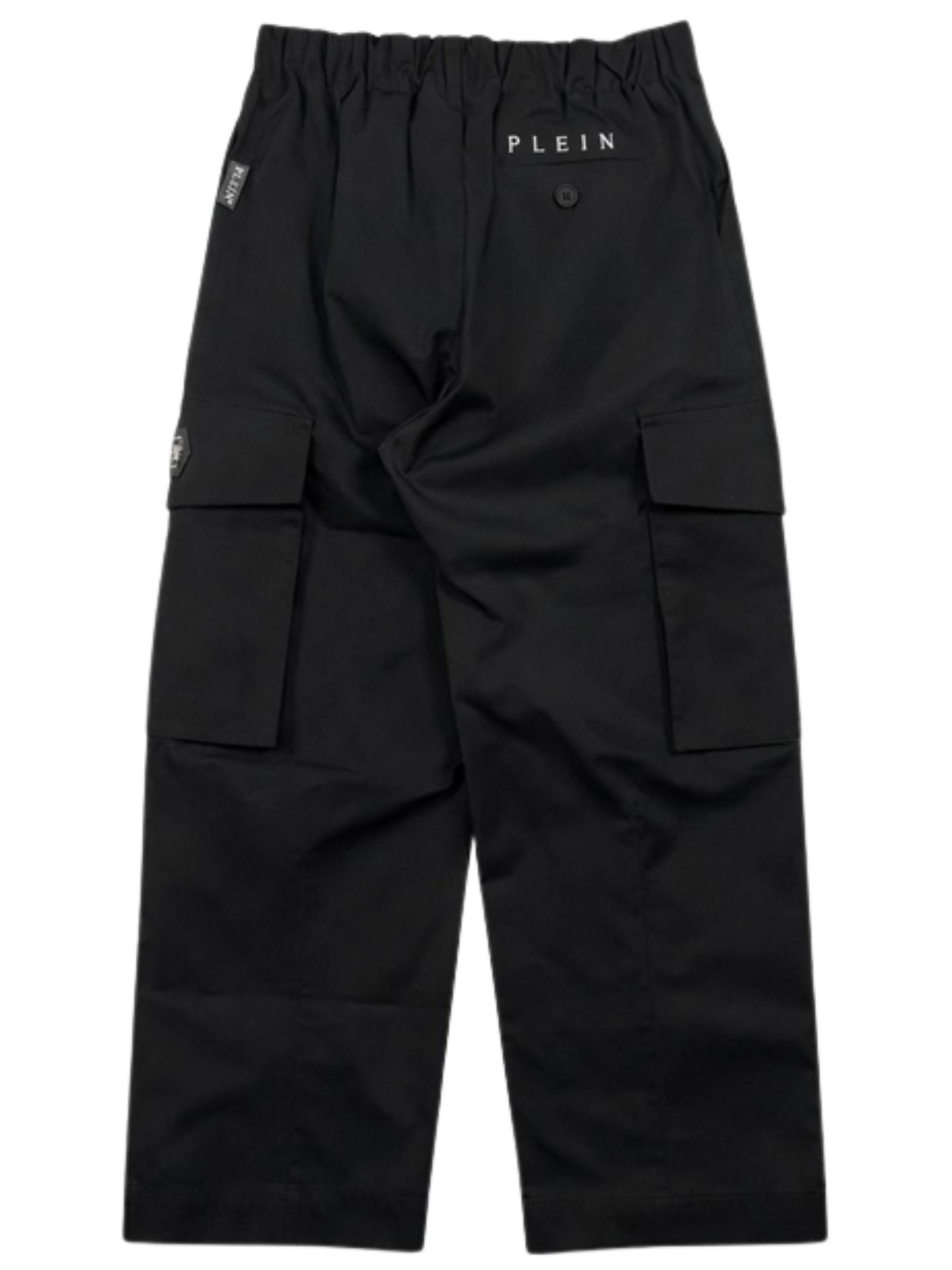 Philipp Plein Kids black trousers, regular waist with elastic back, button and zip closure, two patch cargo pockets, two side pockets, one back pocket, logo patch, wide leg fit. Composition: 97% cotton, 3% elastane. Made in Italy.