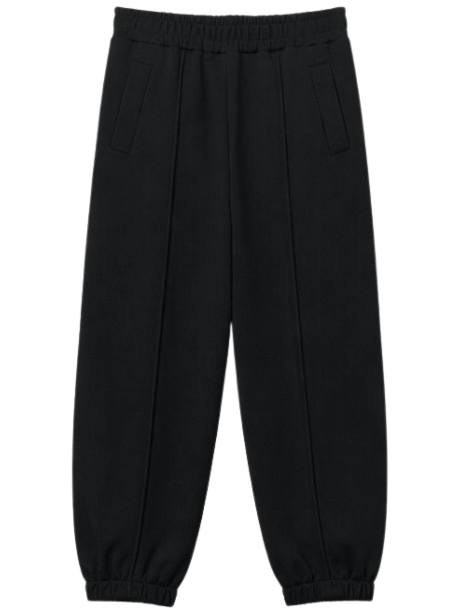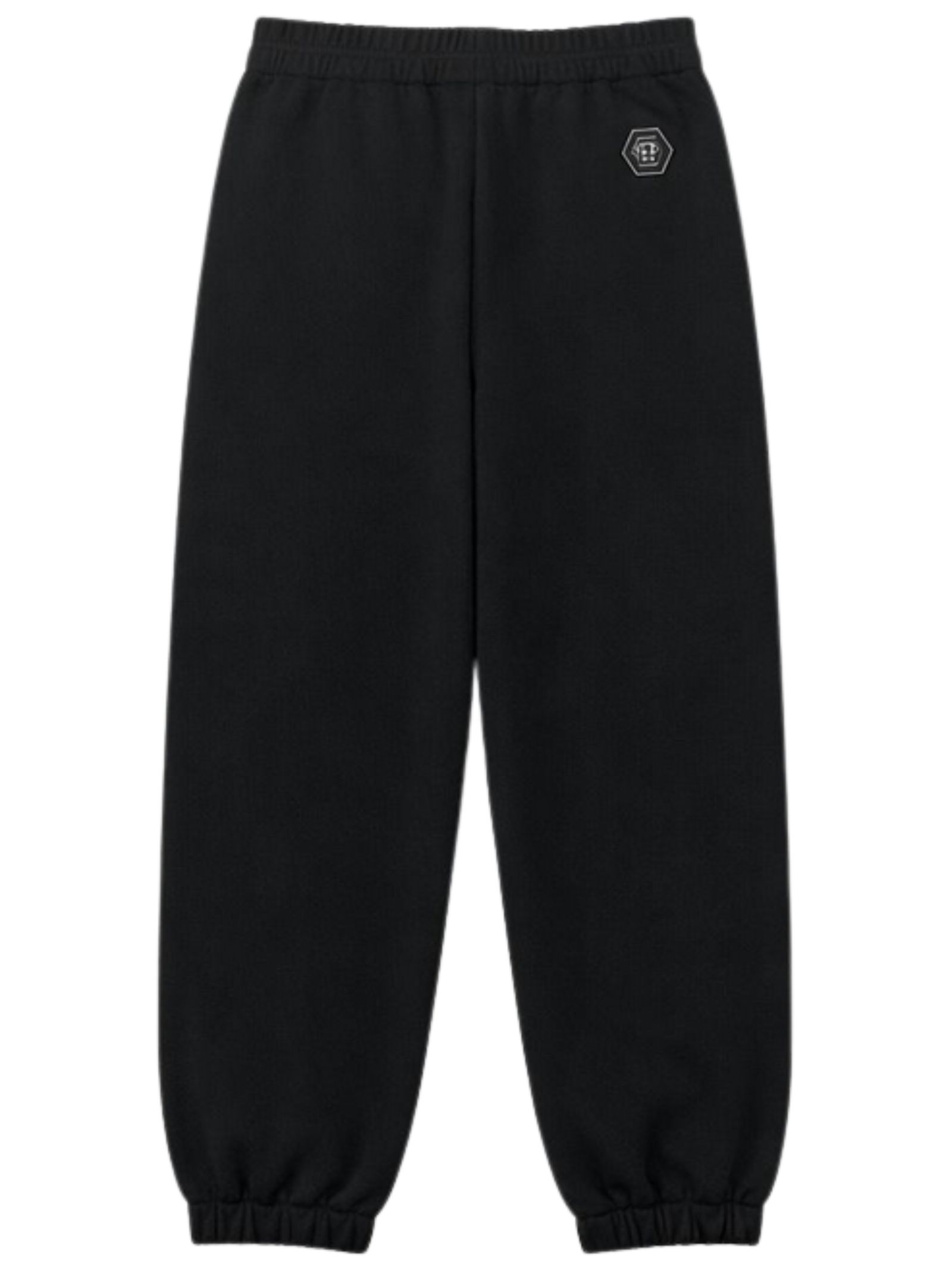 Philipp Plein Kids black trousers with an elastic waistband, two side pockets, a logo patch on the back, elasticated ankles, and a regular fit. Composition: 100% cotton. Made in Italy.