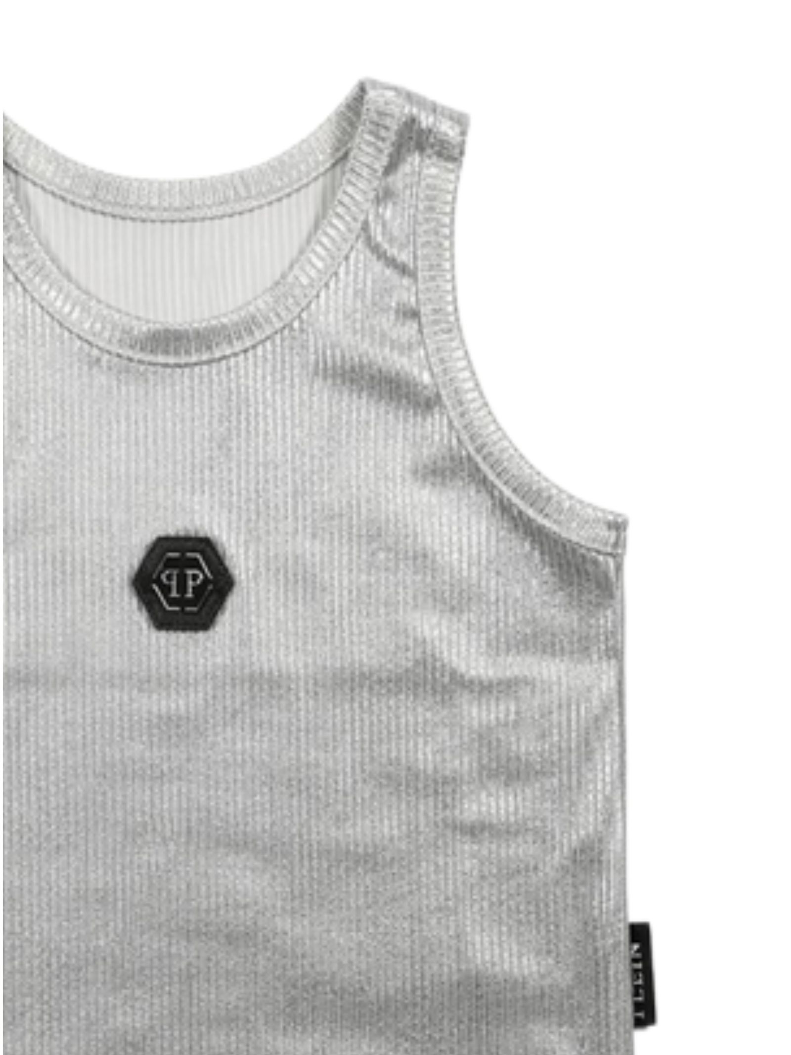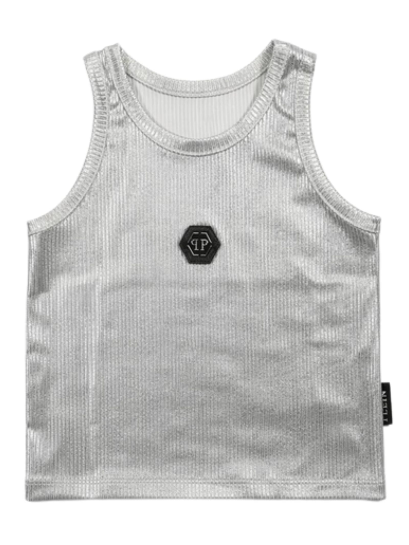 Philipp Plein Kids silver tank top, ribbed fabric, cropped design, crew neck, logo patch, slim fit. Composition: 100% cotton.