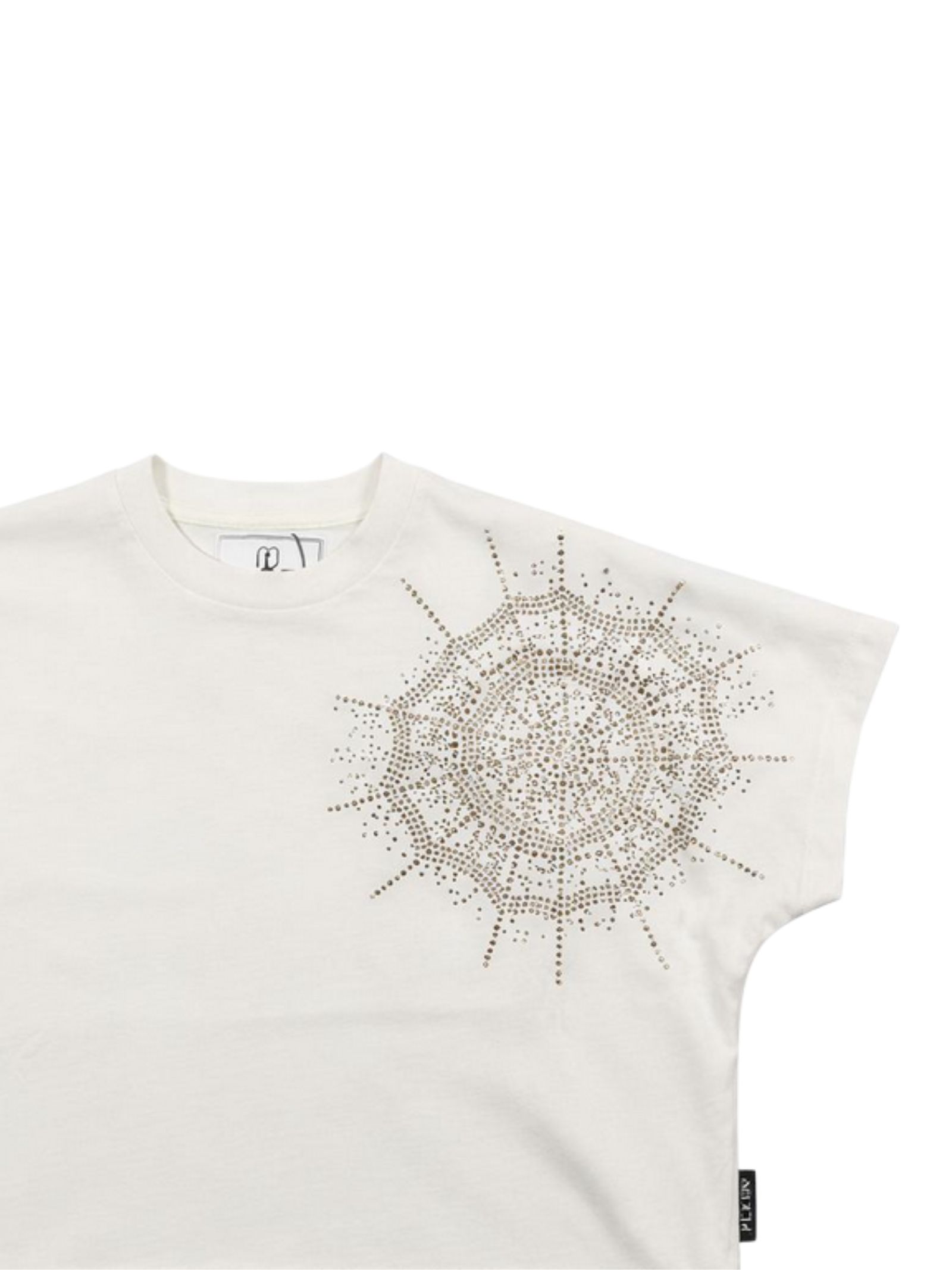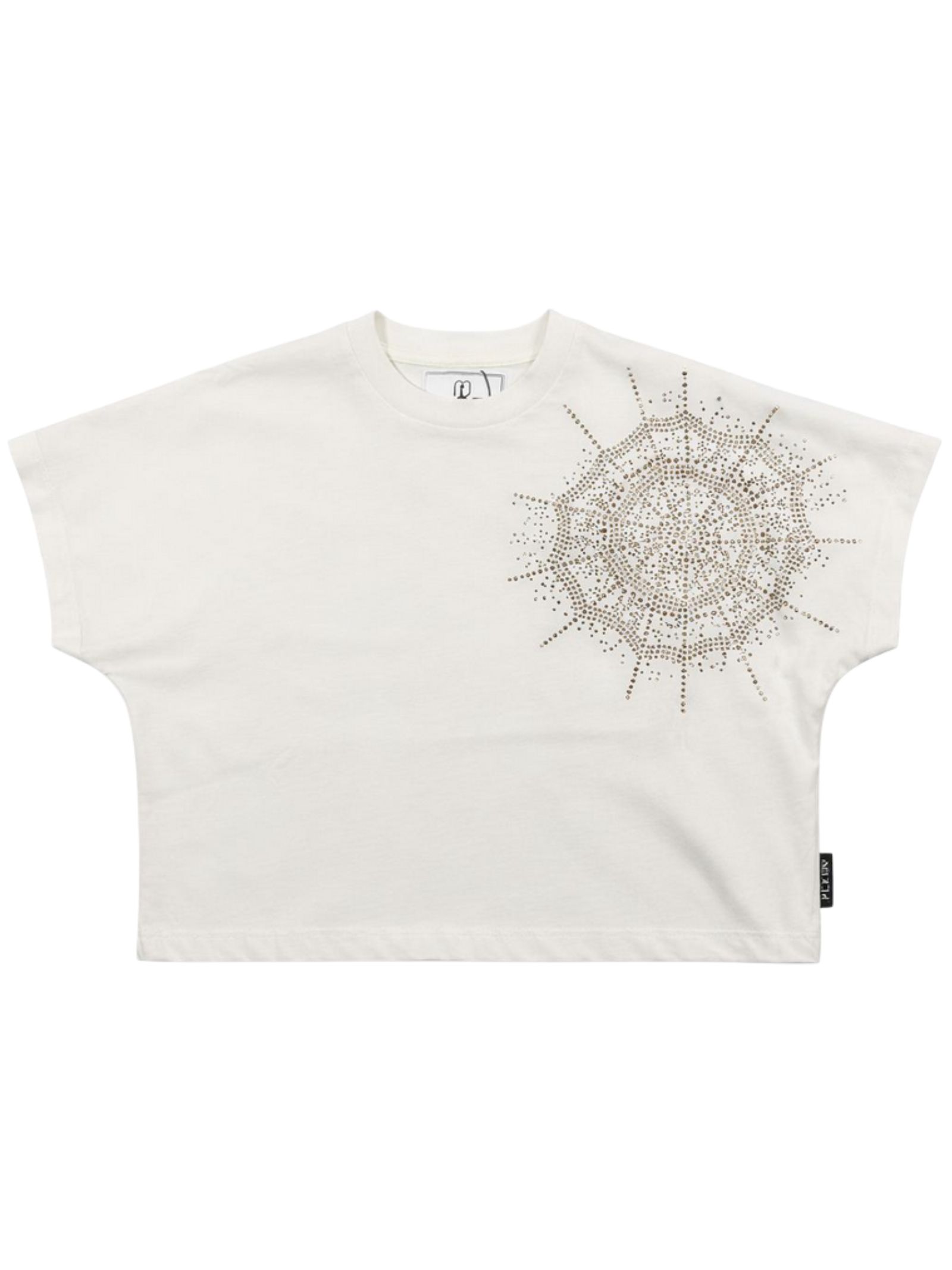 Philipp Plein Kids white cropped T-shirt with rhinestone spiderweb detail, crew neck, short sleeves, logo print on the back, straight hem, loose fit. Composition: 100% cotton.