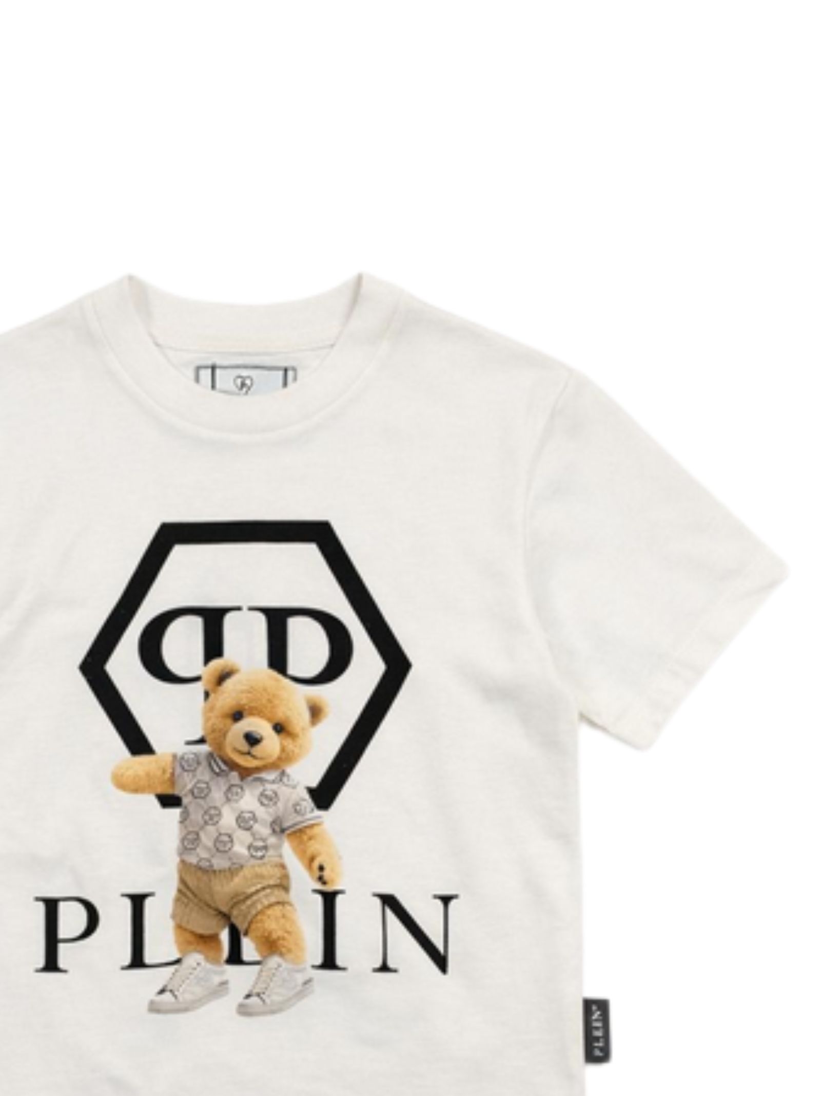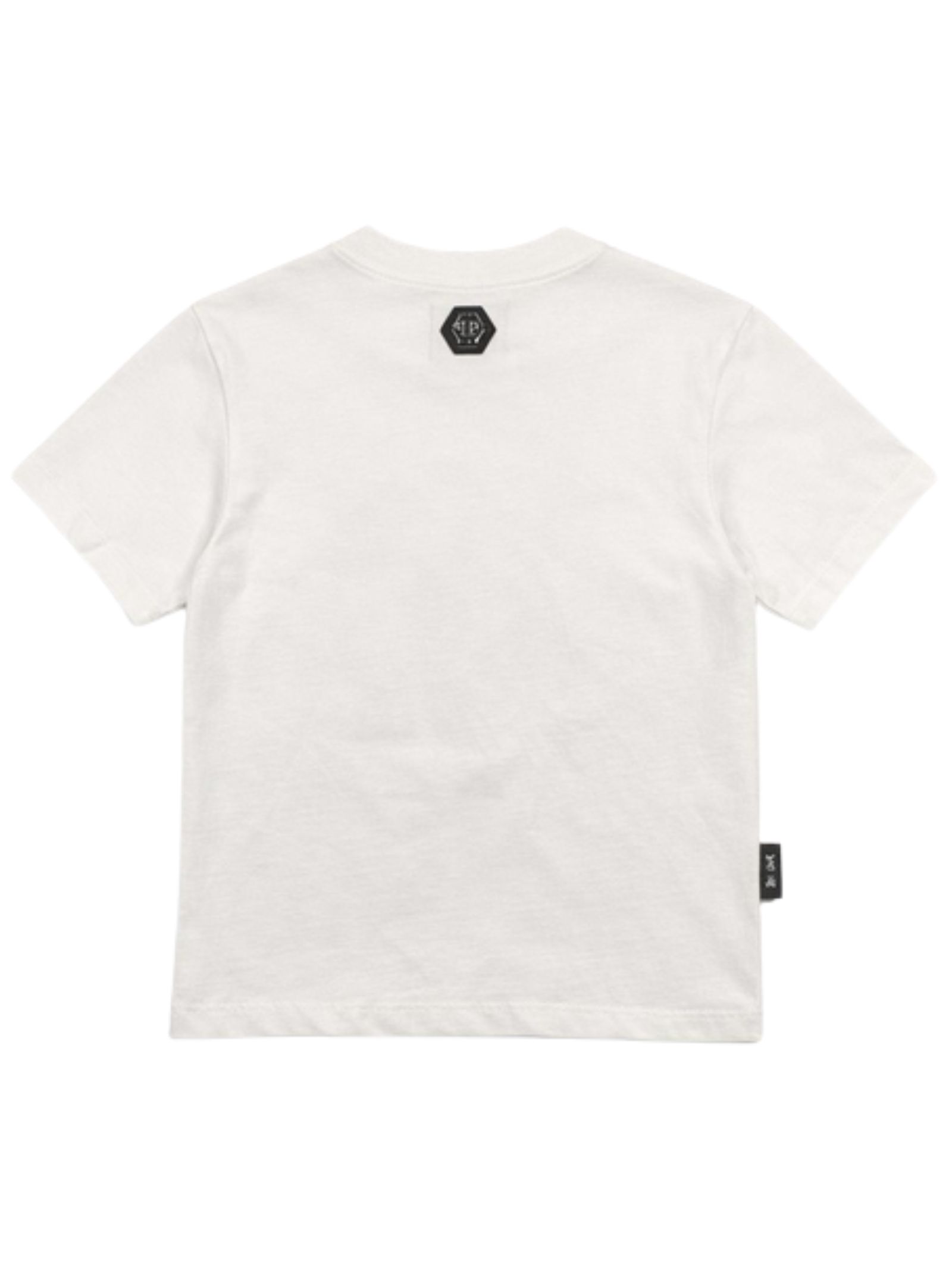 Philipp Plein Kids white T-shirt, crew neck, short sleeves, contrasting rhinestone print, regular fit, straight hem. Composition: 100% cotton.