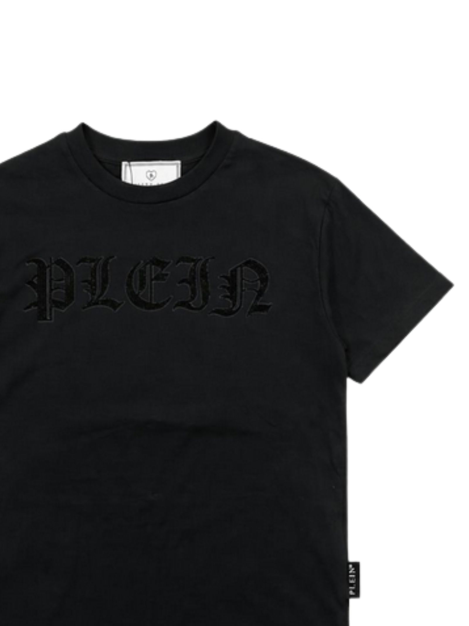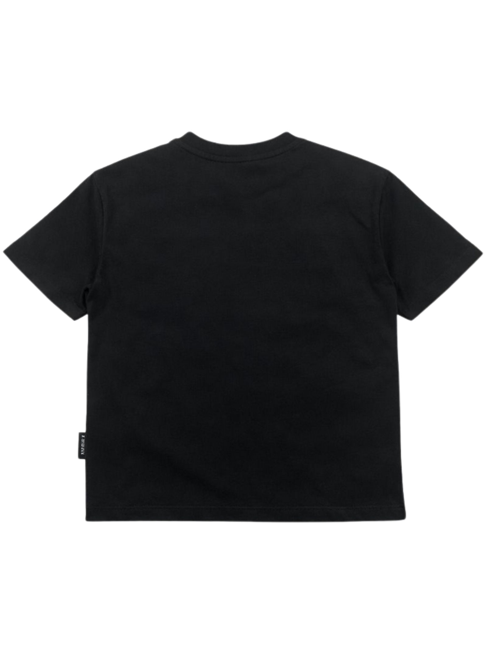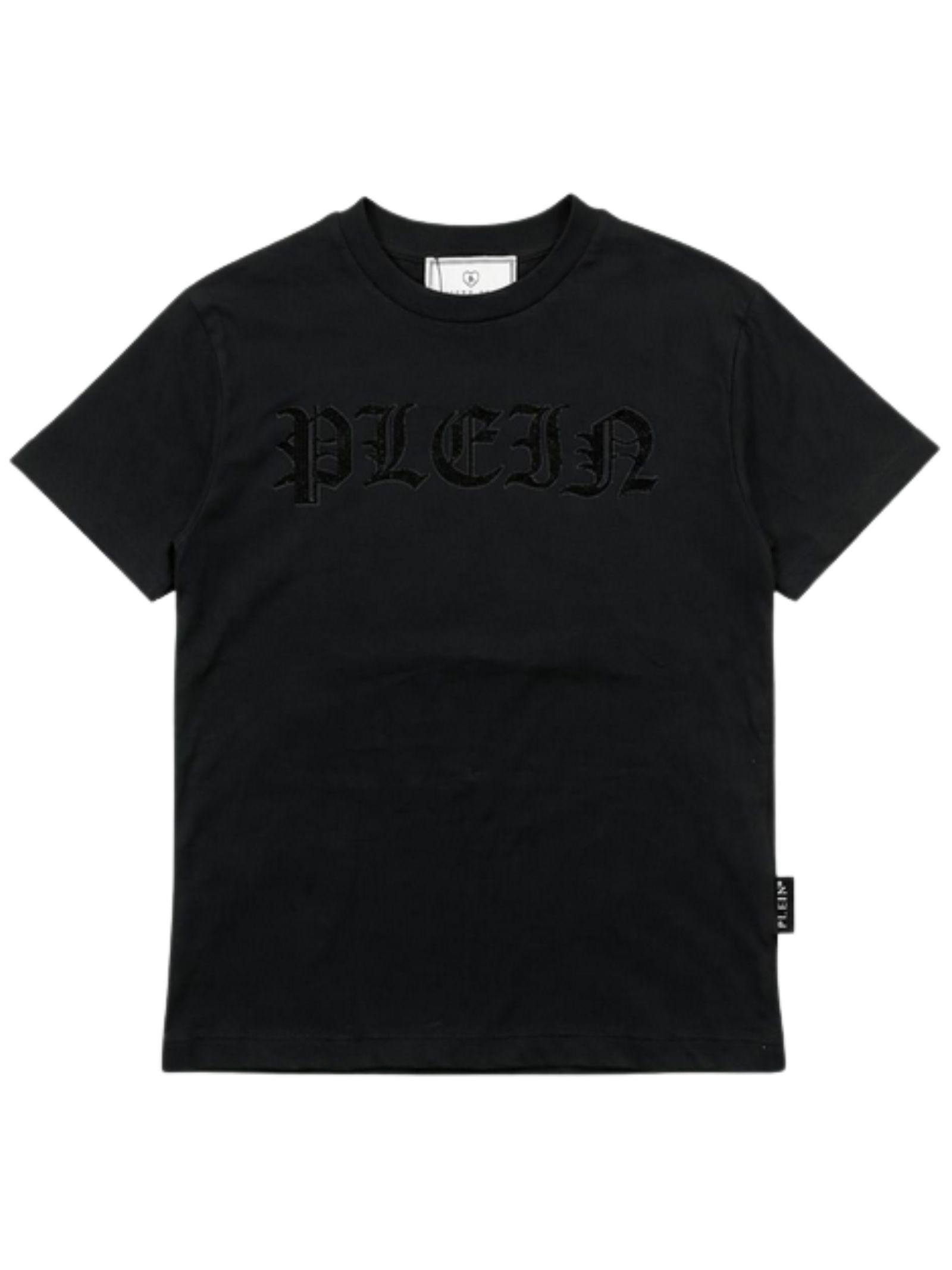 Philipp Plein Kids black T-shirt, crew neck, short sleeves, central rhinestone logo, regular fit, straight hem. Composition: 100% cotton. Made in Italy.