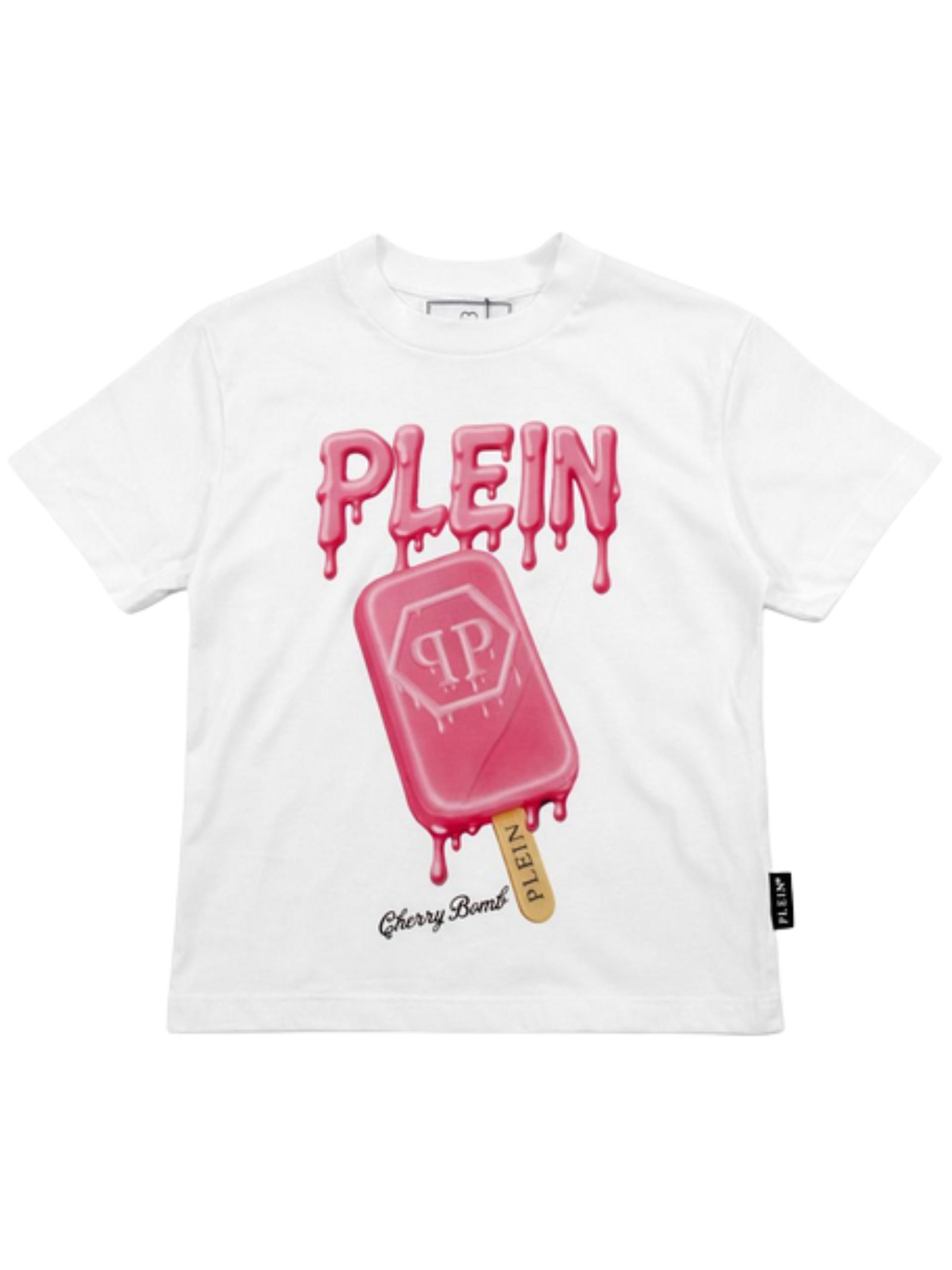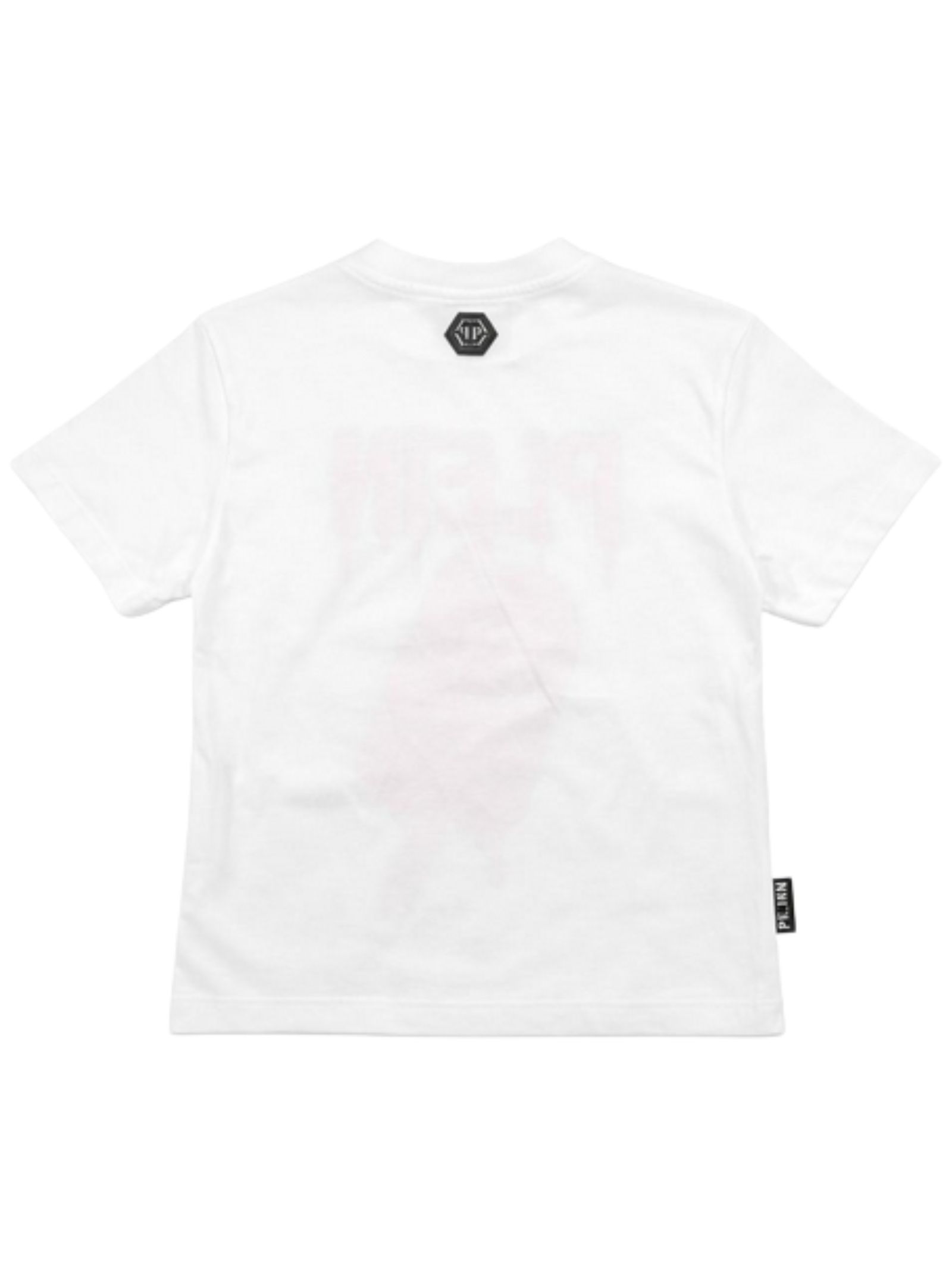 Philipp Plein Kids white T-shirt, crew neck, short sleeves, contrasting logo print at the center, regular fit, straight hem. Composition: 100% cotton. Made in Italy.