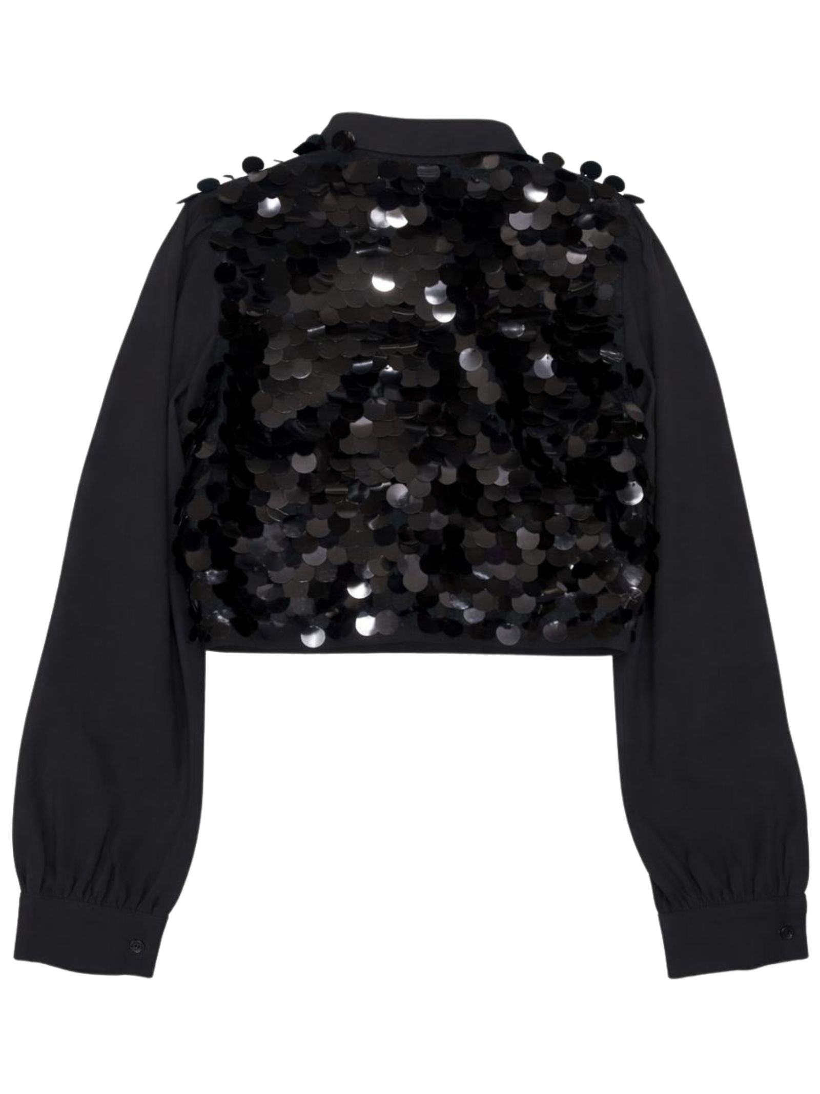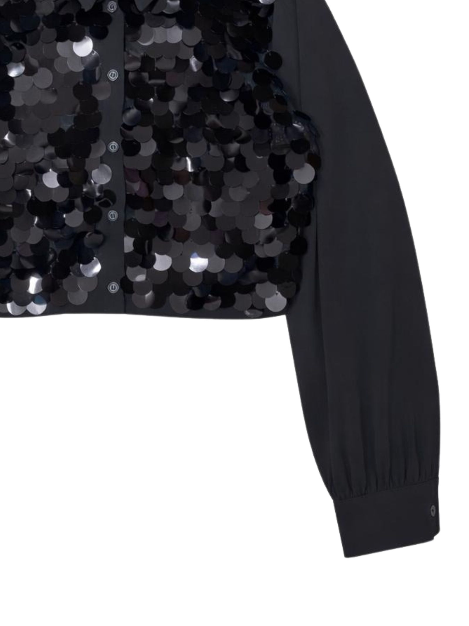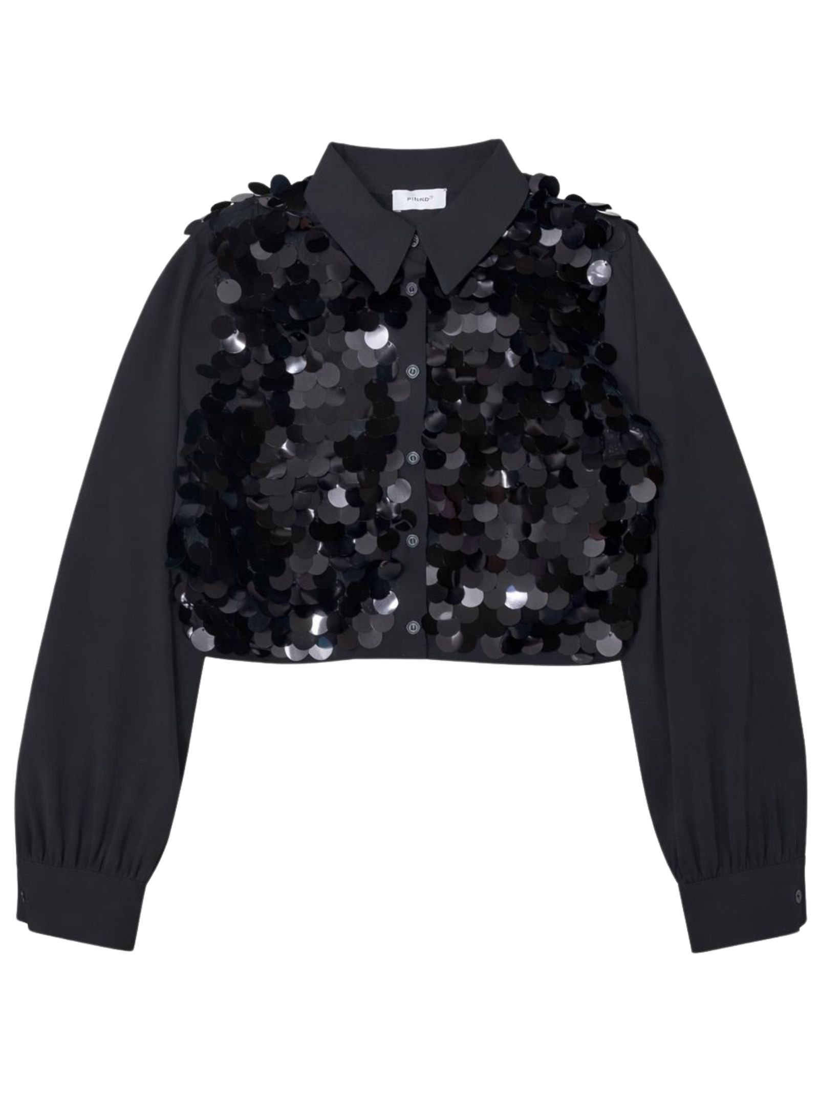 Pinko Kids black sequin-covered shirt, short model, long sleeves with cuffs, regular fit. Composition: 100% polyester. Lining: 100% viscose.