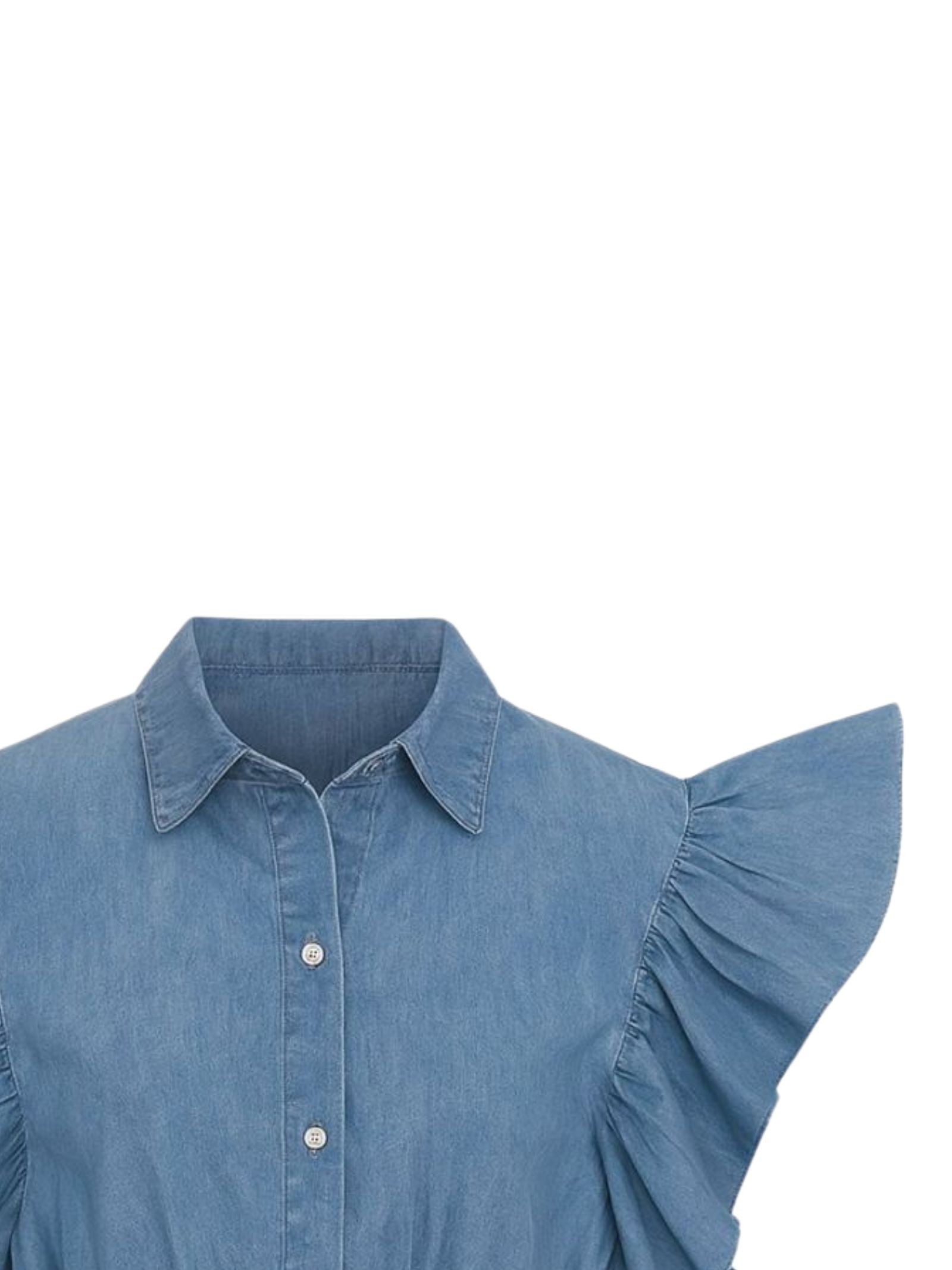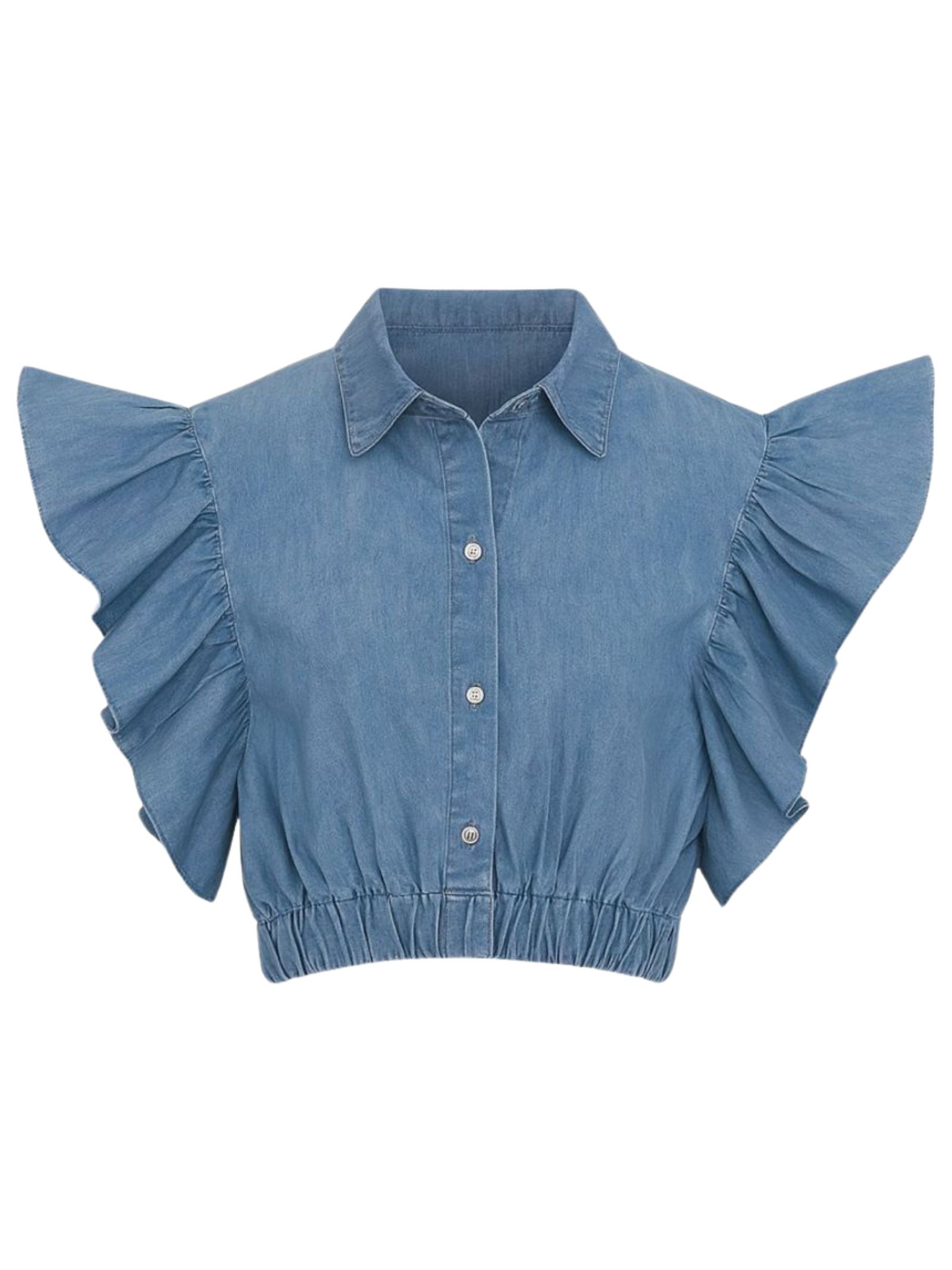 Please Kids shirt made of soft denim-effect blue cotton, short design, short sleeves with ruffles, and elastic hem. Composition: 100% cotton. Made in Italy.