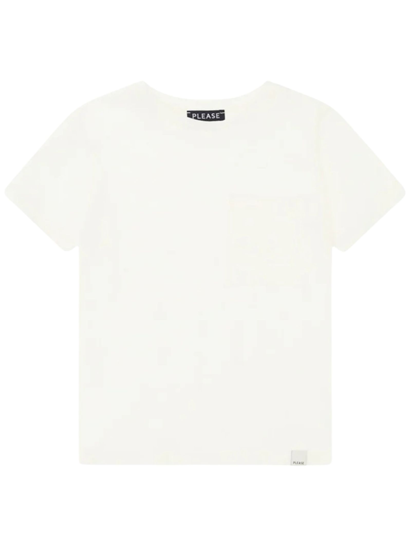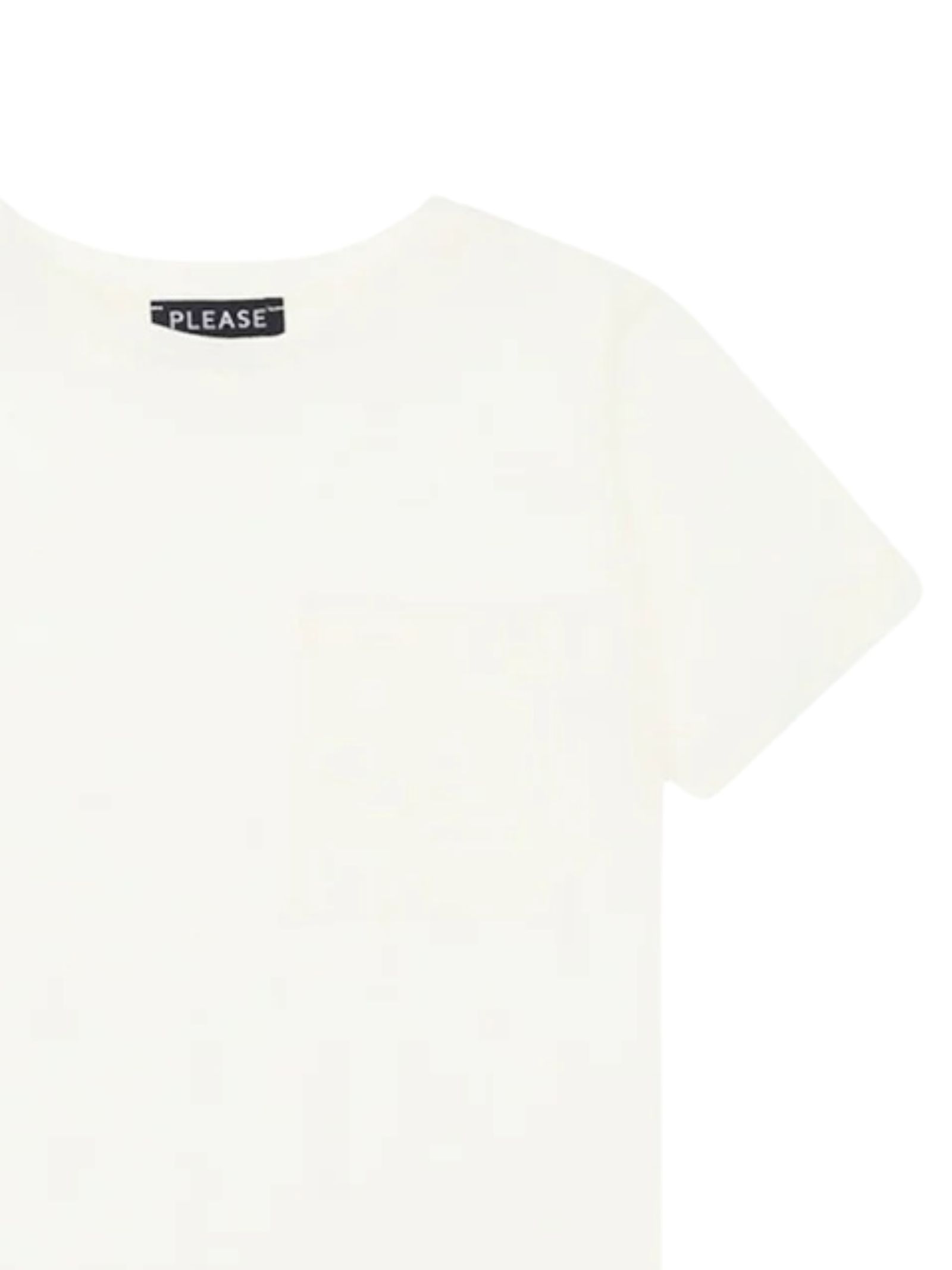Please Kids white T-shirt, made of soft cotton and linen, crew neck, short sleeves, chest pocket, logo patch, straight hem, regular fit. Composition: 70% cotton, 30% linen. Made in Italy.
