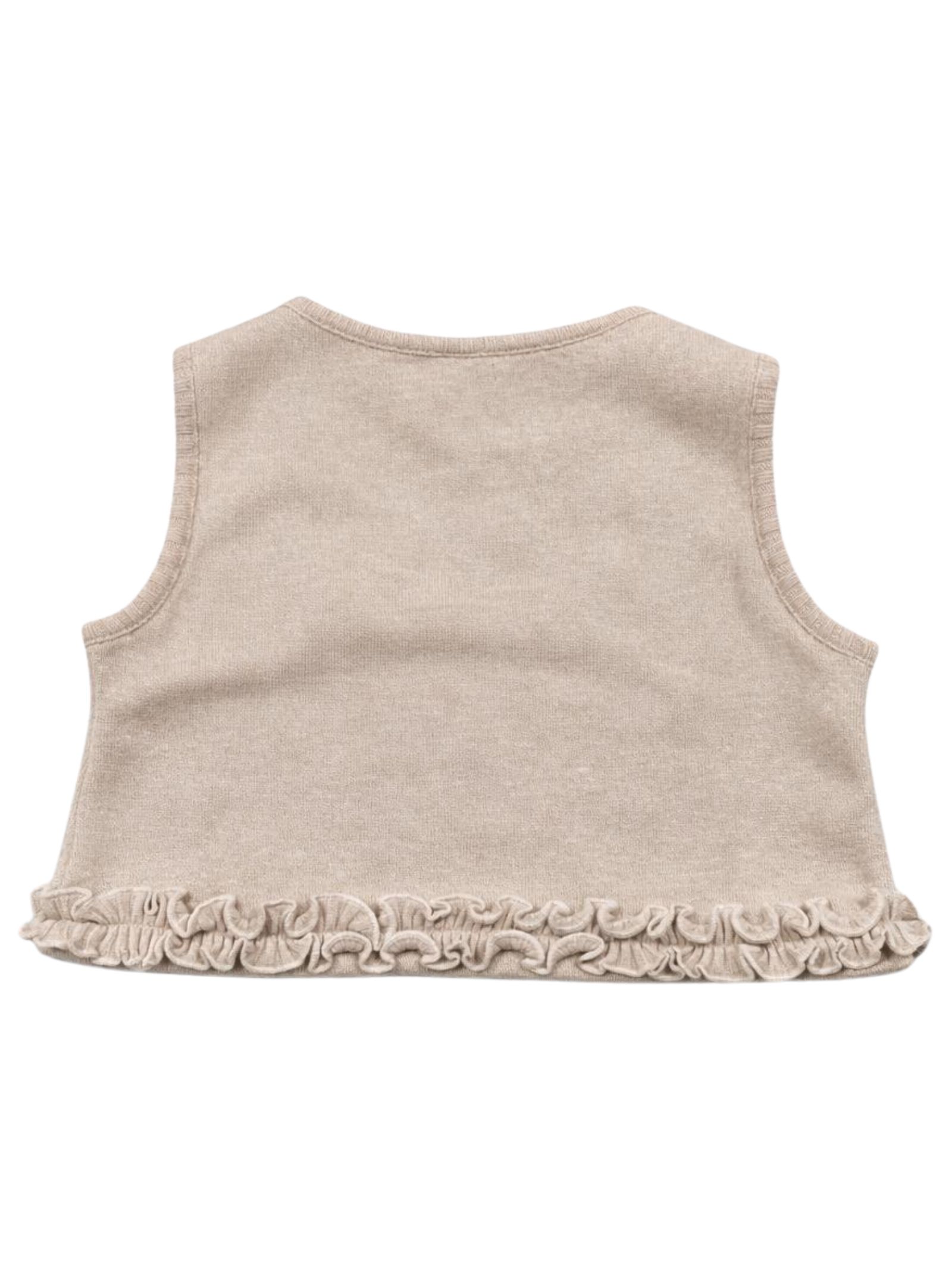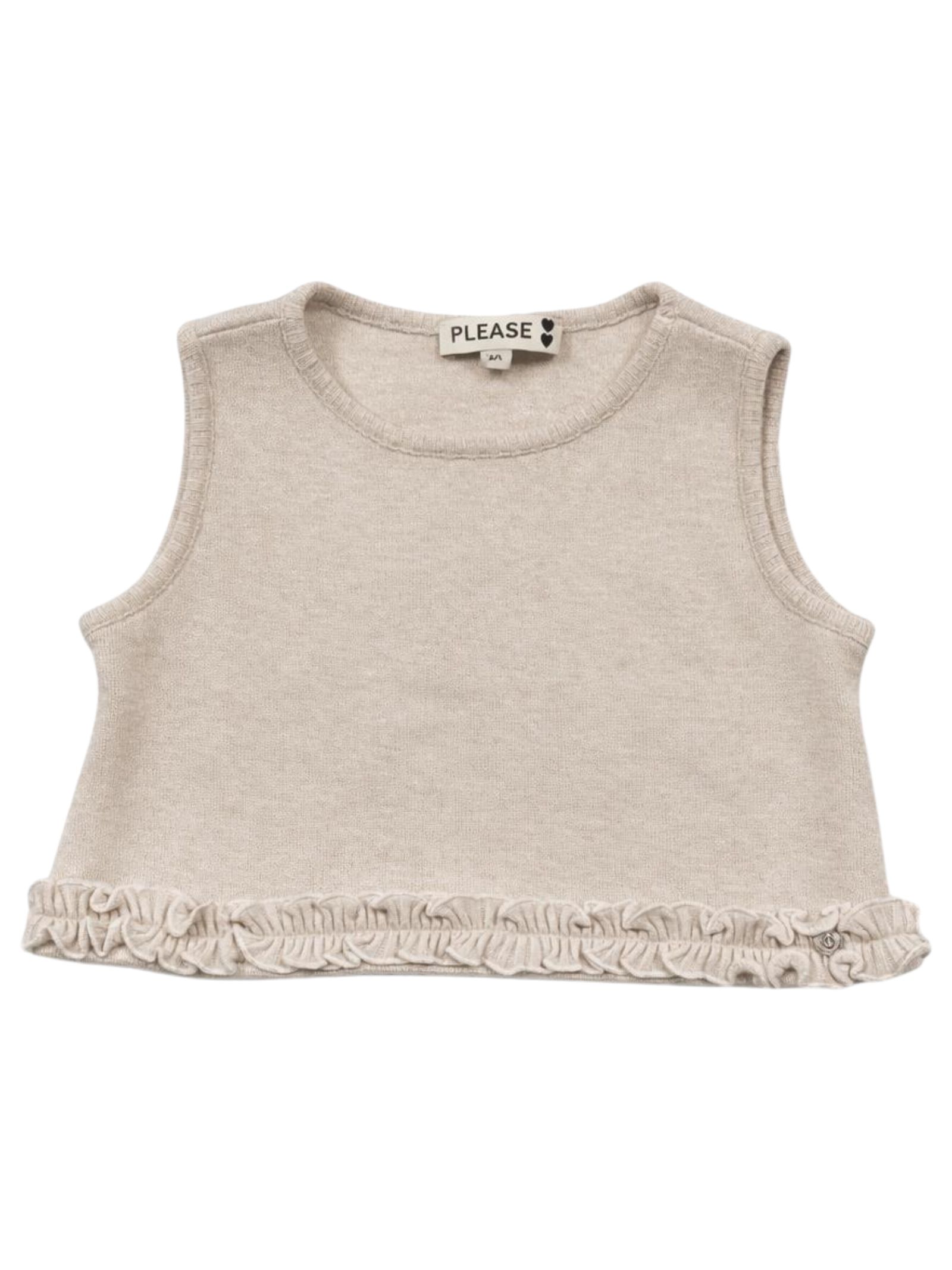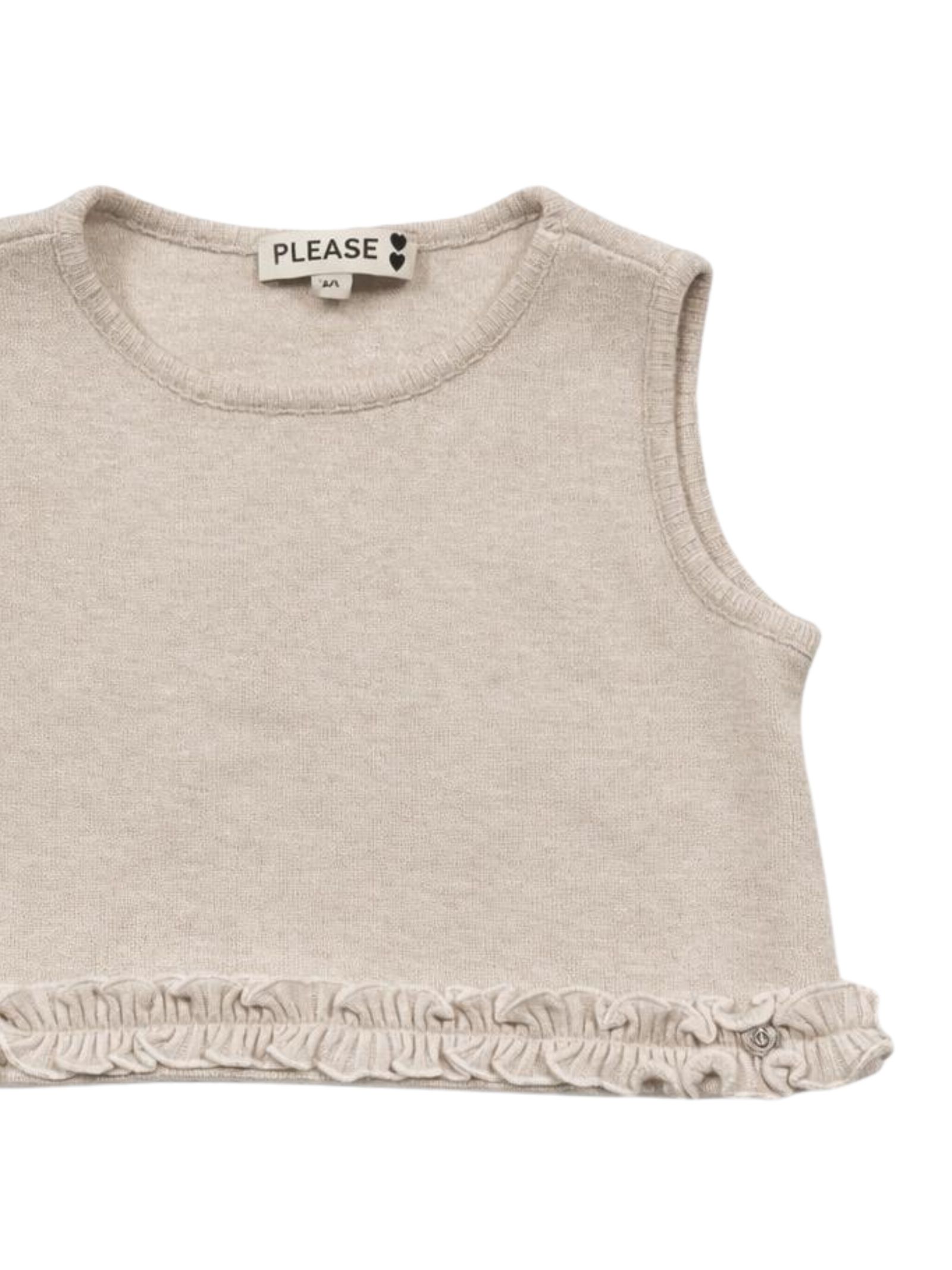 Please Kids beige sweater, made of soft knit, cropped design, crew neck, ruffled detail, sleeveless. Composition: 40% polyester, 40% viscose, 20% nylon. Made in Italy.