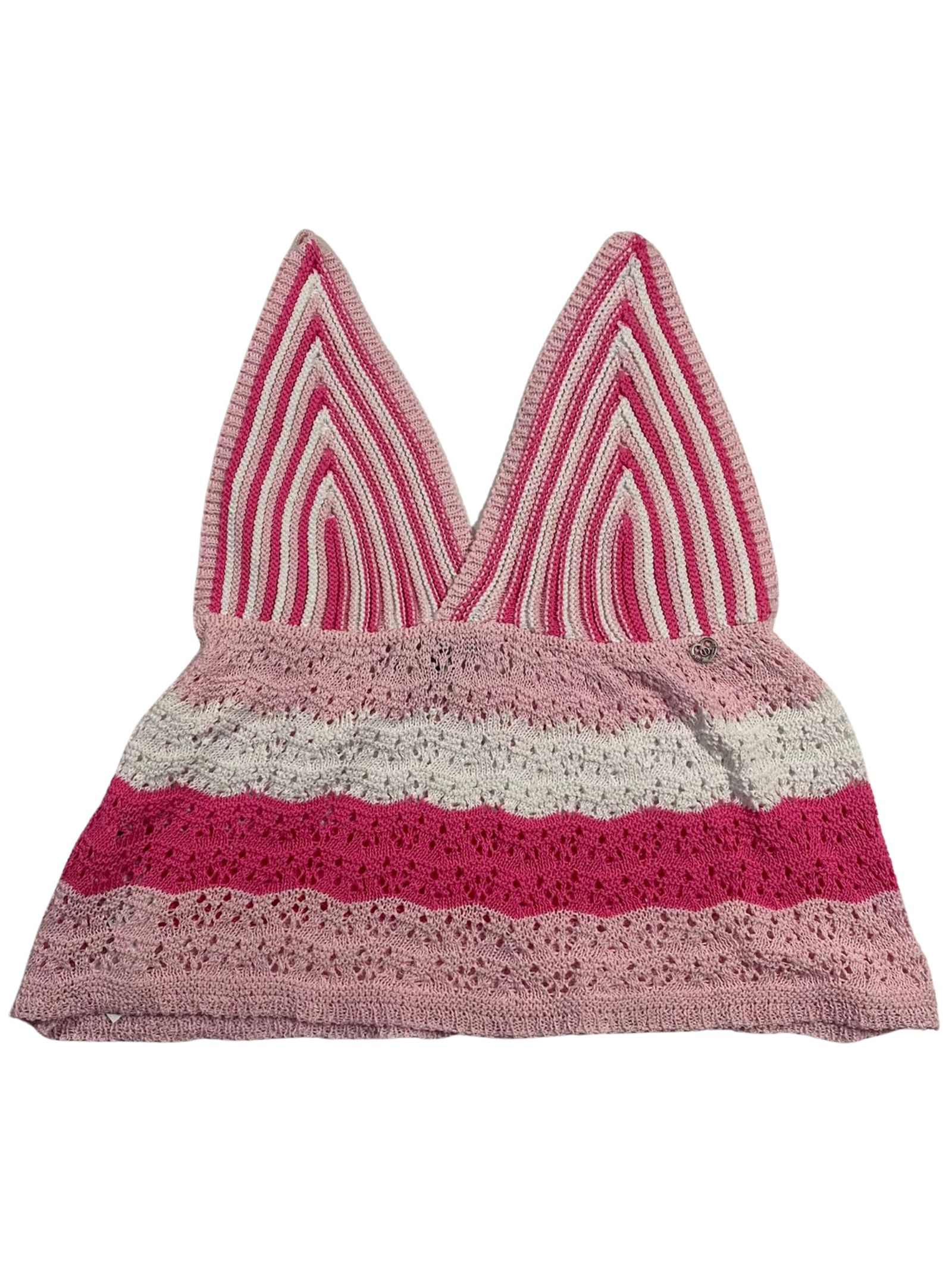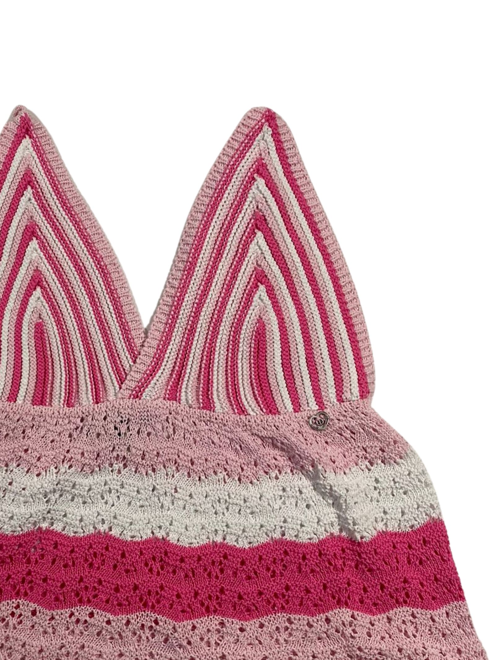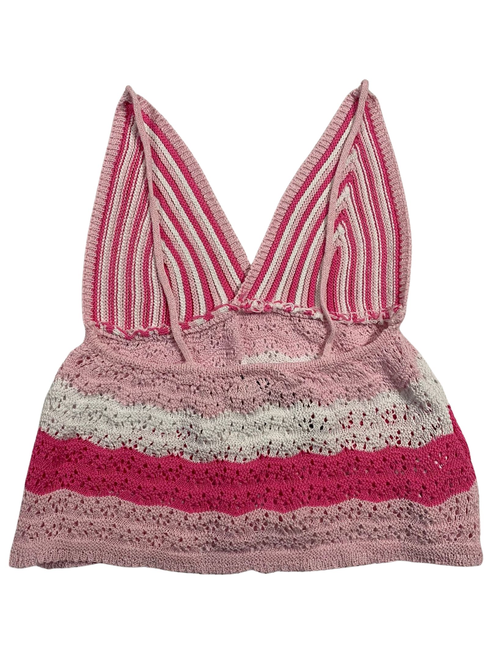 Please Kids pink patterned top, made of openwork knit, with straps, a triangle design, a heart-shaped metal logo appliqué, and a flared fit. Composition: 50% cotton, 50% acrylic. Made in Italy.