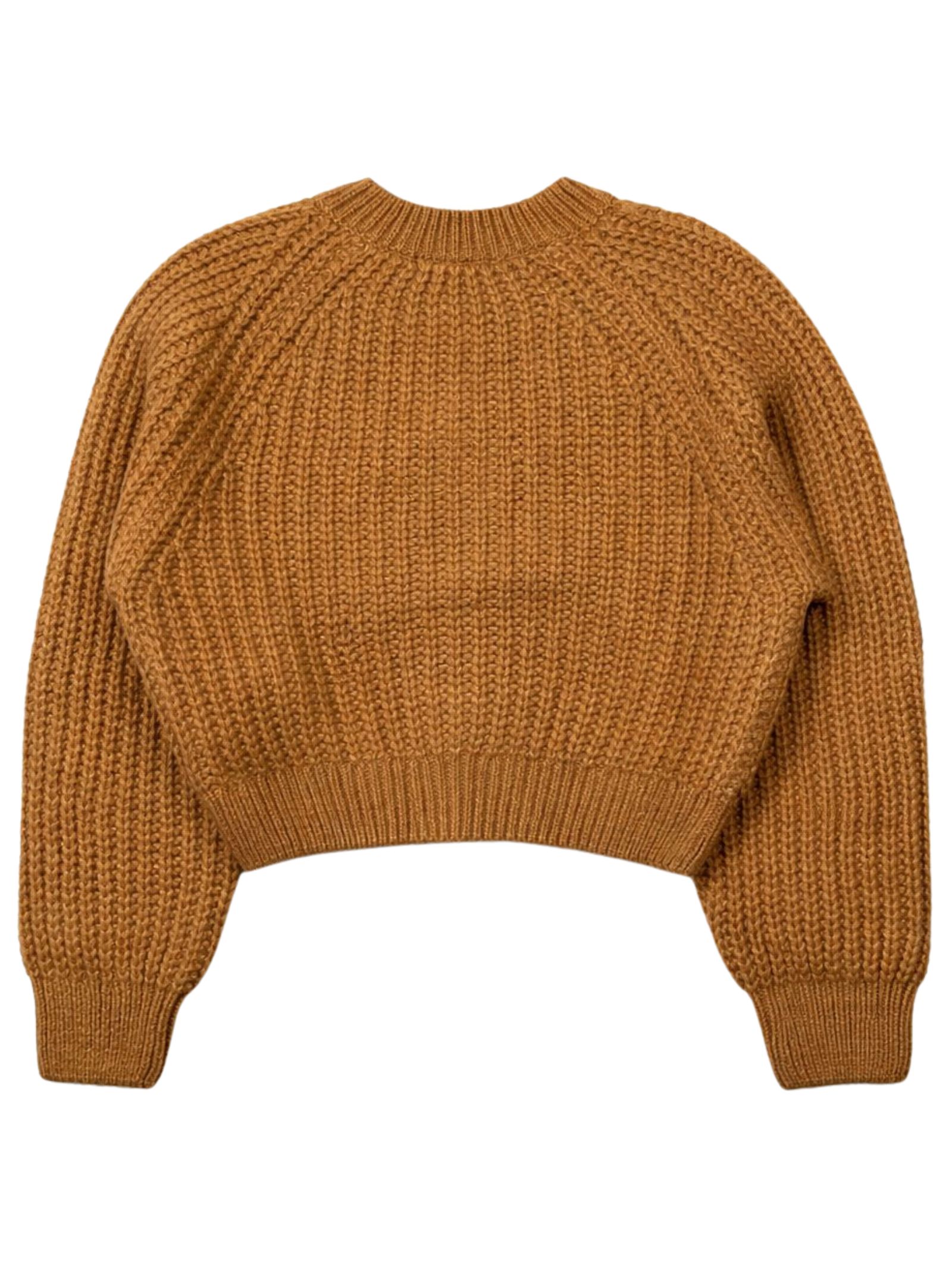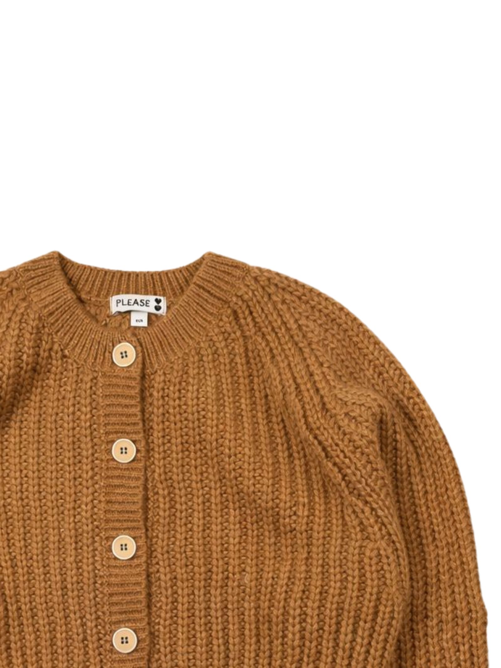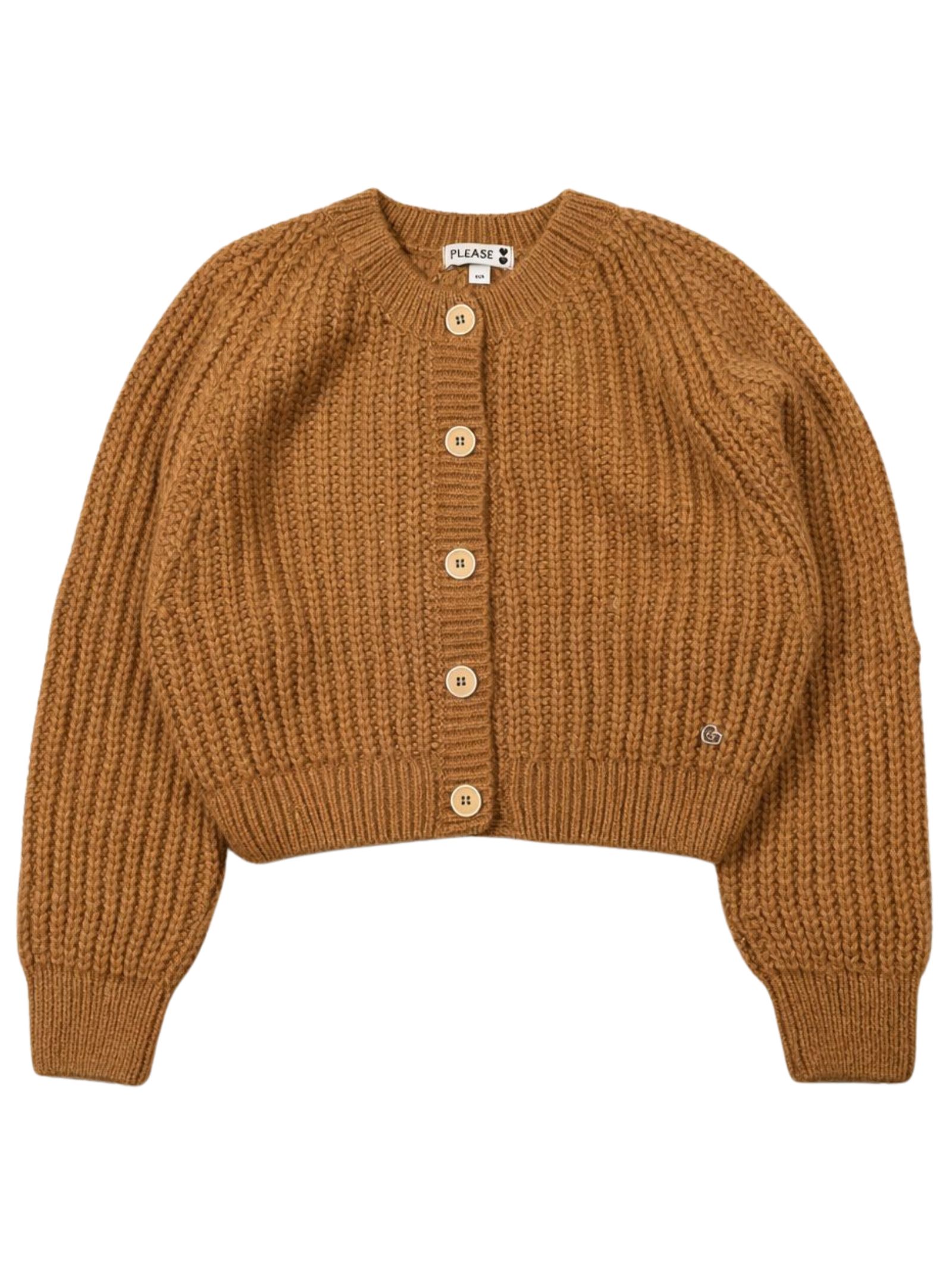 Please Kids beige cardigan, made of soft knit, with a round neckline, long sleeves, a slightly cropped length, and a logo applique. Composition: 57% acrylic, 29% polyamide, 7% viscose, 7% wool. Made in Italy