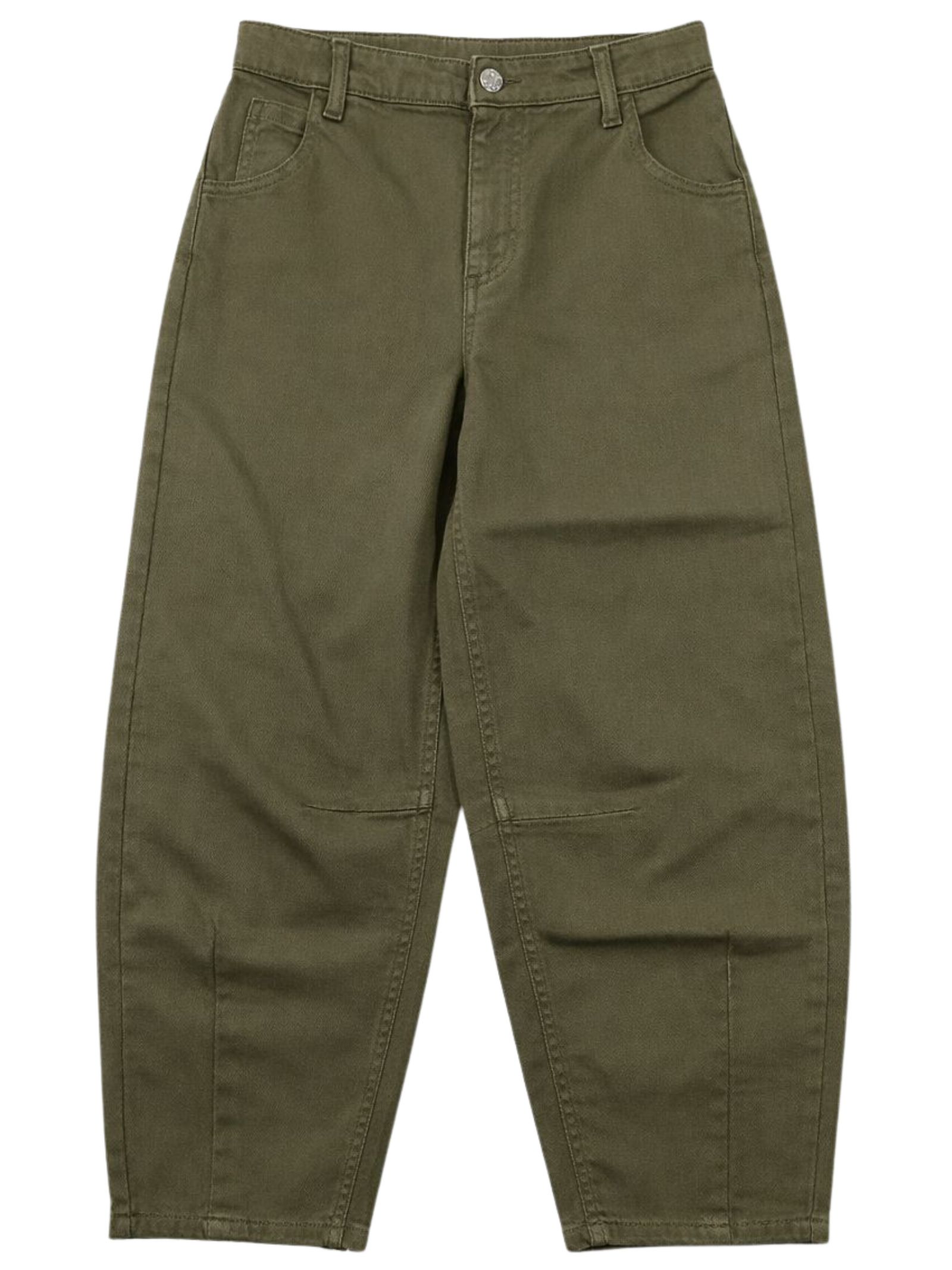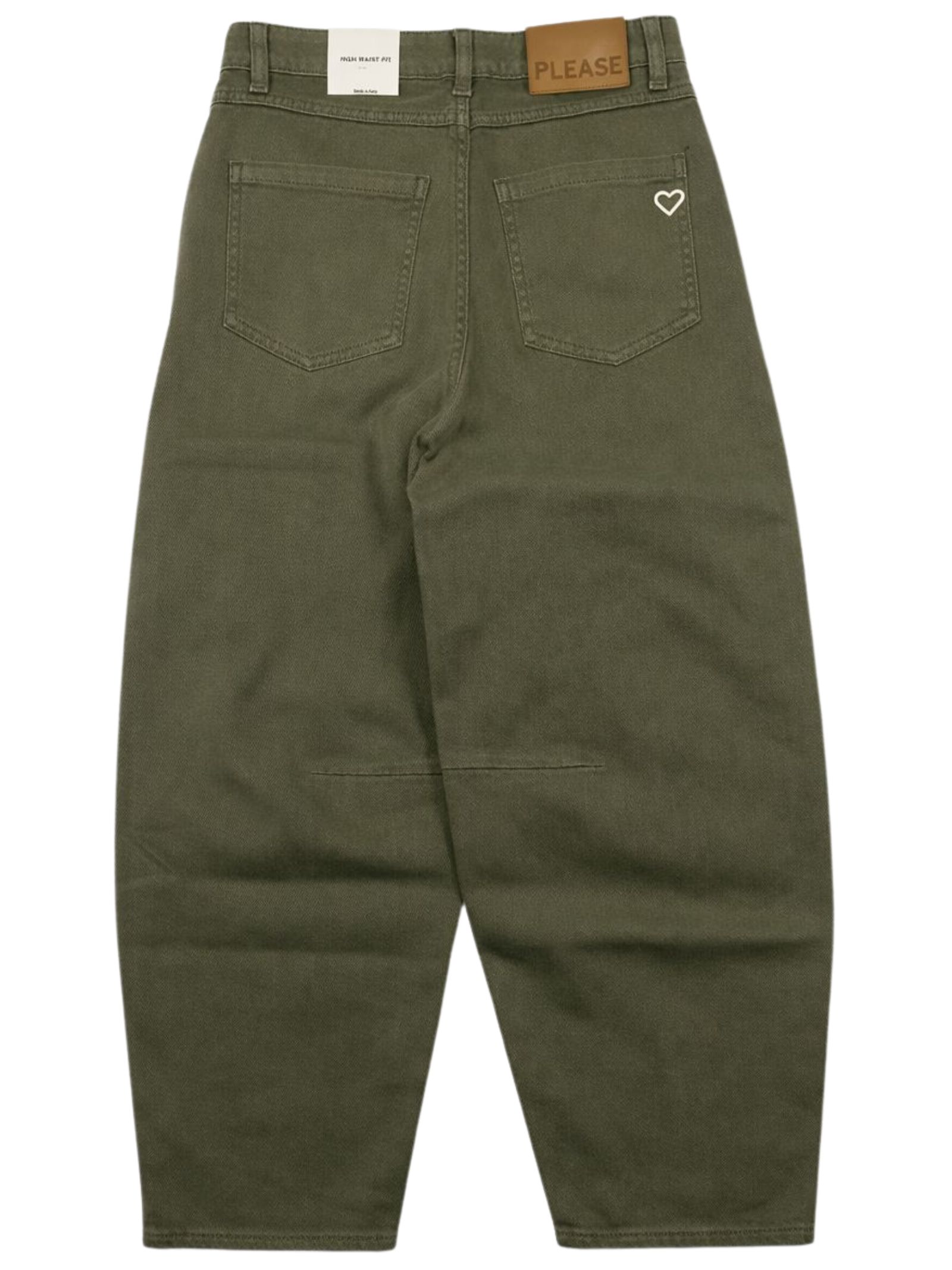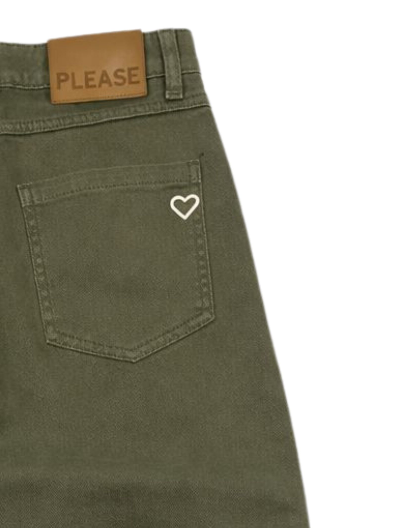 Please Kids green-wash cotton denim jeans with a front zip and button closure, a regular waist, five pockets, a heart-shaped metal logo, and a wide leg. Composition: 98% cotton, 2% elastane. Made in Italy.