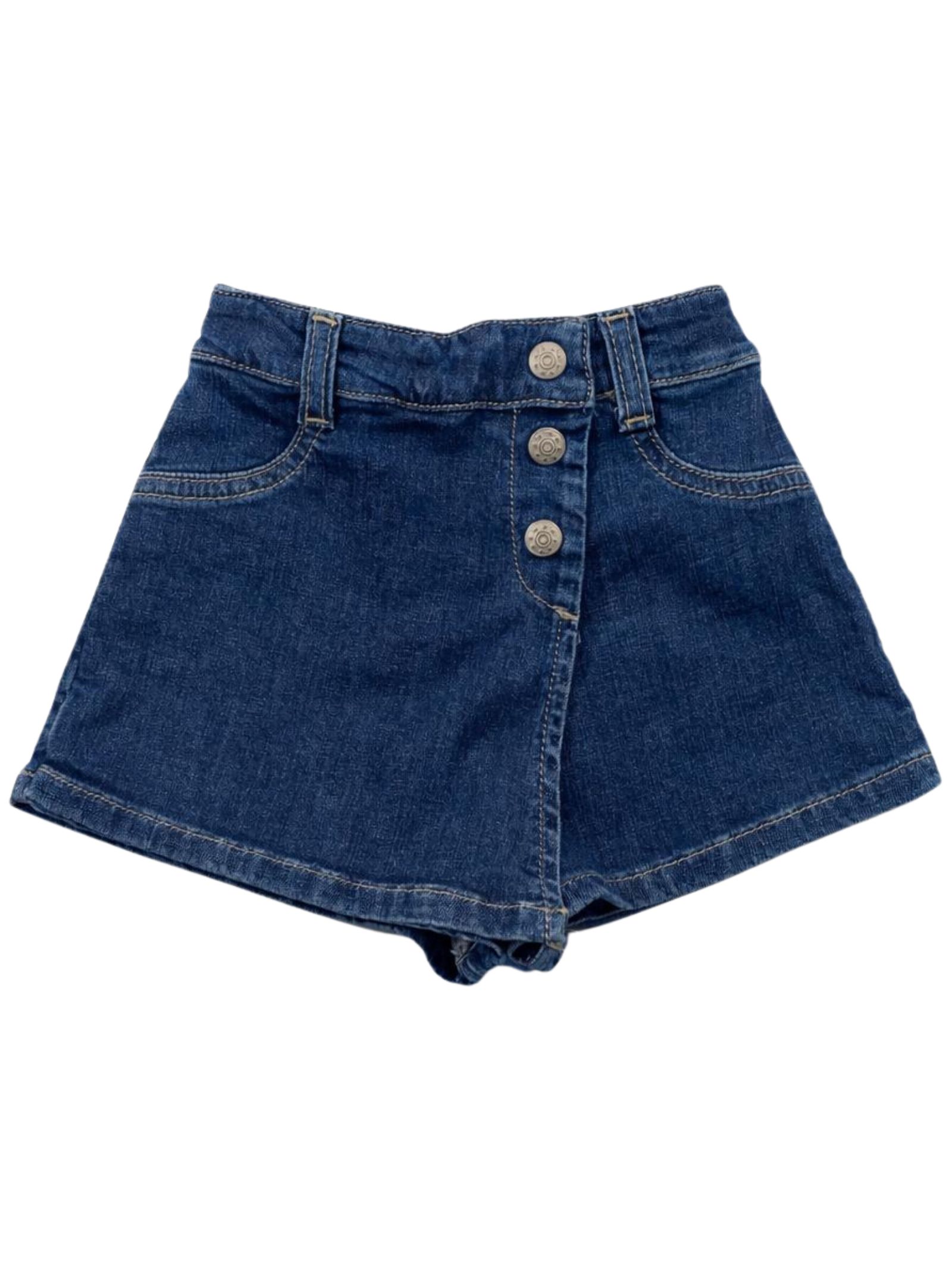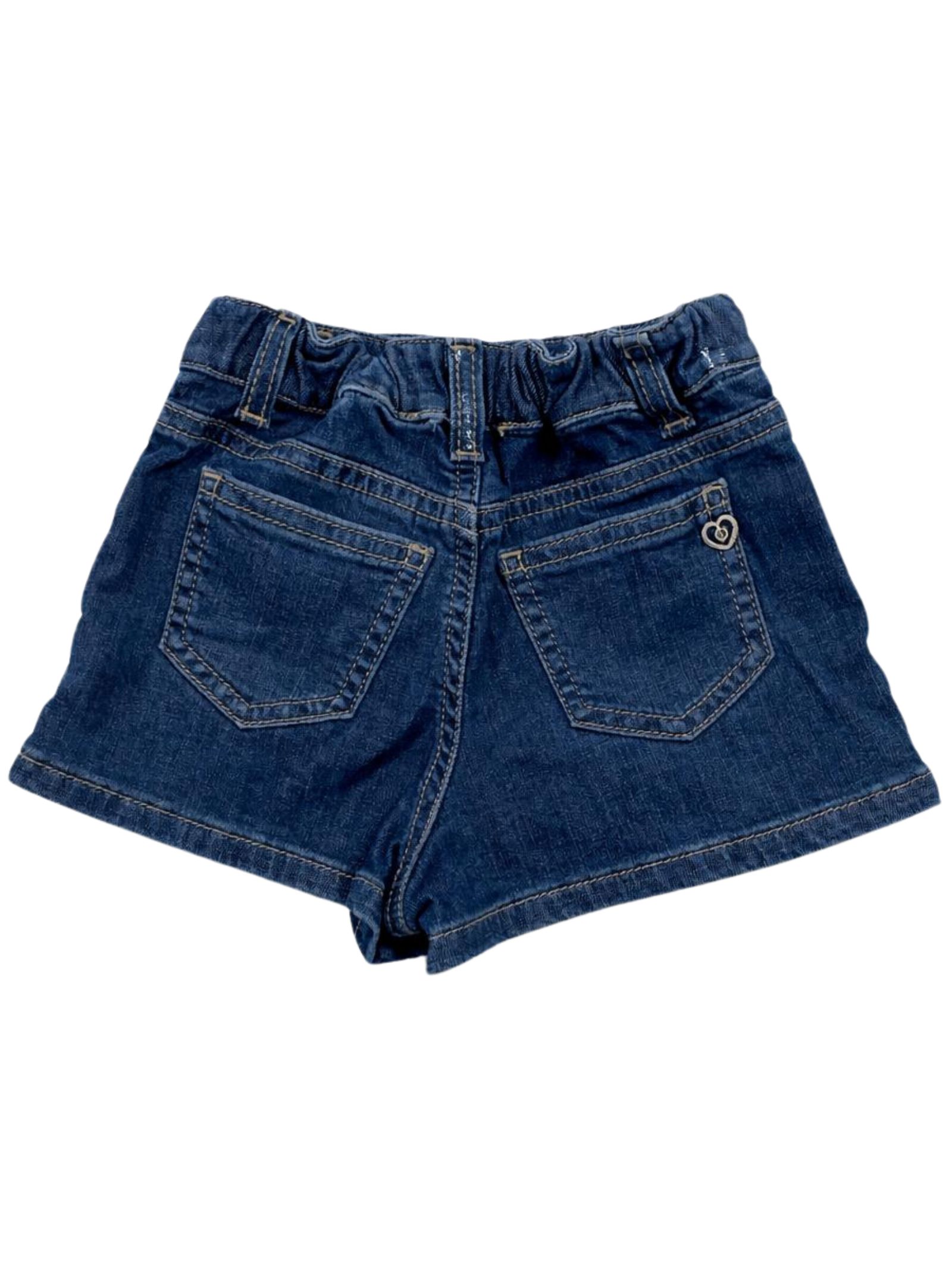 Please Kids dark blue denim cotton skirt/shorts, front zip and button closure, elastic waistband, back pockets, decorated with a heart-shaped metal logo. Composition: 98% Cotton, 2% Elastane. Made in Italy.