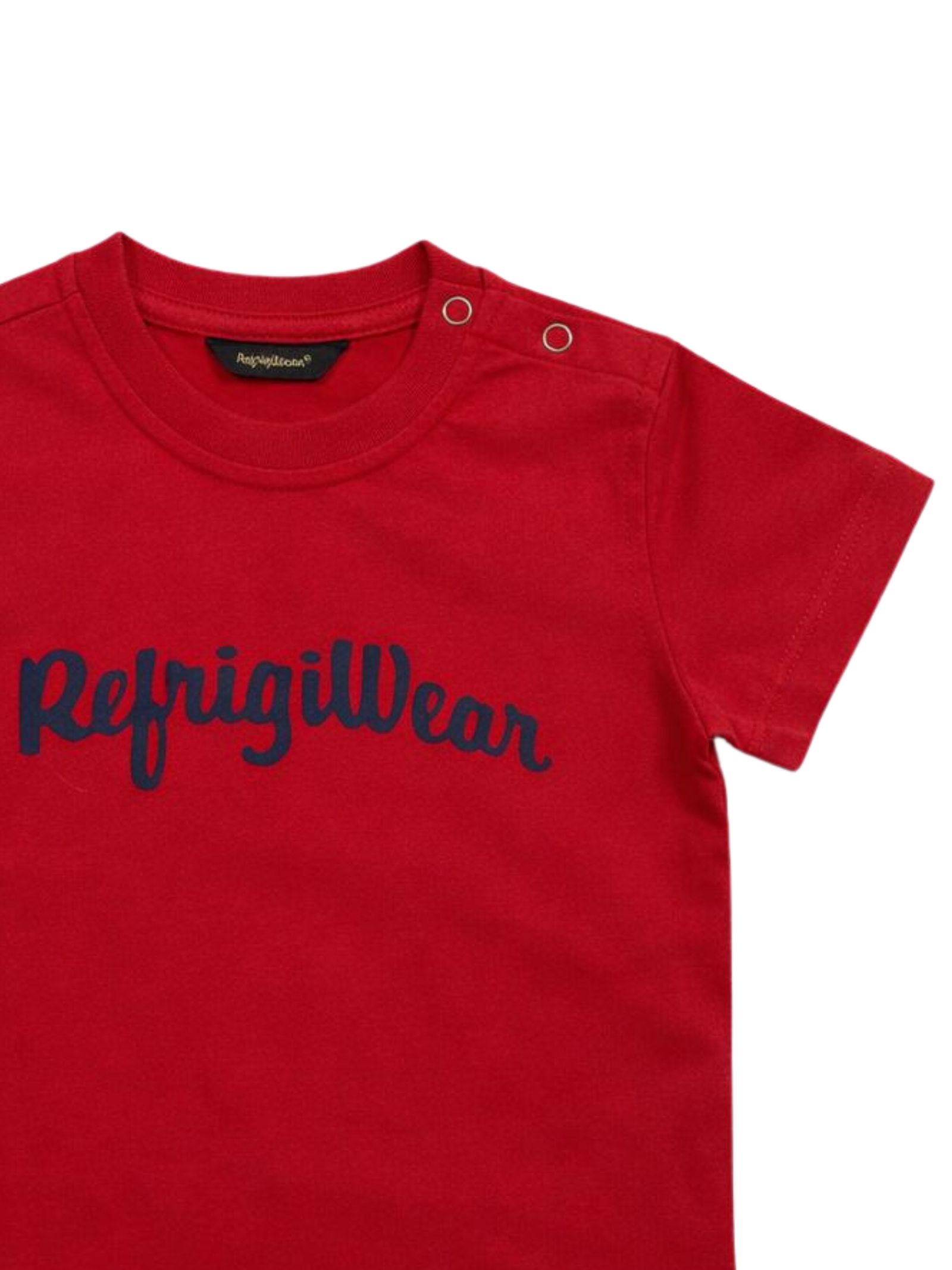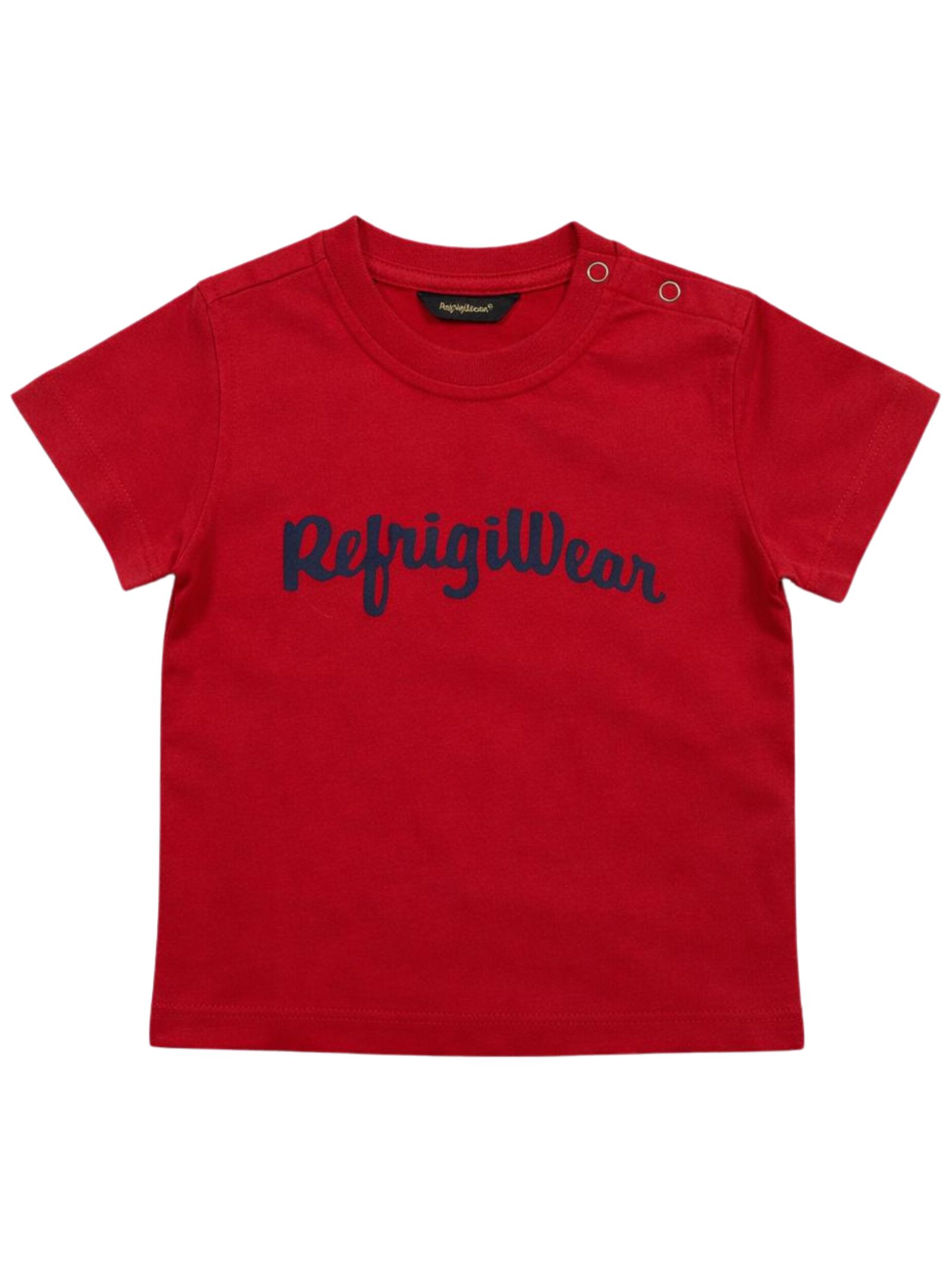 Refrigiwear Kids red T-shirt, crew neck, short sleeves, contrasting central logo print, snap buttons on the shoulder, regular fit. Composition: 100% cotton.