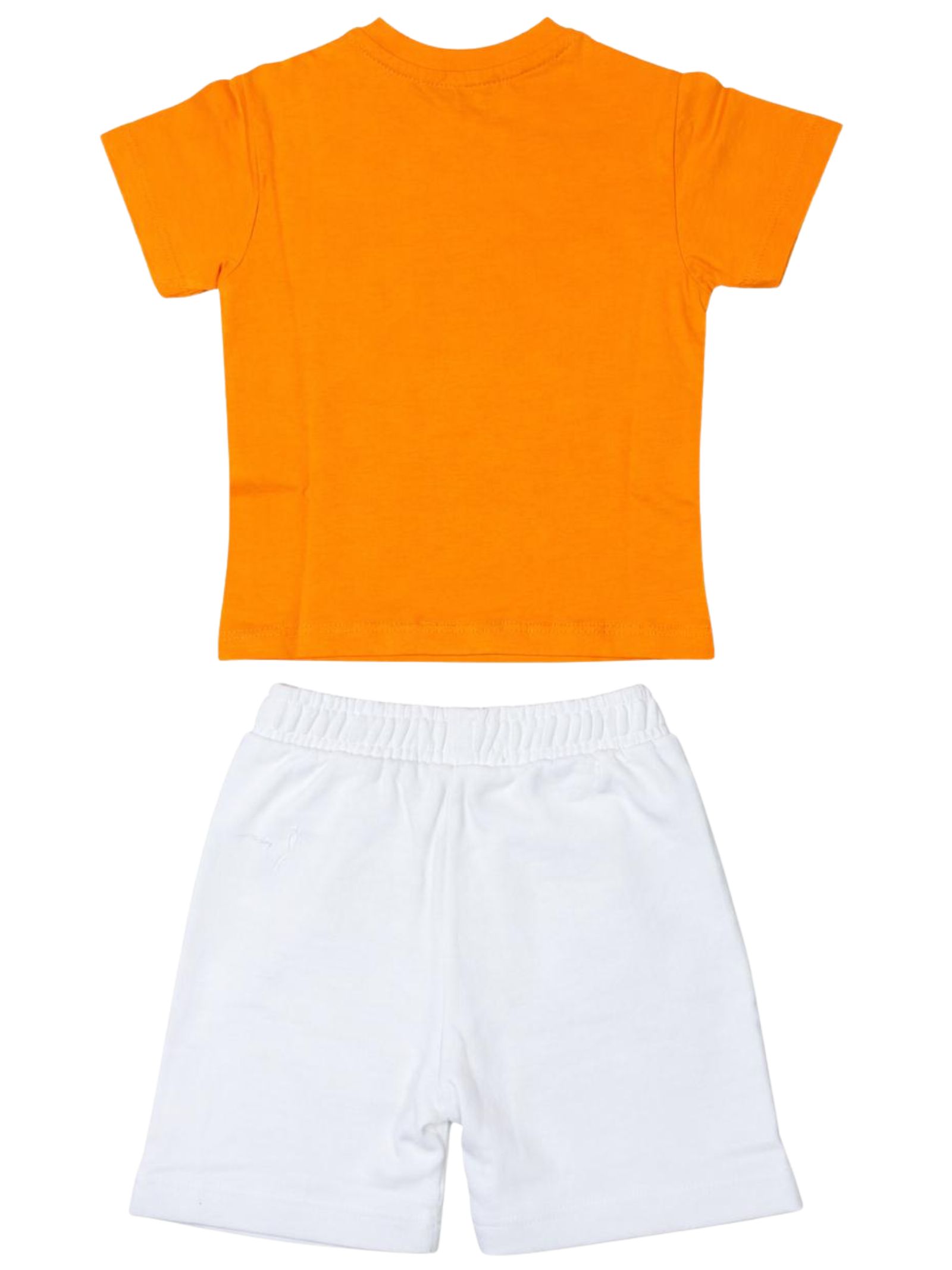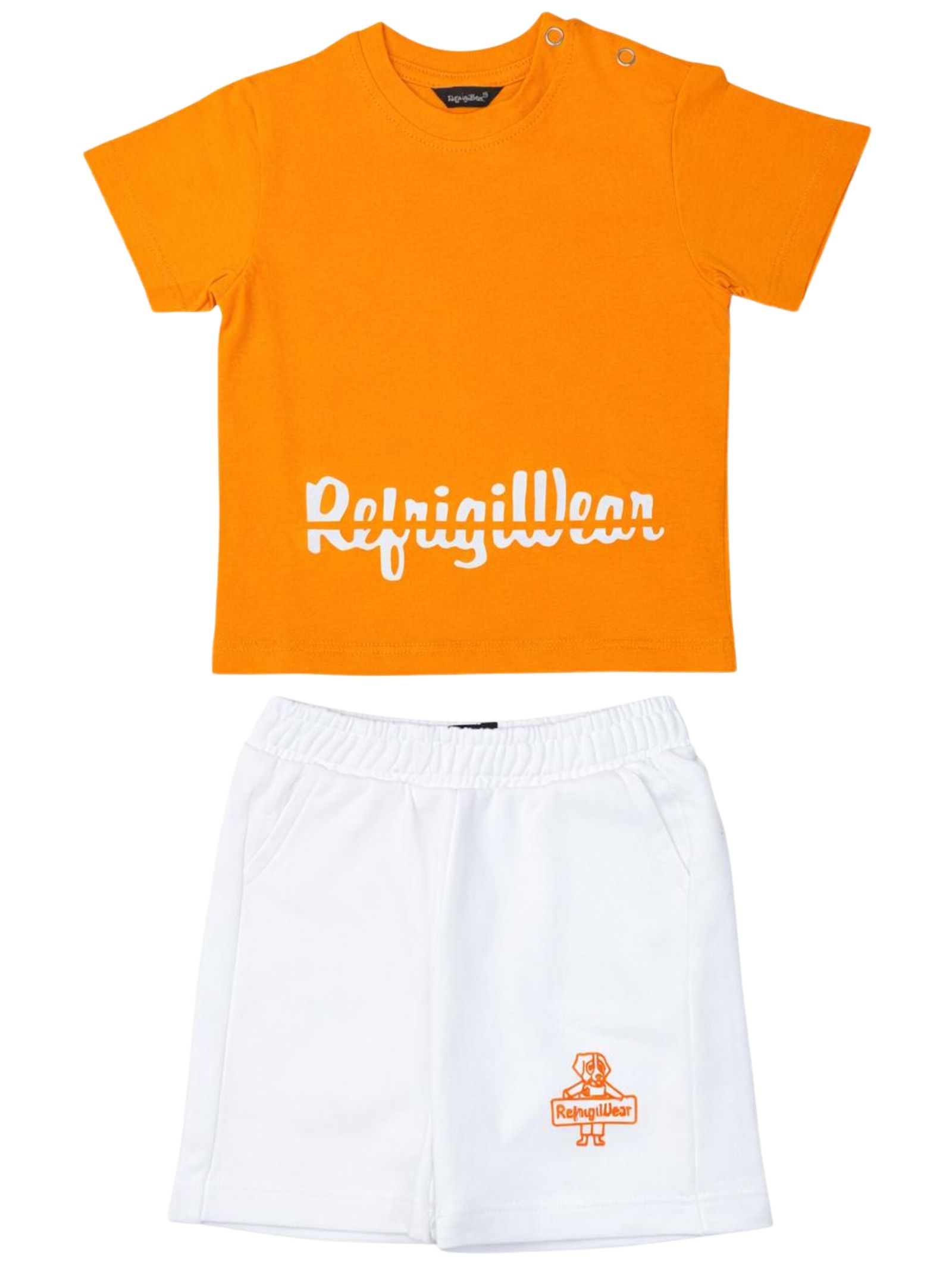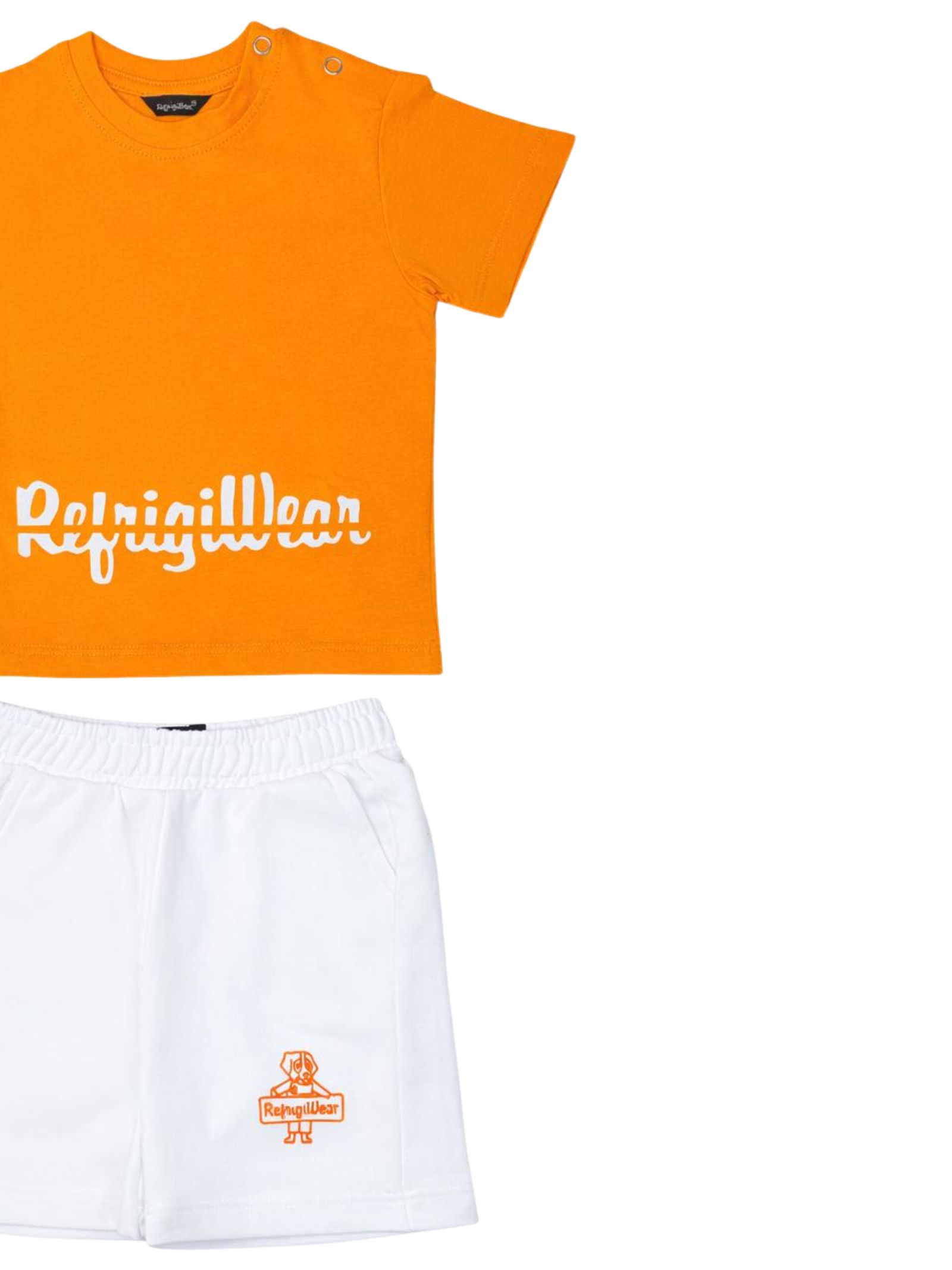 Refrigiwear Kids orange/white outfit, featuring a crew neck T-shirt, short sleeves with a contrasting central logo and snap buttons on the shoulder, matching Bermuda shorts with an elastic waistband, two side welt pockets, regular fit. Composition: 100% cotton.