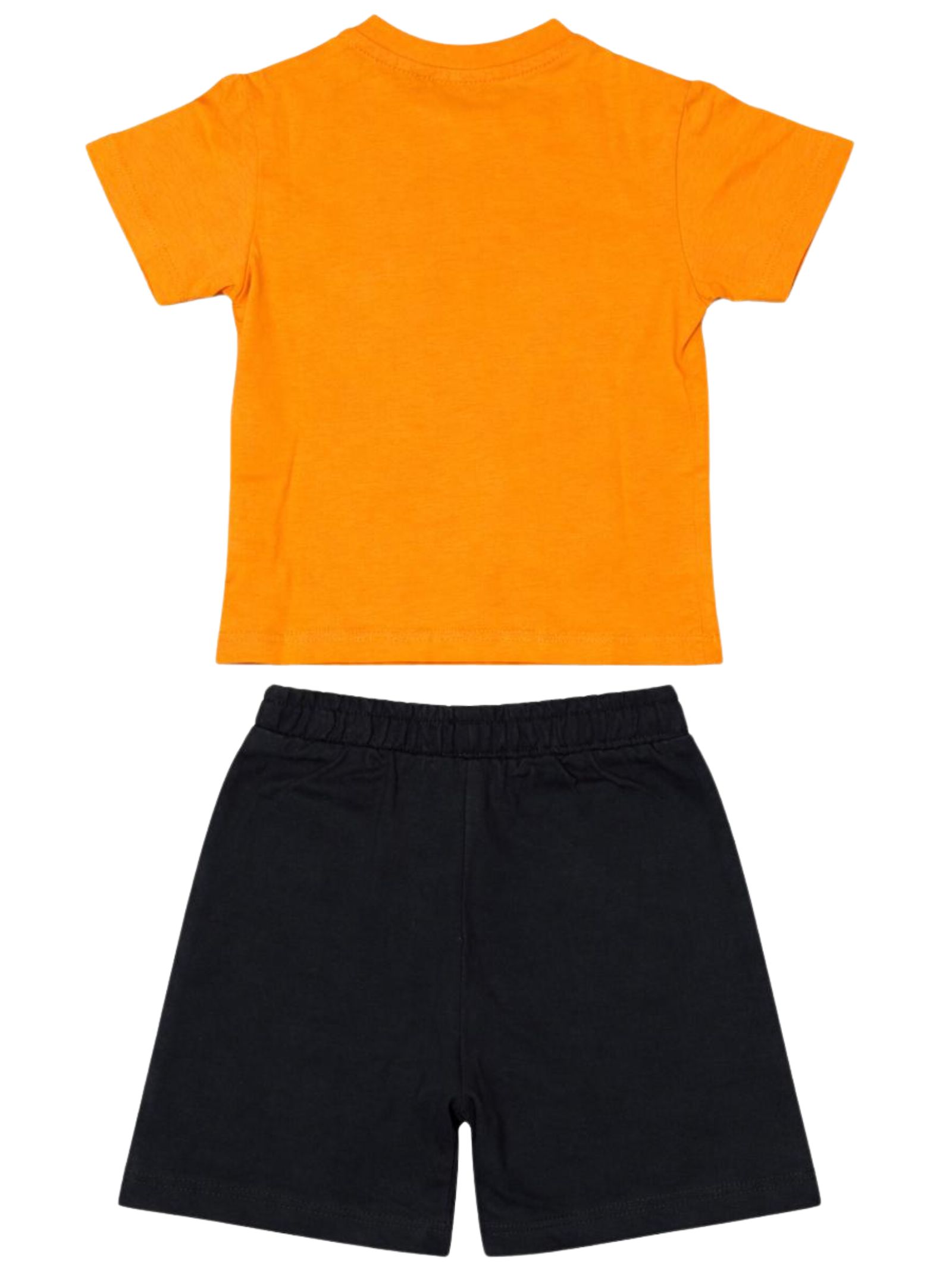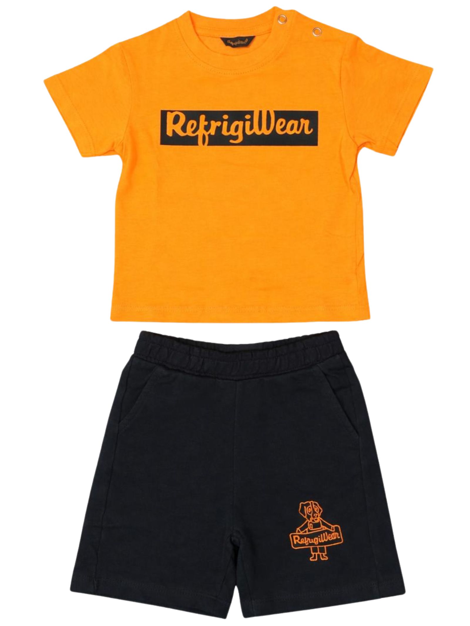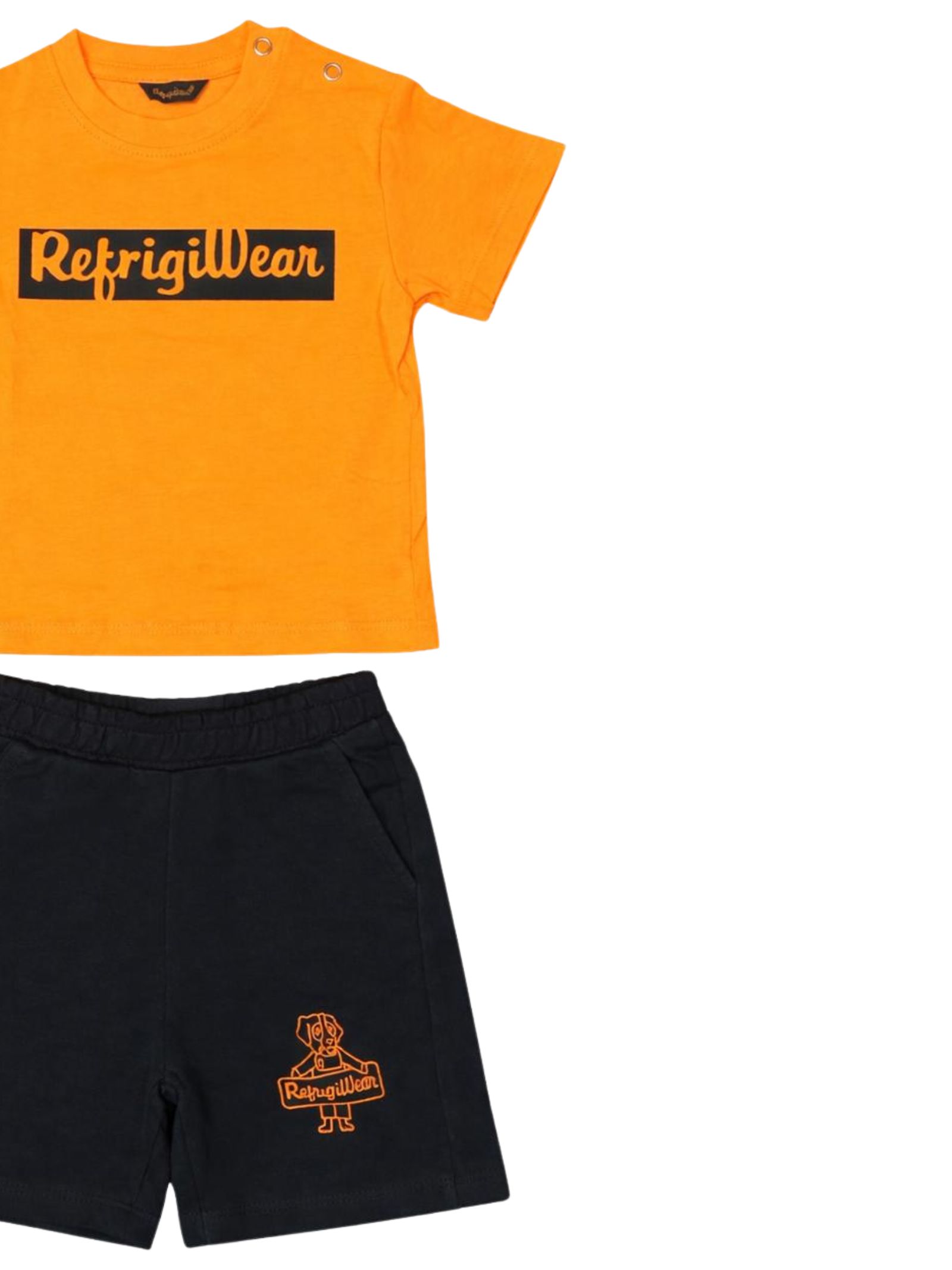 Refrigiwear Kids orange/black outfit, featuring a crew neck T-shirt, short sleeves with a contrasting central logo and snap buttons on the shoulder, matching Bermuda shorts with an elastic waistband, two side welt pockets, regular fit. Composition: 100% cotton.