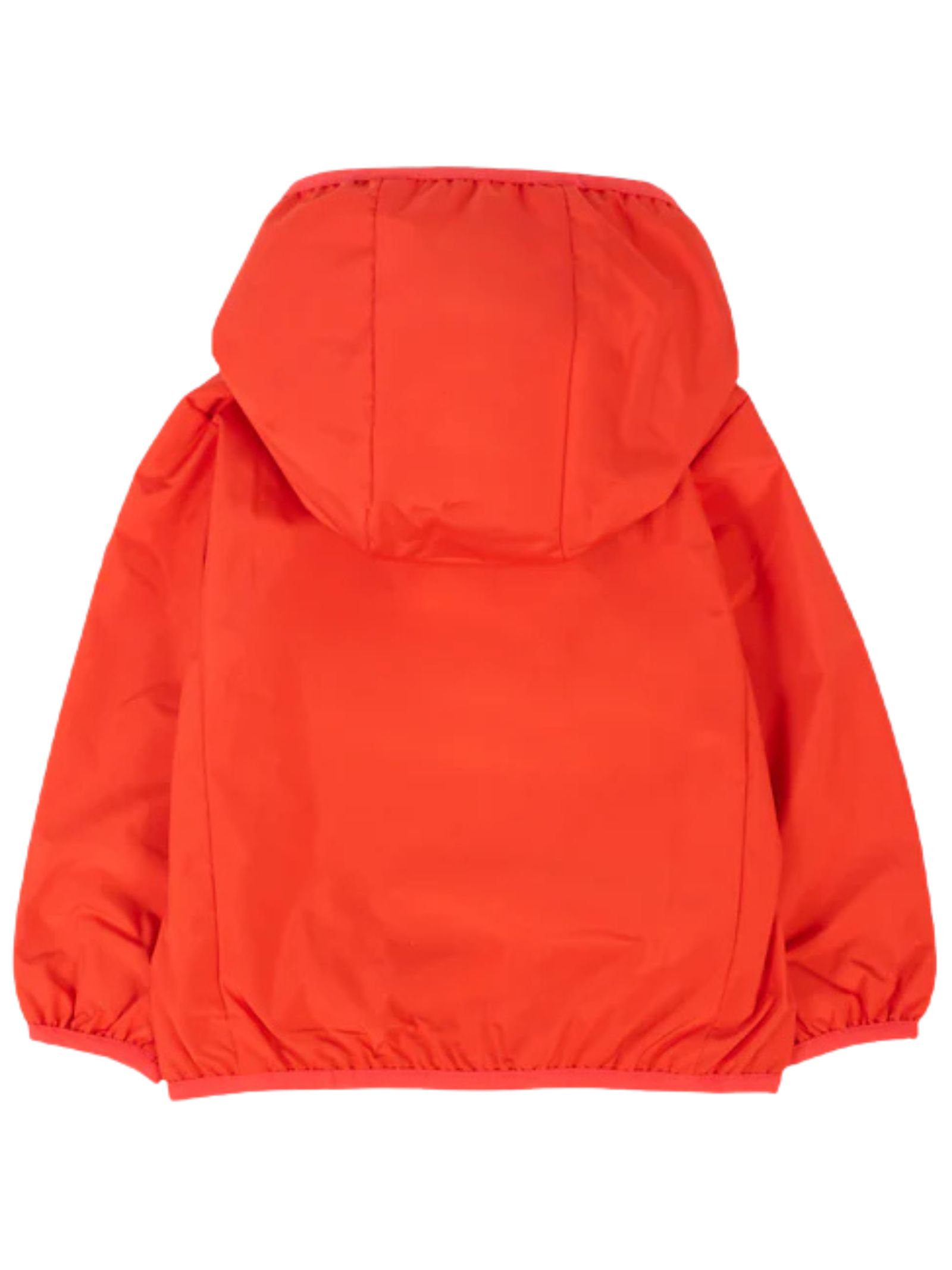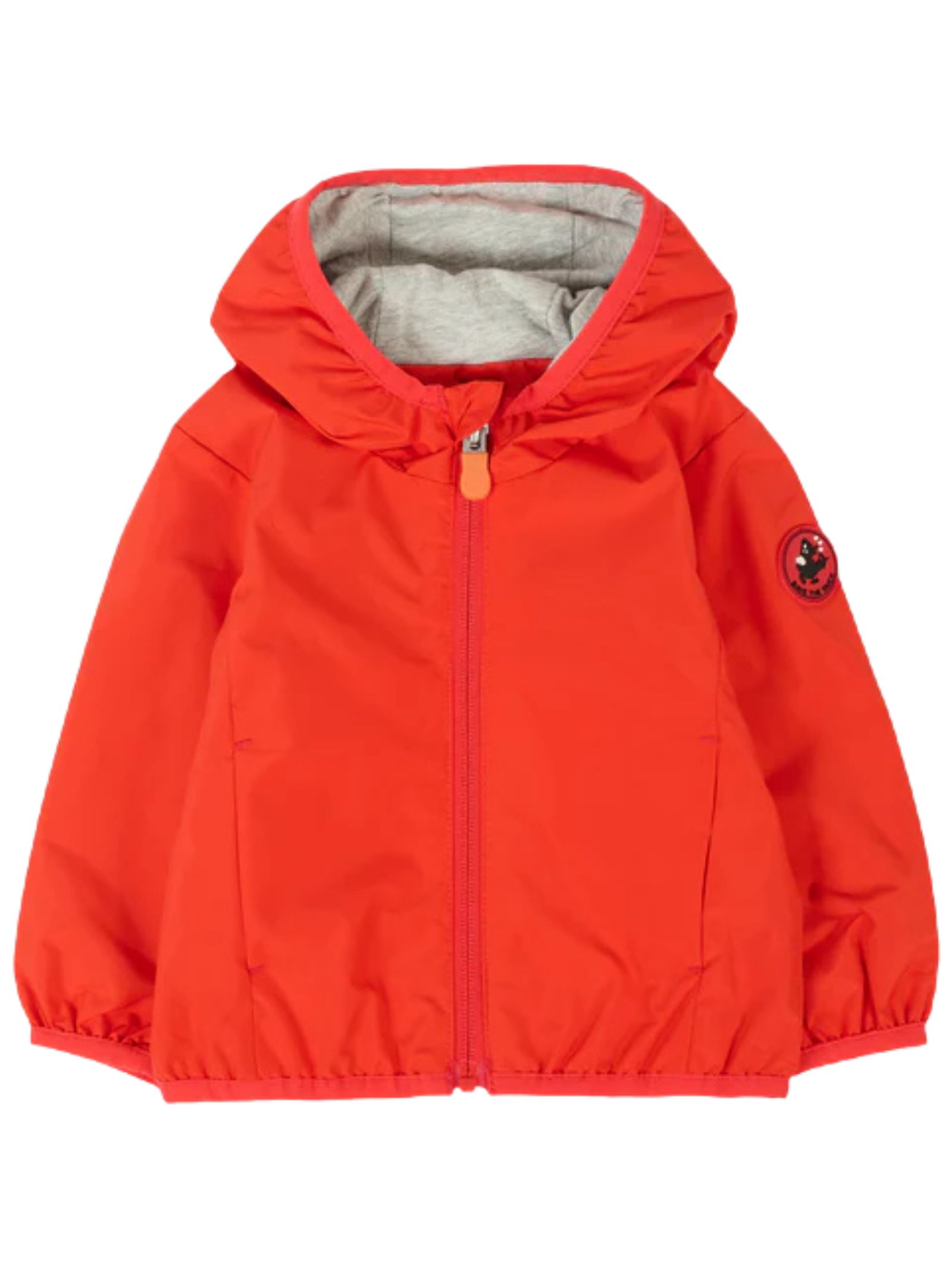 Save The Duck Kids red jacket, made of smooth nylon, with a fixed hood, central zip, side zip pockets, silicone logo application on the arm, and a contrasting grey lining. External composition: 100% nylon. Lining: 100% cotton.