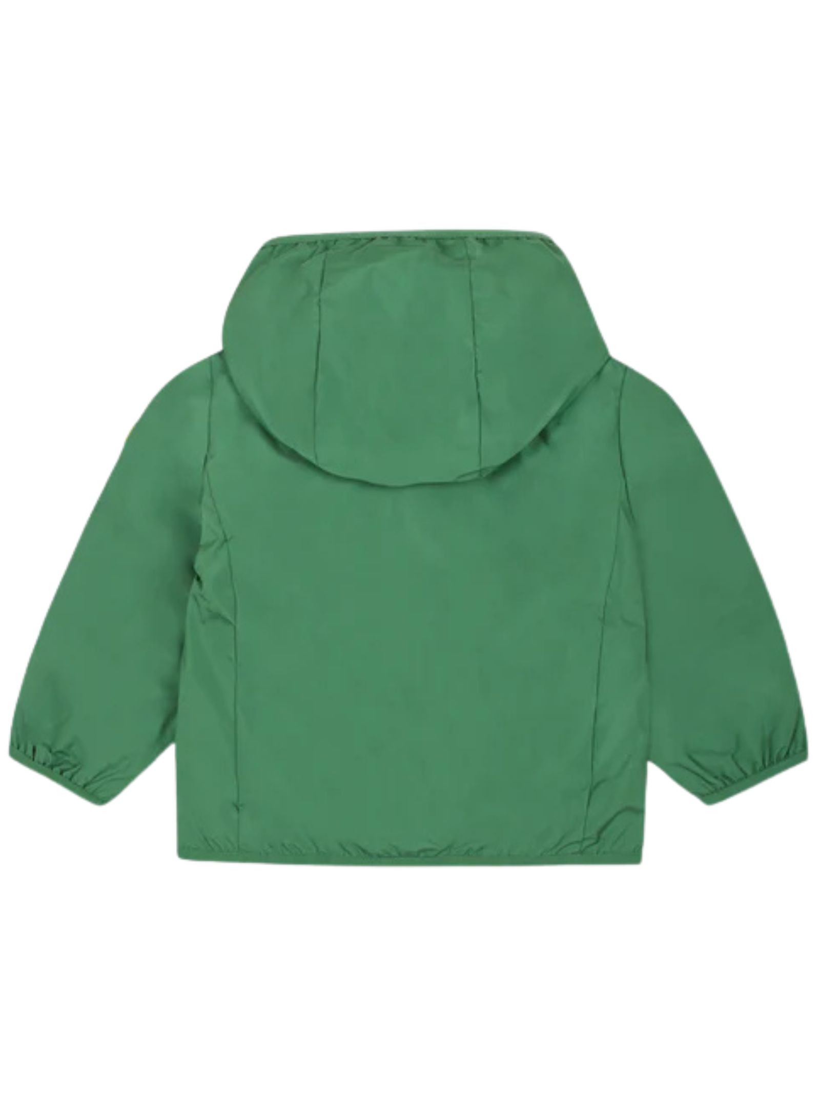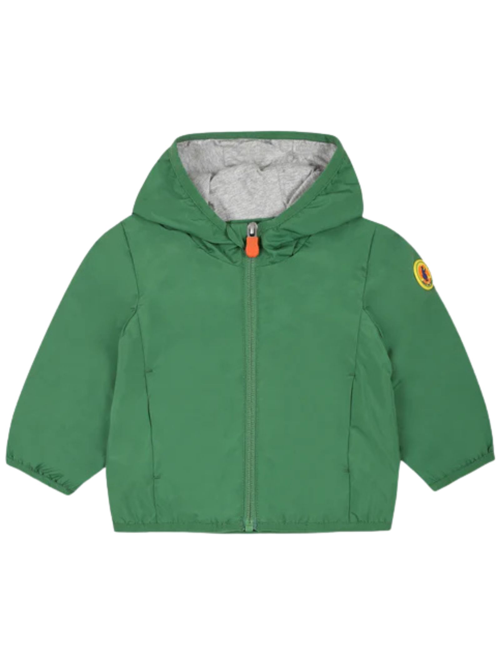 Save The Duck Kids green jacket, made of smooth nylon, with a fixed hood, a central zip, side zip pockets, a silicone logo application on the arm, and a contrasting grey lining. Outer fabric: 100% nylon. Lining: 100% cotton.