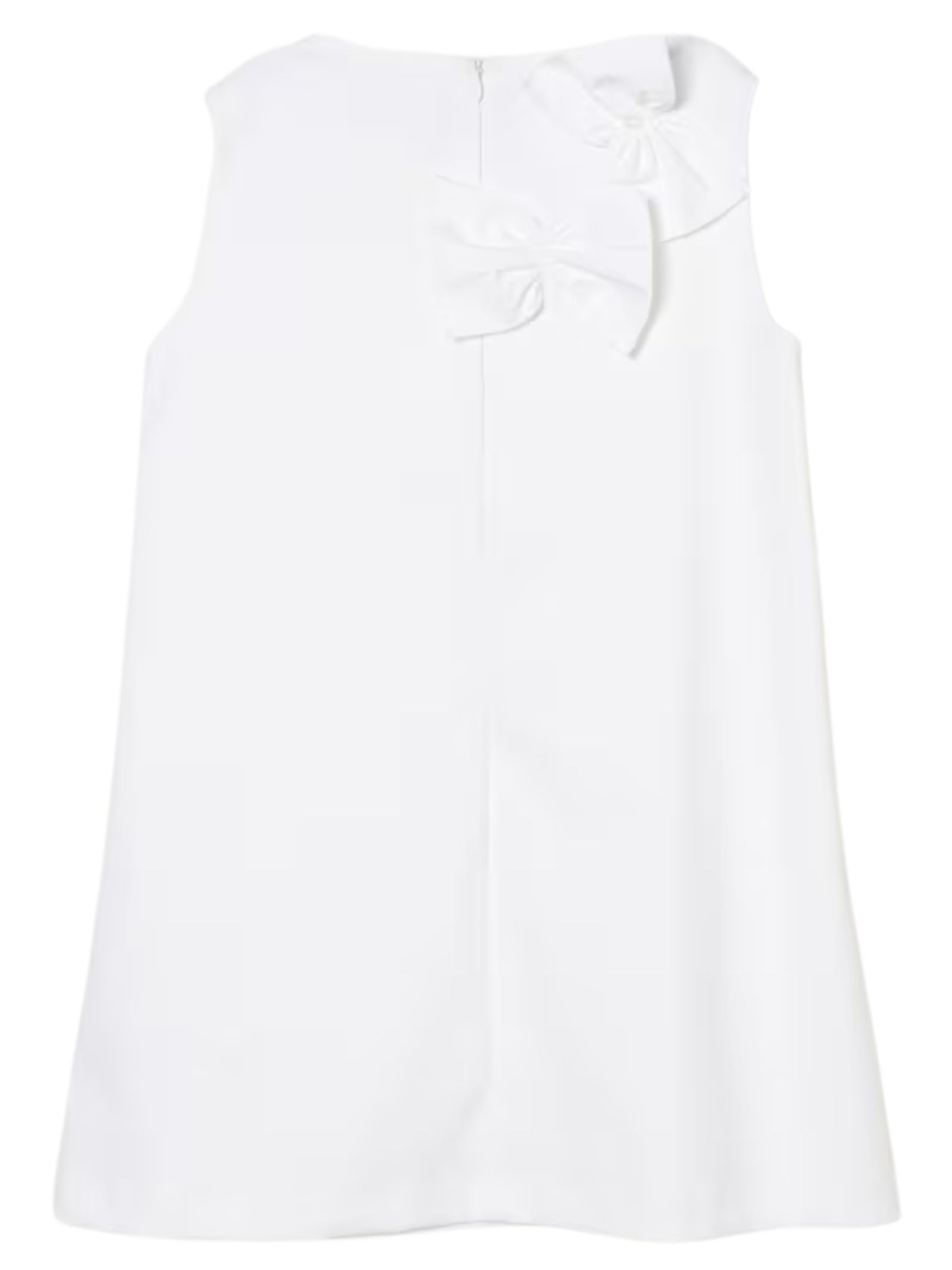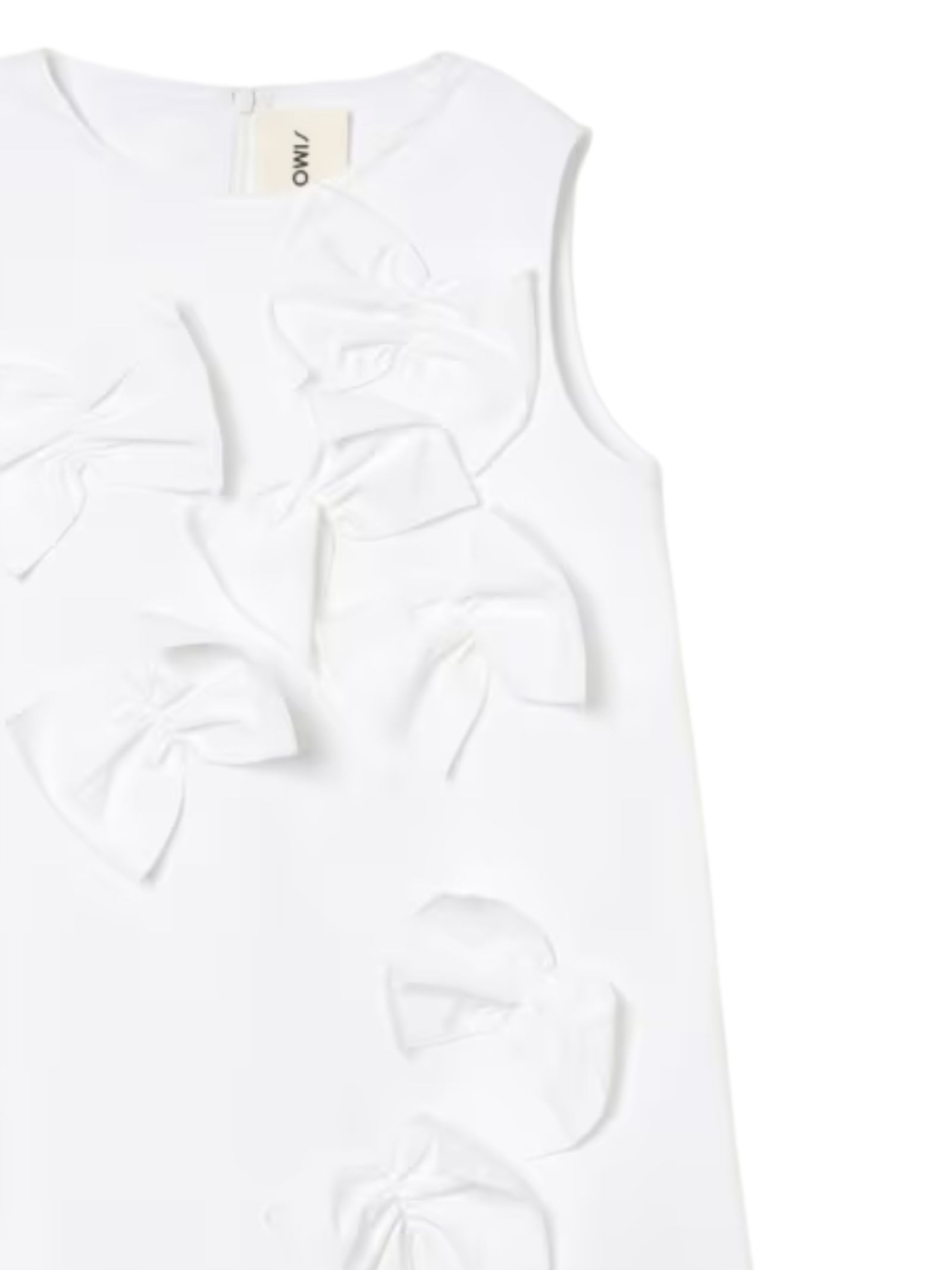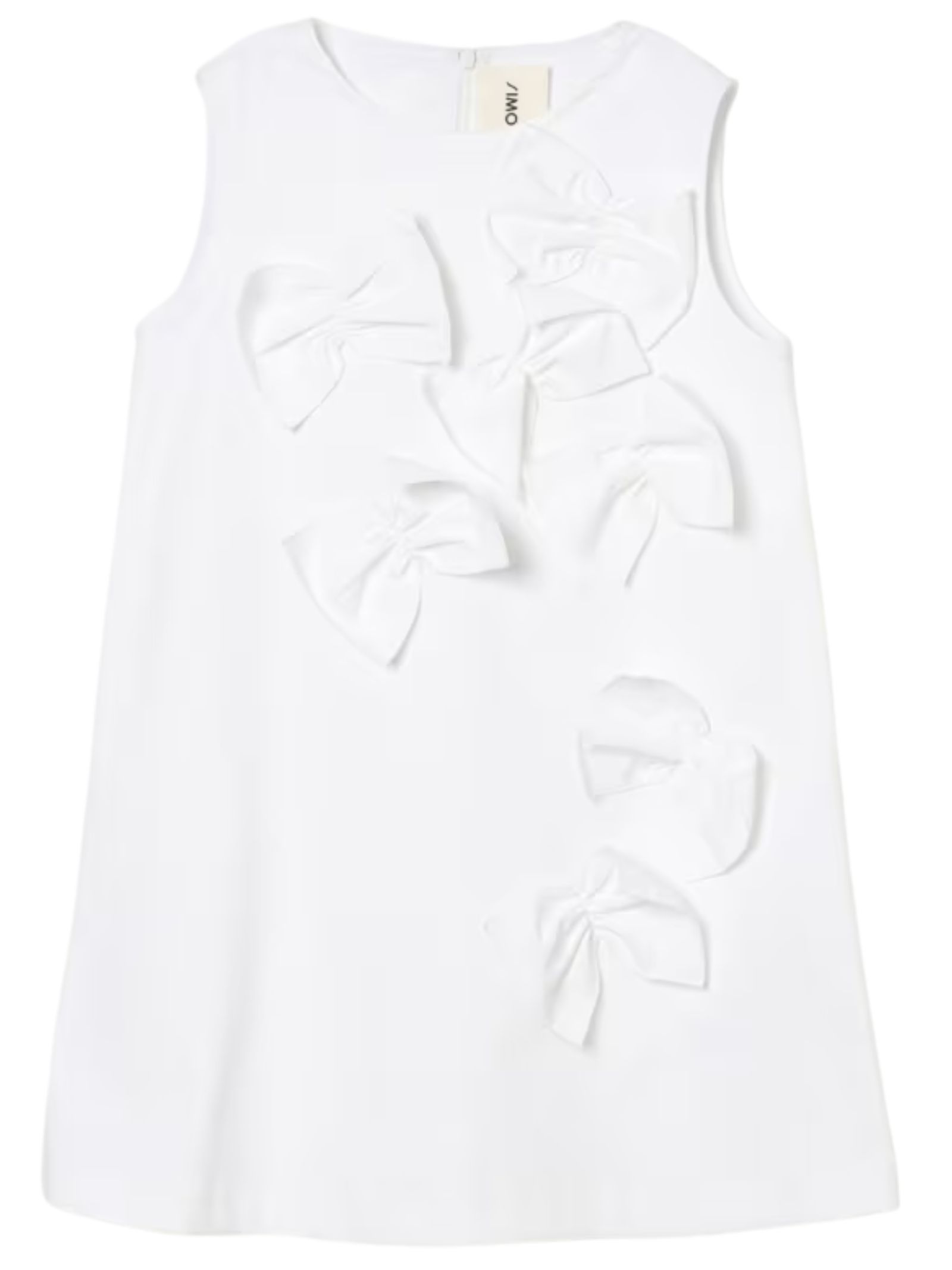 Simonetta Kids white dress, crew neck, sleeveless, bow appliqué, back zip, flared design. Composition: 50% cotton, 45% polyamide, 5% elastane.