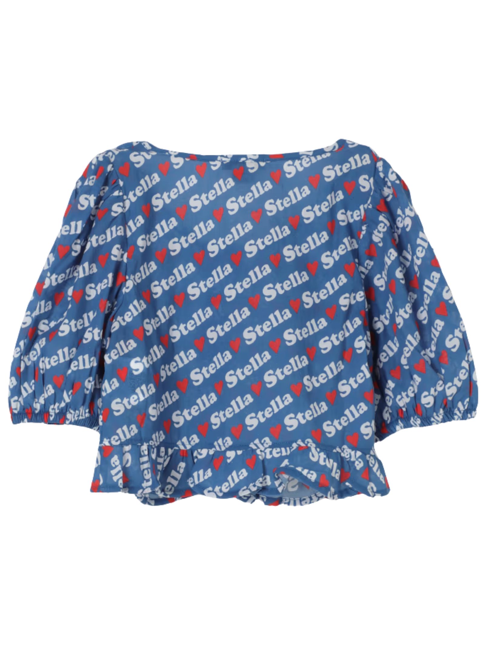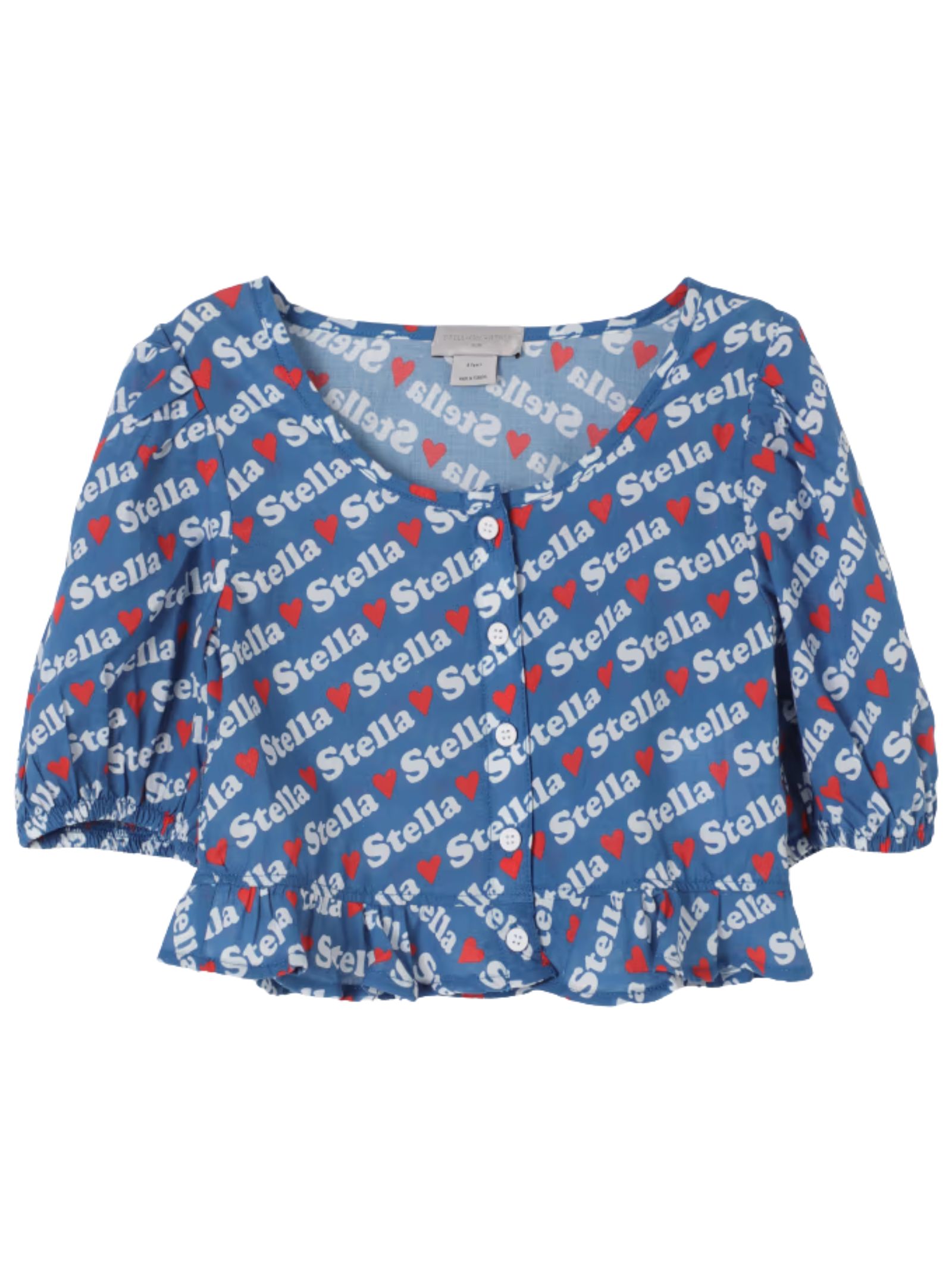 Stella McCartney Kids blue top, contrasting all-over logo print, cropped fit, wide crew neck, made of cotton, short puff sleeves with elastic, buttons on the front, ruffle hem. Composition: 100% cotton