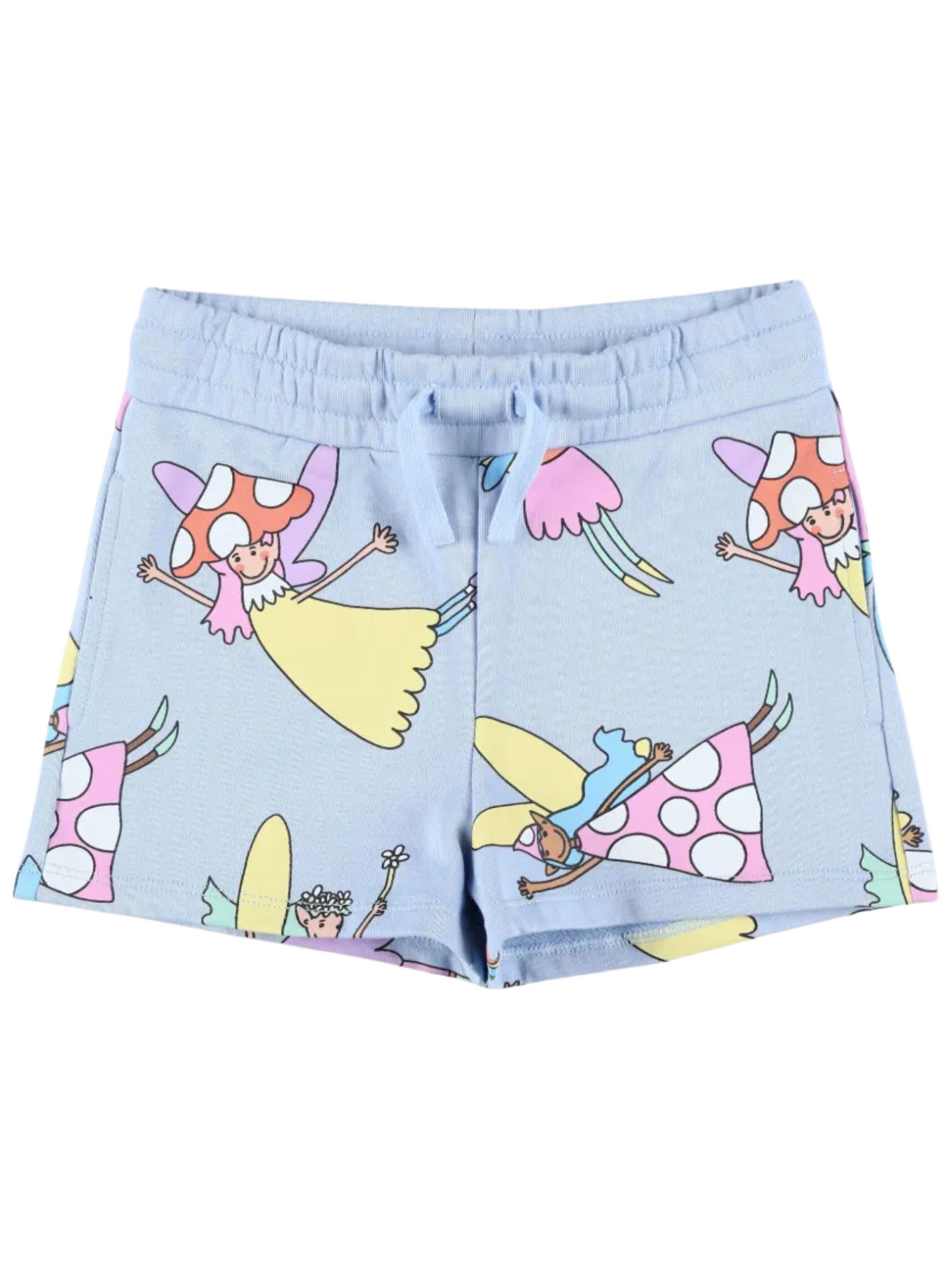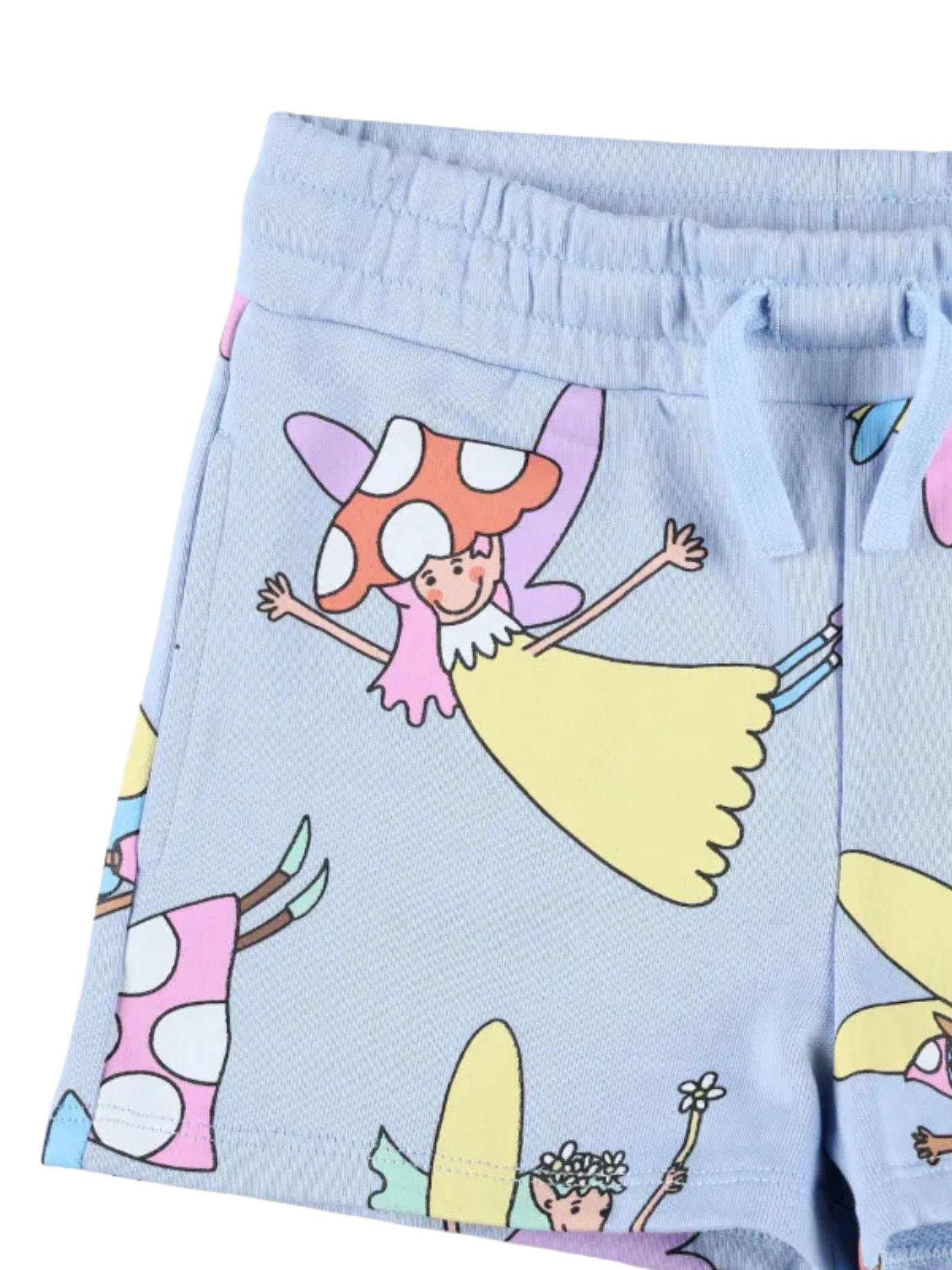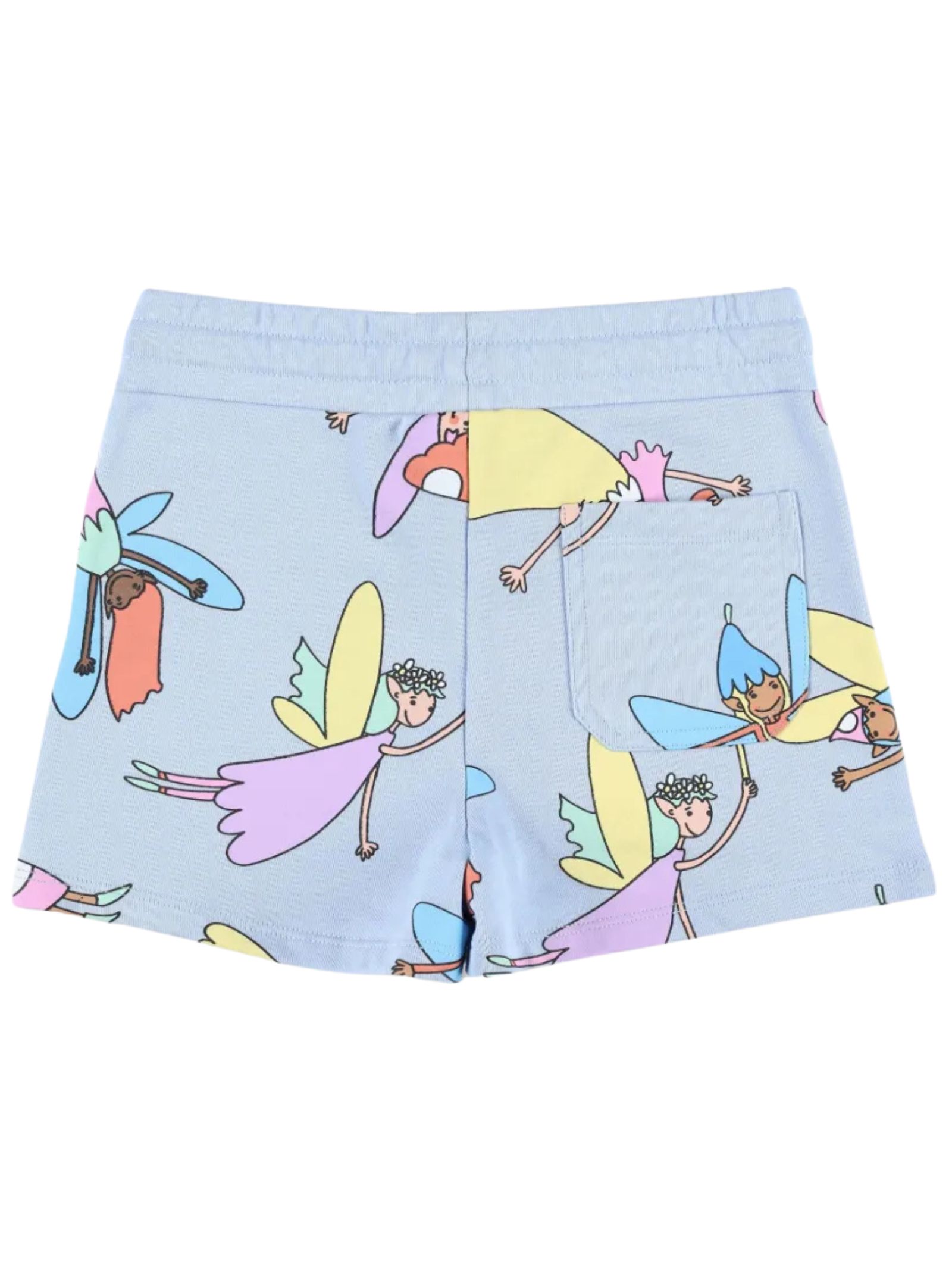 Stella McCartney Kids light blue shorts with a contrasting all-over print, an elasticated drawstring waist, a patch pocket on the back, and a regular fit. Composition: 100% cotton.