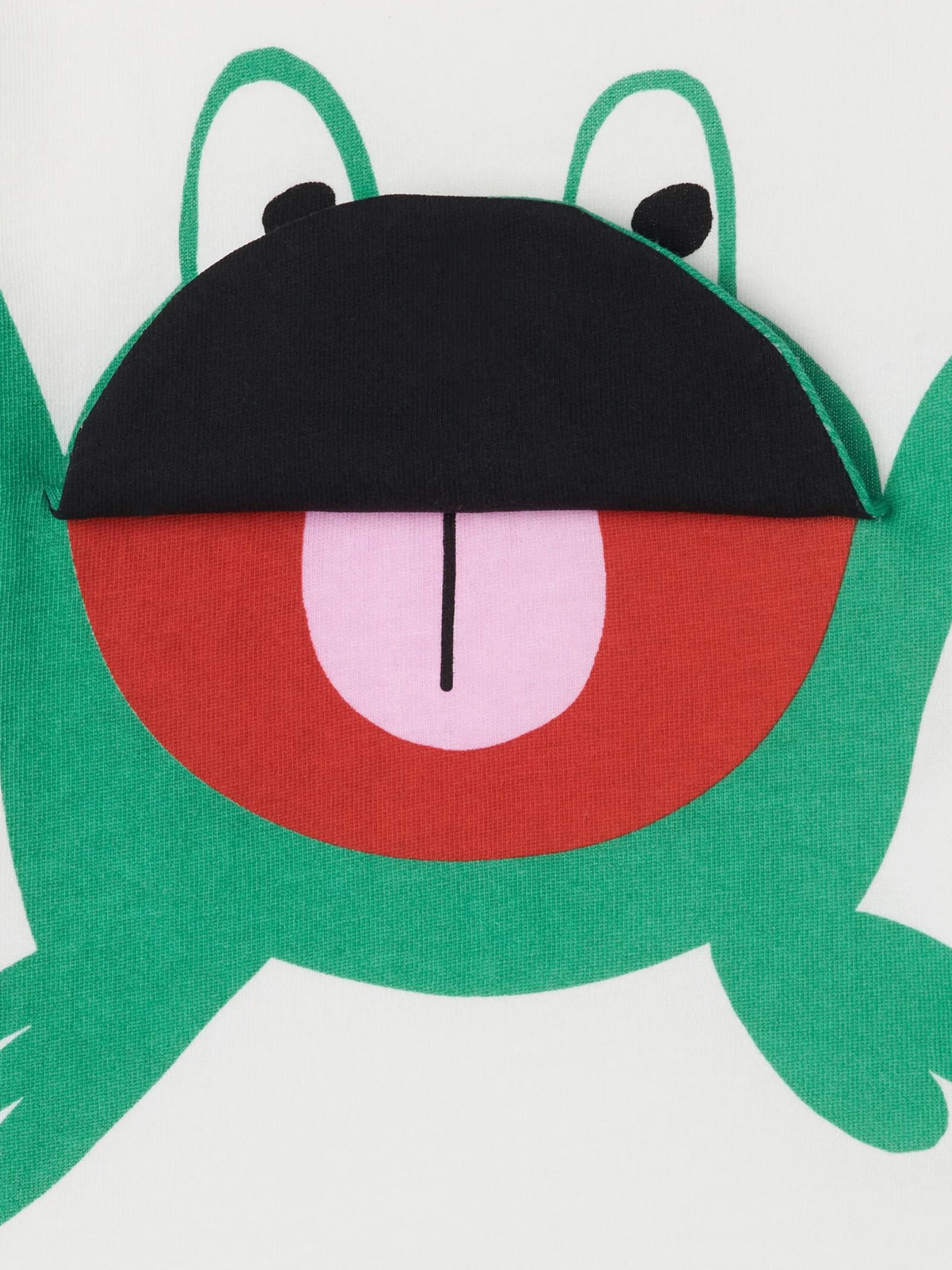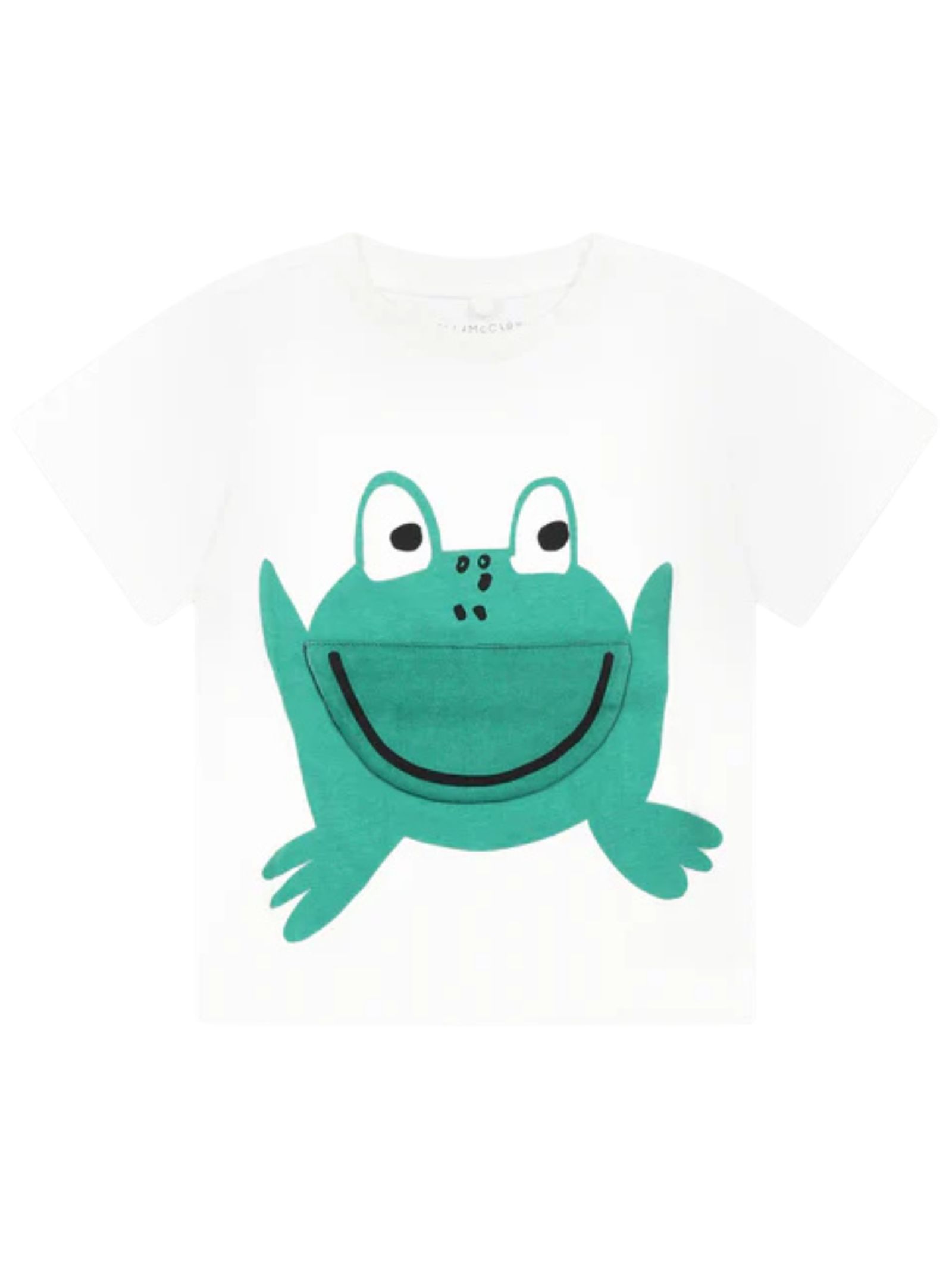 Stella McCartney Kids white T-shirt, crew neck, short sleeves, decorated with a frog print with a mouth that opens on the front, buttons on the shoulder, regular fit. Composition: 100% cotton.