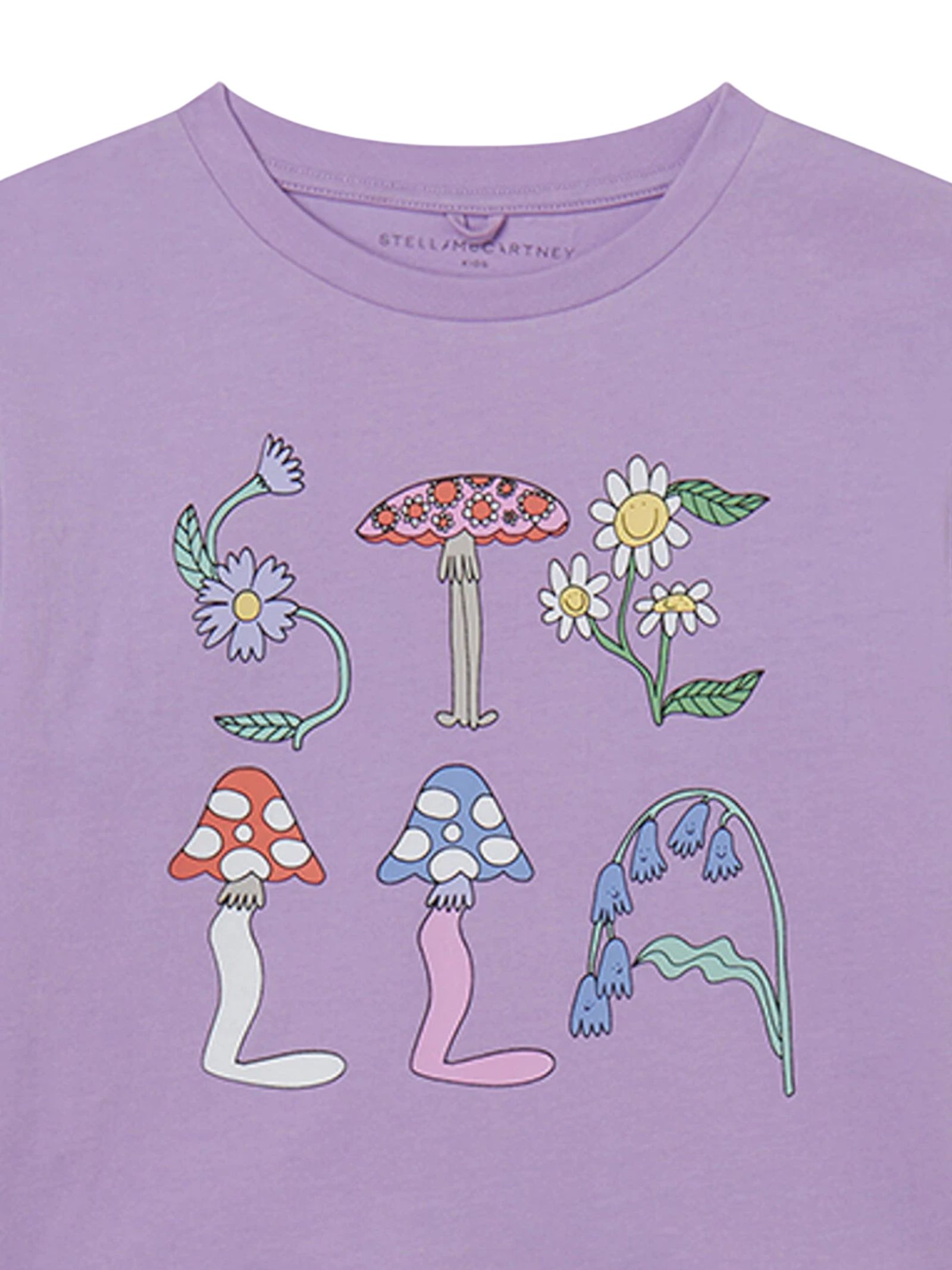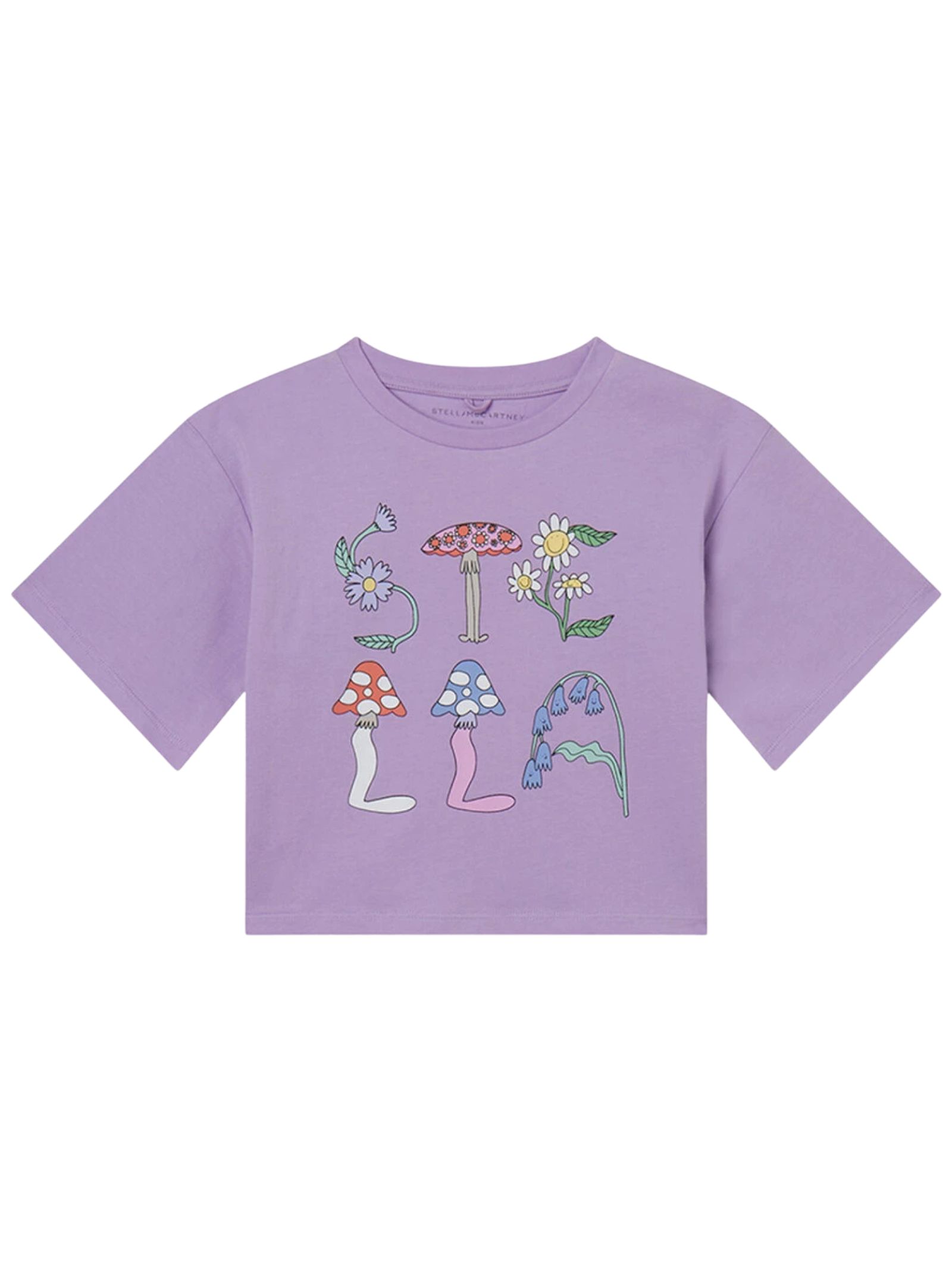 Stella McCartney Kids lilac T-shirt, cropped design, crew neck, short sleeves, contrasting central logo print, loose fit. Composition: 100% cotton.
