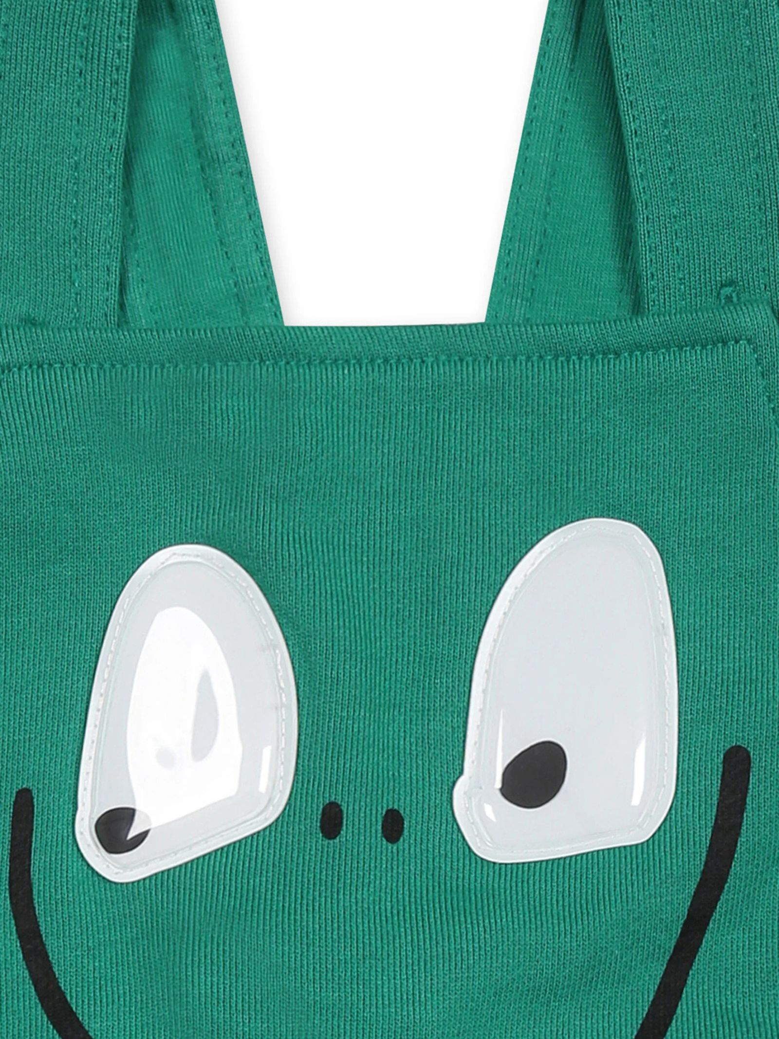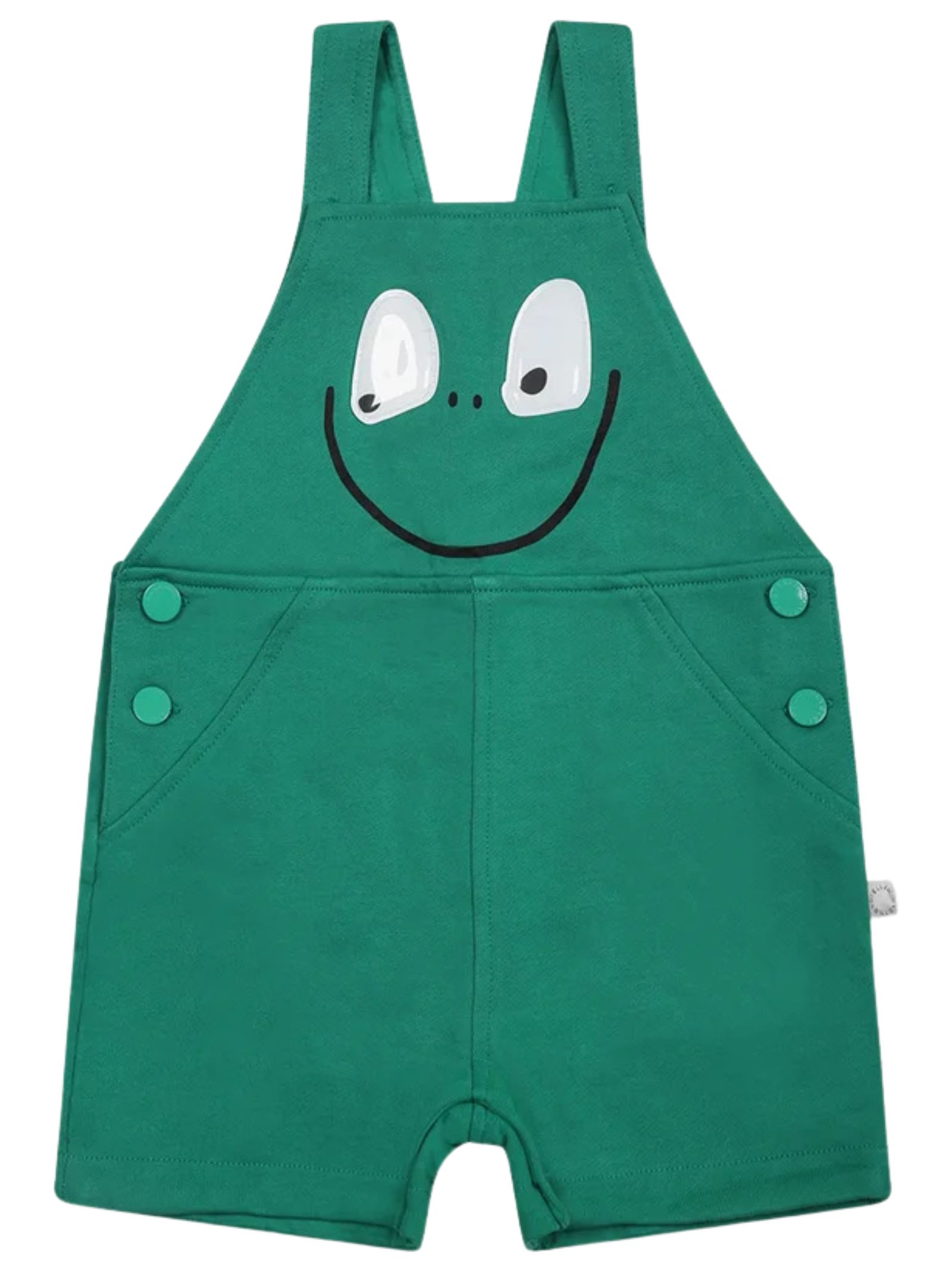Stella McCartney Kids green dungarees with a rolling-eye print, adjustable straps, side buttons, two back pockets, and snap buttons at the crotch. Composition: 100% cotton.
