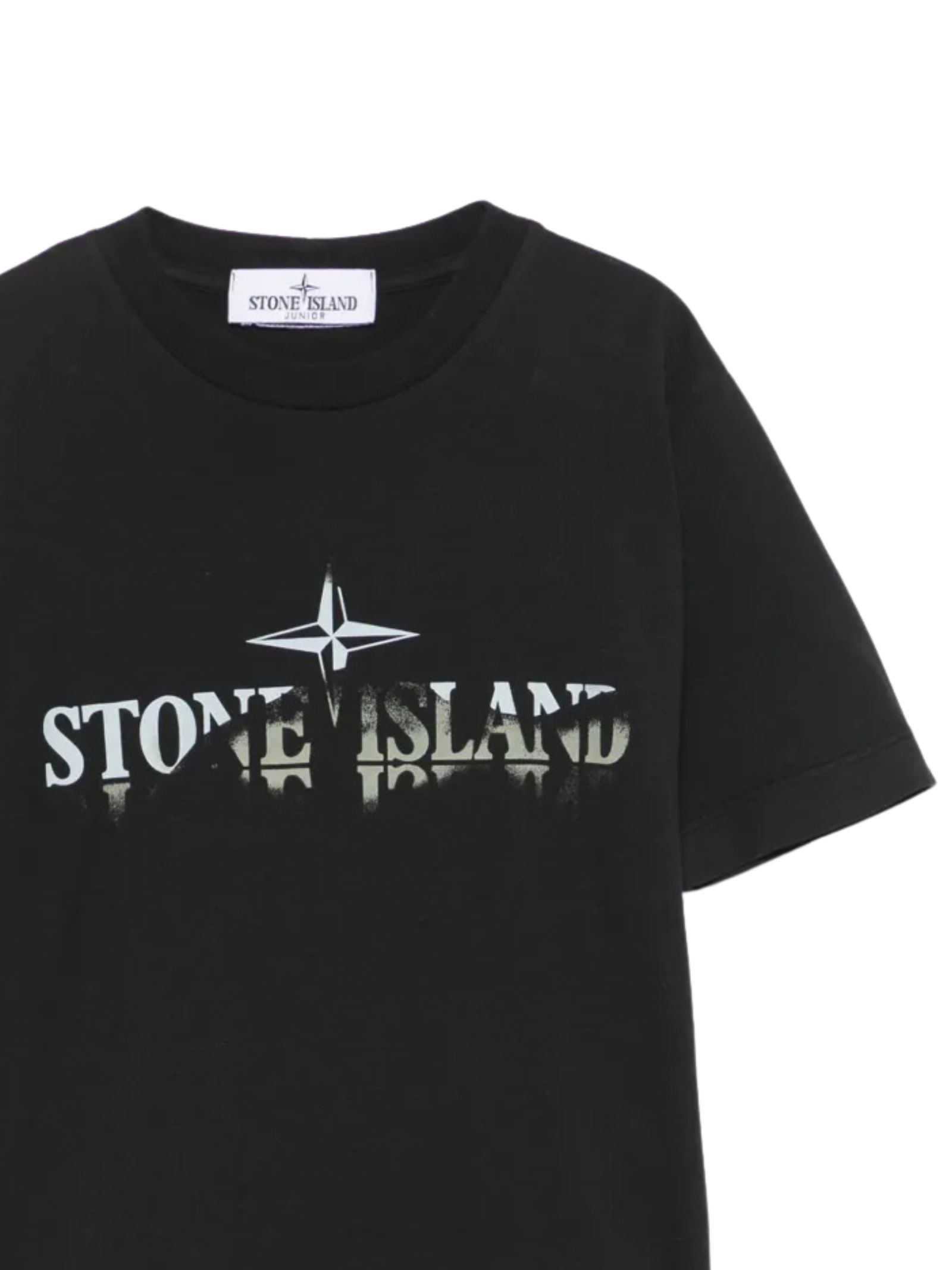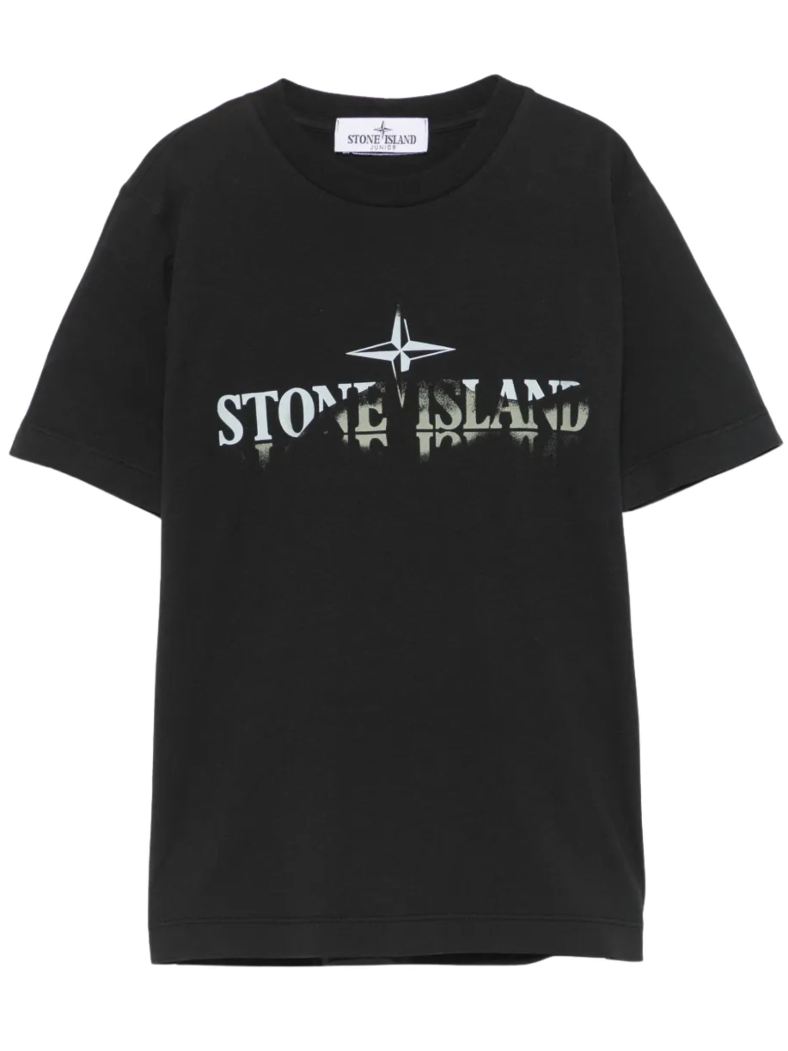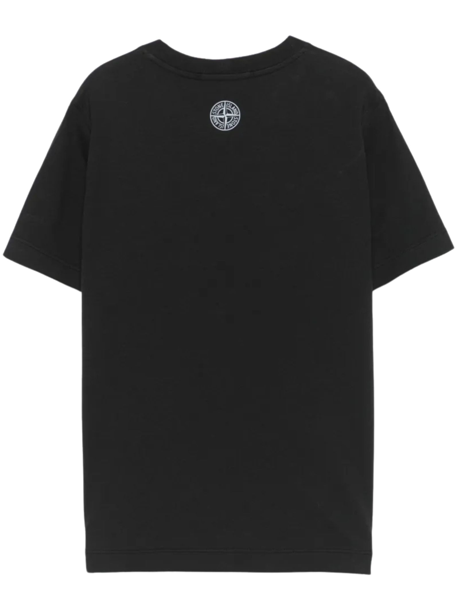 Stone Island Kids black T-shirt, crew neck, short sleeves, featuring a logo print on the back and a contrasting print on the front, straight hem, regular fit. Composition: 100% cotton.