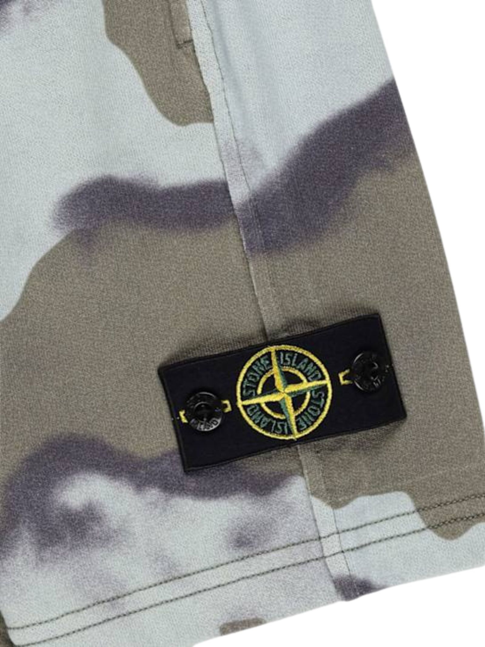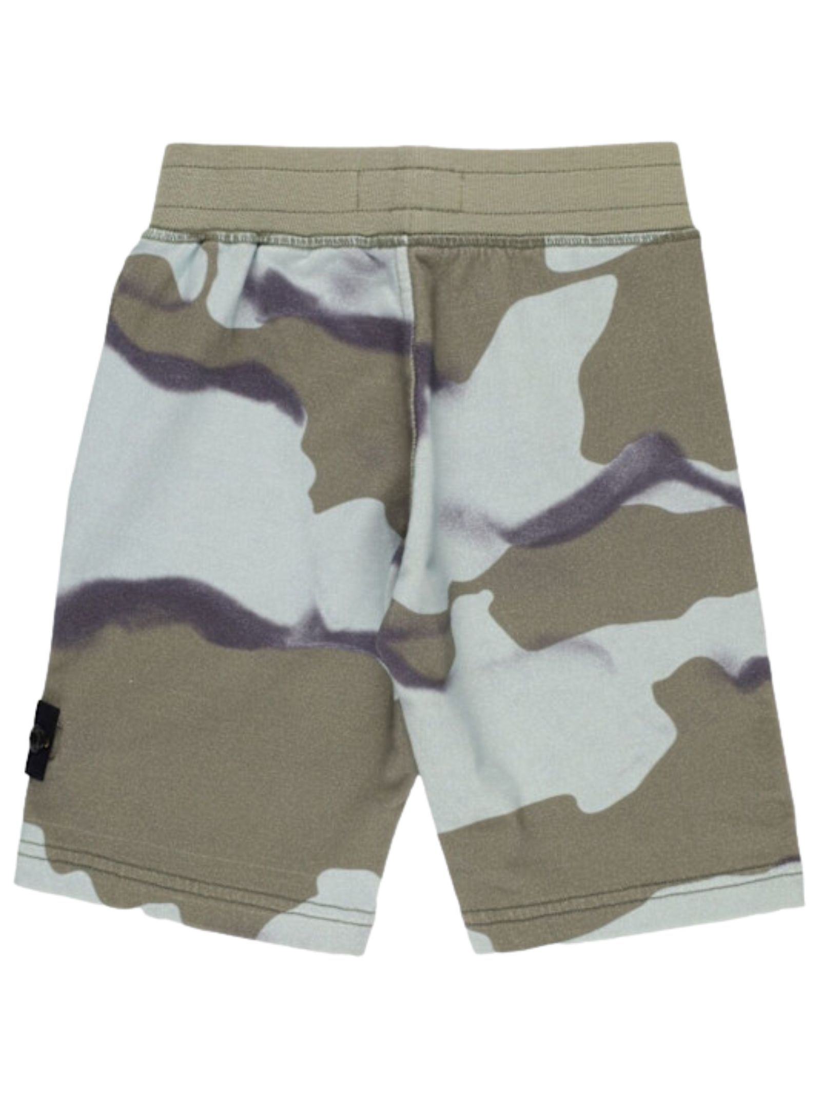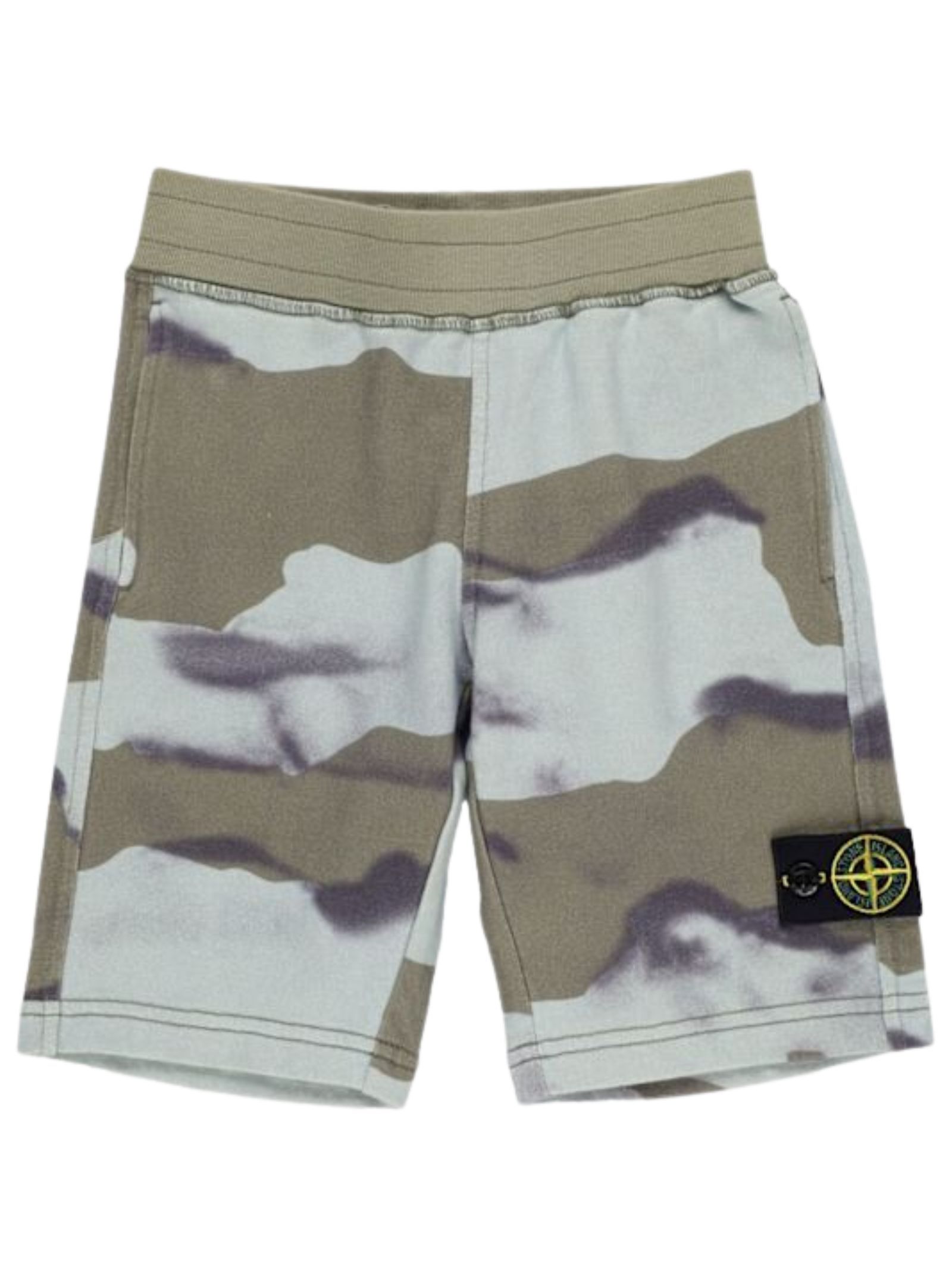 Stone Island Kids camouflage Bermuda shorts with two side pockets, a logo patch, an elastic waistband with an internal drawstring, and a regular fit. Composition: 100% cotton.